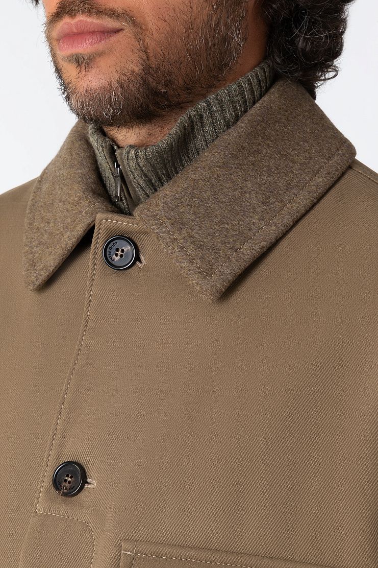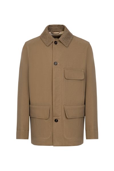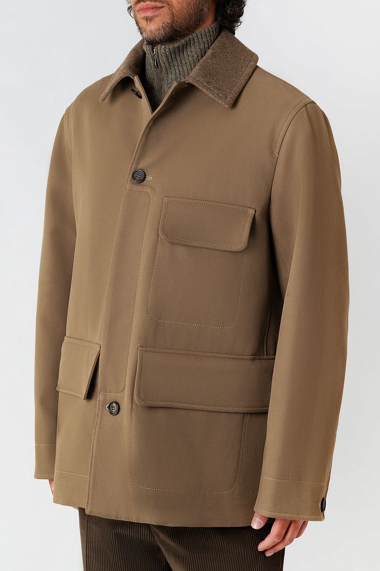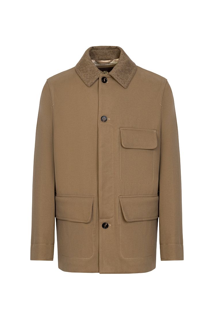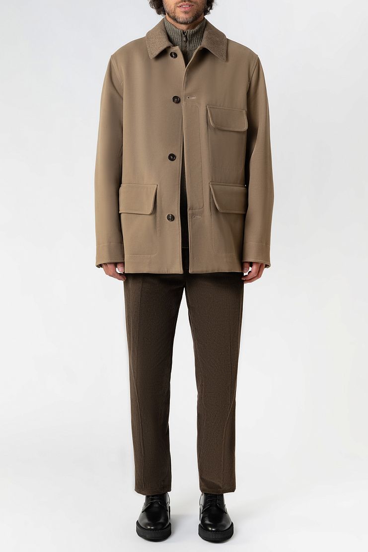 Куртку свободного кроя с крупными прорезными карманами изготовили из плотного хлопка, дополнив отложным воротником из шерсти. Модель с застежкой на пуговицы отлично защитит от холода и ветра, особенно в сочетании с нижним утепляющим слоем.