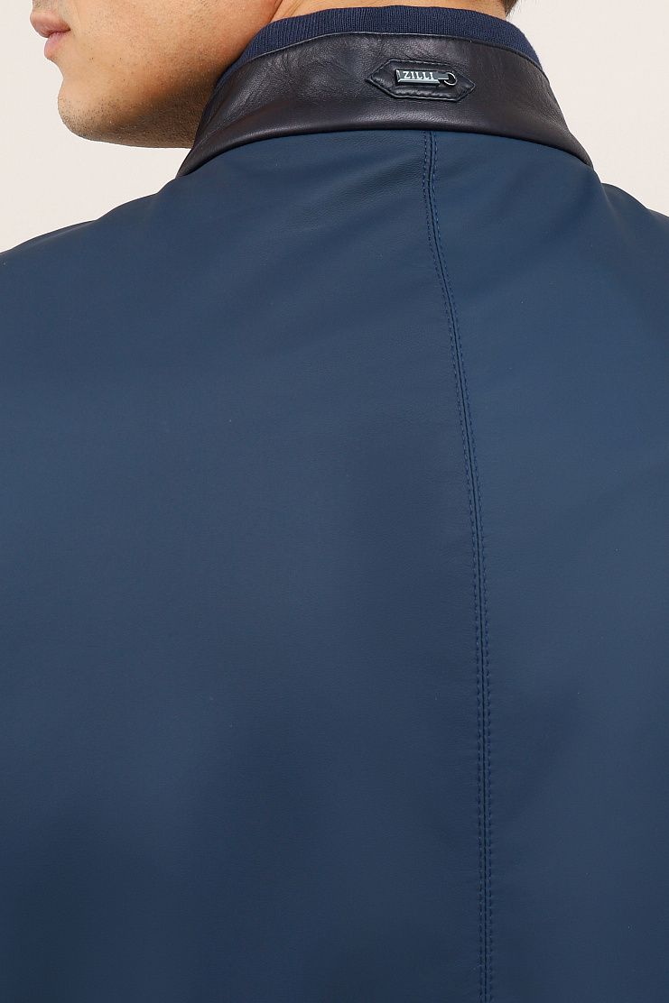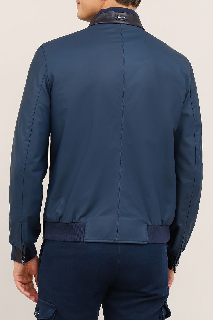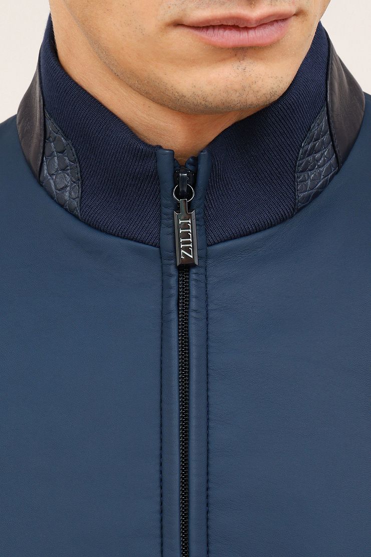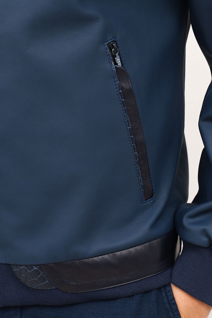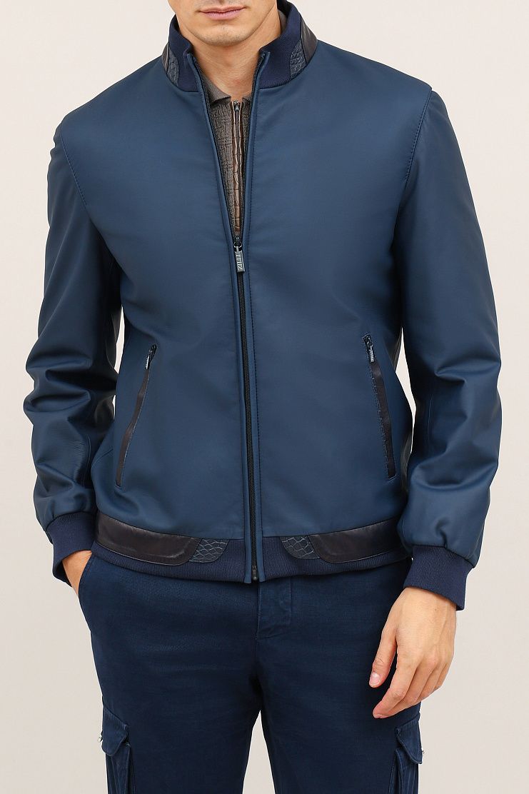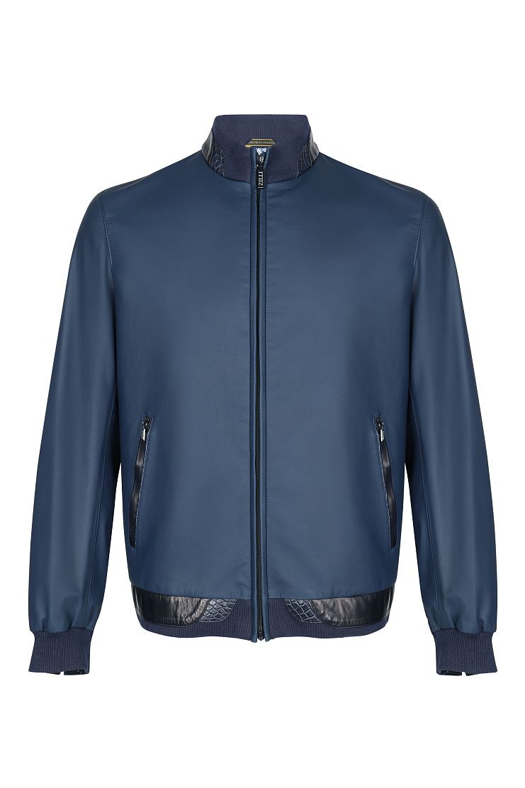 Кожаная куртка с вставками из кожи аллигатора. Модель имеет воротник-стойку, боковые карманы, молнии на рукавах, манжеты и нижний край из трикотажной резинки и застежку на молнию.