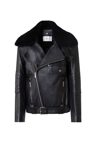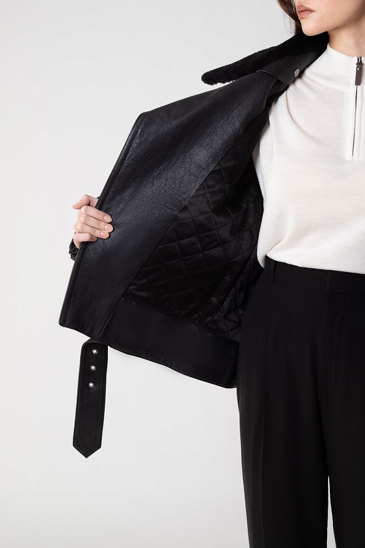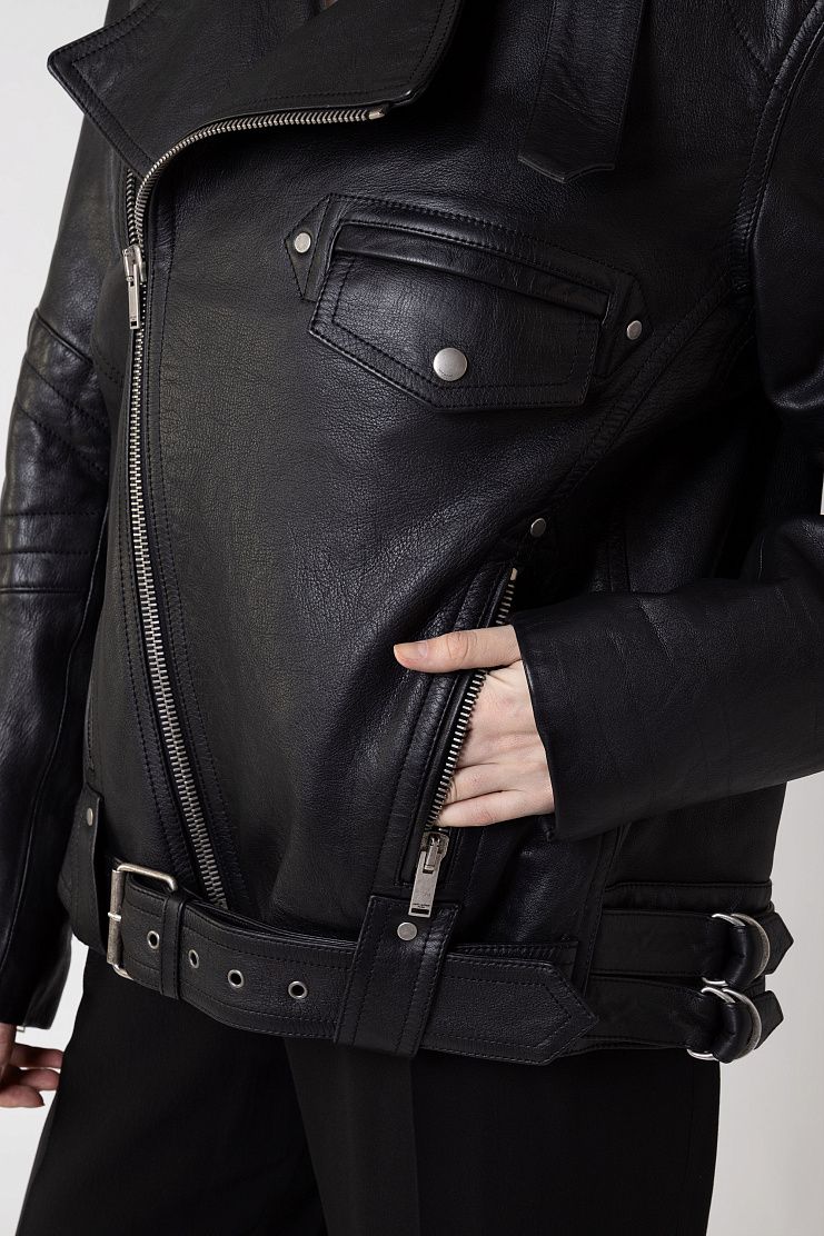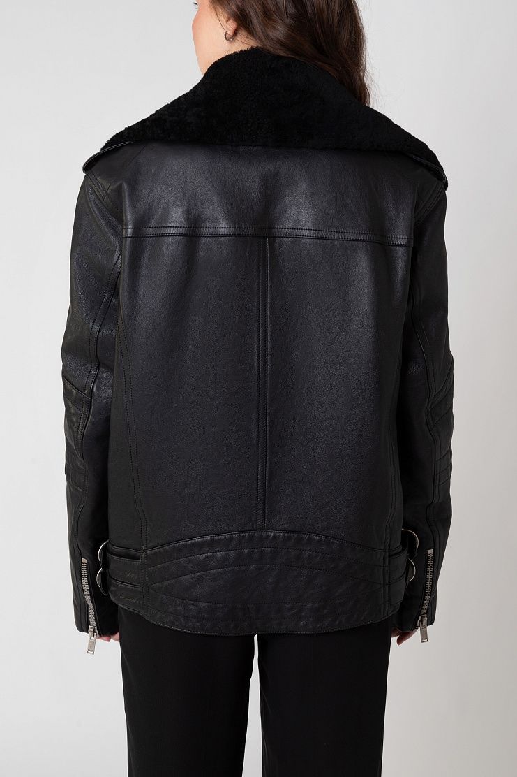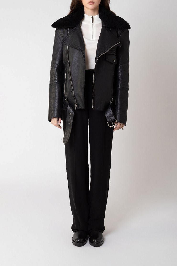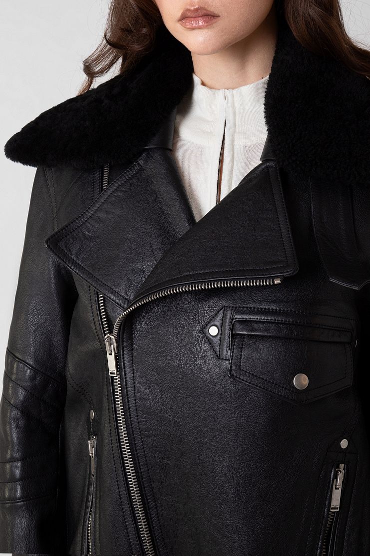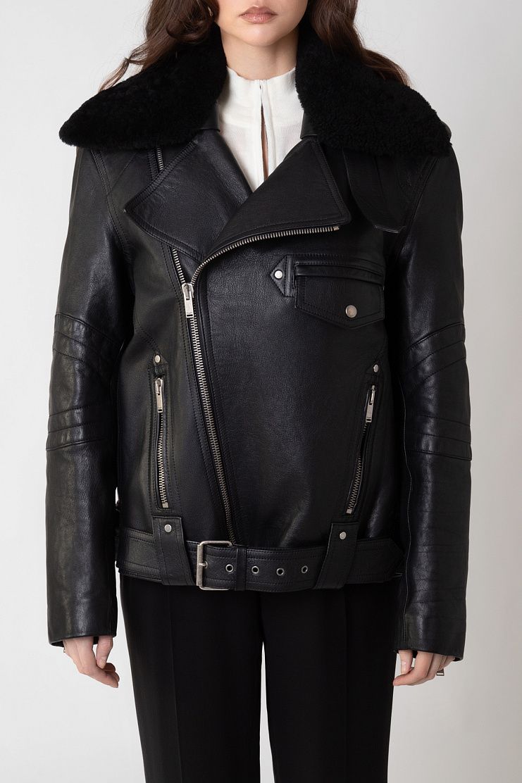 Объемная байкерская куртка выполнена из мягкой телячьей кожи. Для защиты от холода модель дополнена съемным воротником из овчины и стеганой подкладкой. Кроме того, у нее широкие лацканы, пояс, карманы и манжеты на молниях, а также традиционная асимметричная застежка. Куртка станет эффектным завершением повседневного образа с брюками или длинной юбкой.