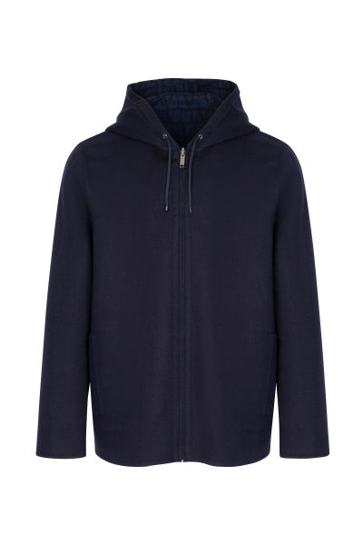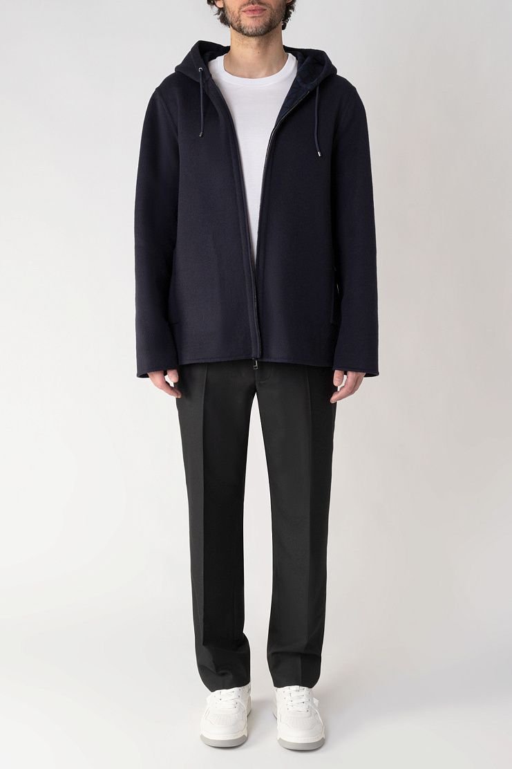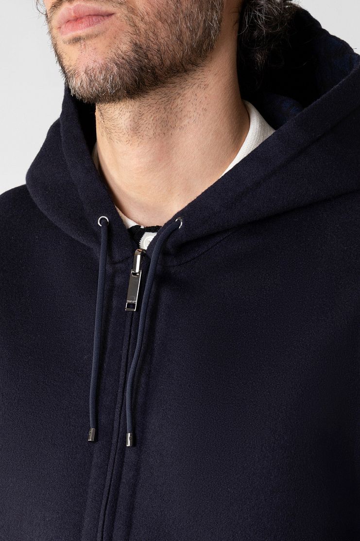 Двустороннюю куртку-толстовку свободного кроя сшили из мягкой шерстяной пряжи с добавлением шелка. С одной стороны модель однотонная, а с другой — украшена фирменным принтом. Куртка с капюшоном, карманами и длинными рукавами застегивается на молнию. Отличный вариант для непринужденных образов с джинсами и кедами.