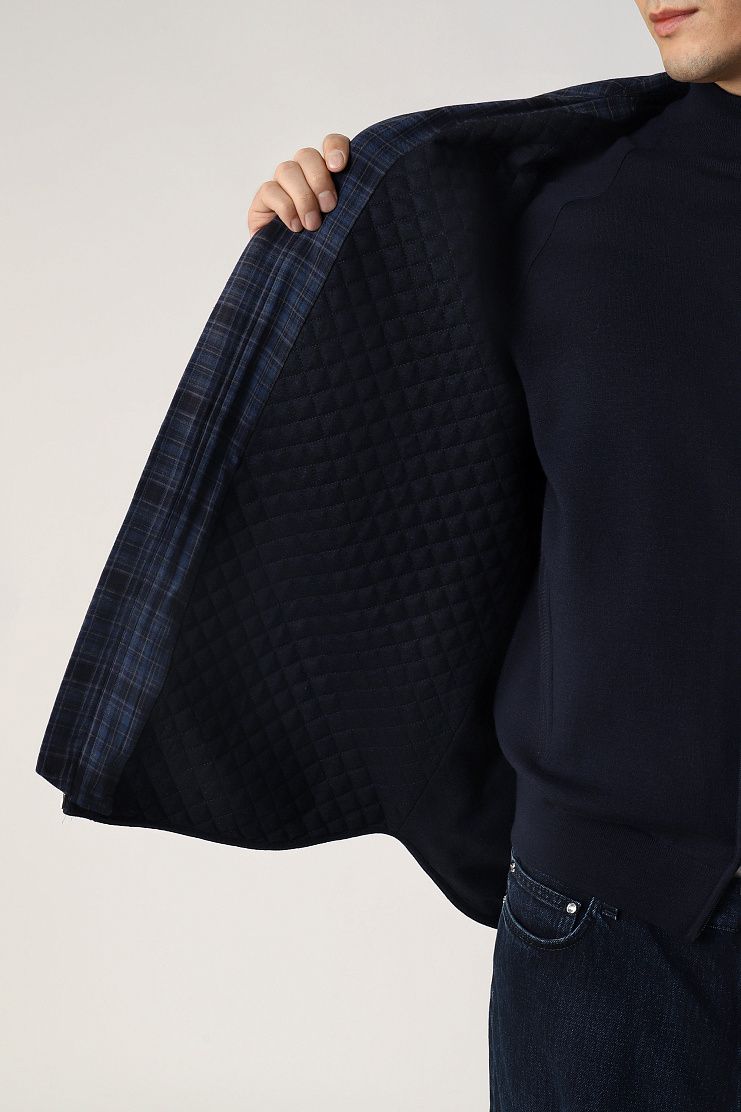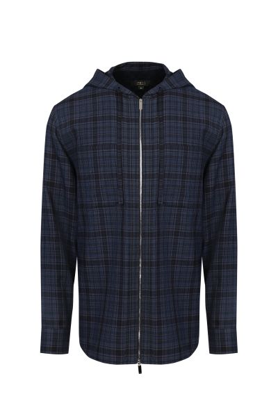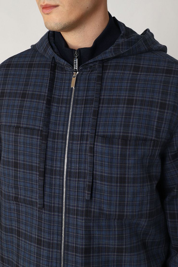 Куртка-рубашка с капюшоном и утепленной стеганой подкладкой выполнена из плотной хлопковой ткани с добавлением кашемира. Модель со спущенной линией плеча дополнена закругленными разрезами по бокам и удлиненной спинкой. Оптимальный вариант для комфортных образов в прохладные дни.