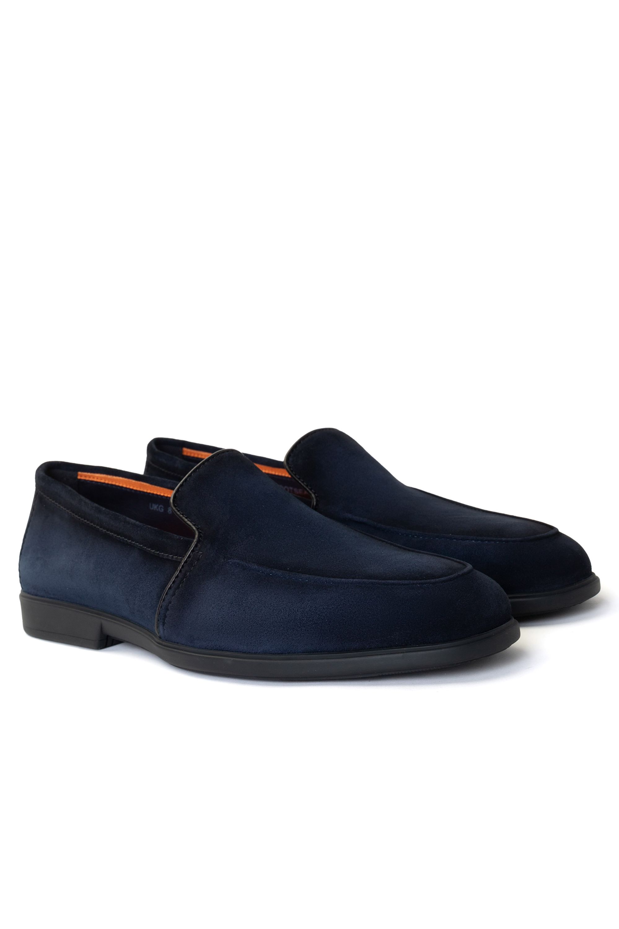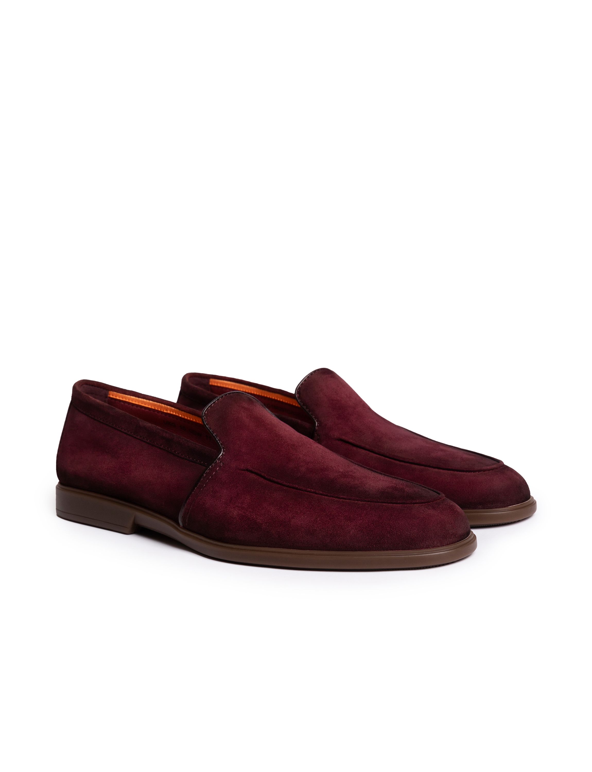 Пенни-лоферы на тонкой подошве сшили из бархатистой замши. Модель с фактурным швом на мысе дополнена перемычкой с фигурной прорезью.