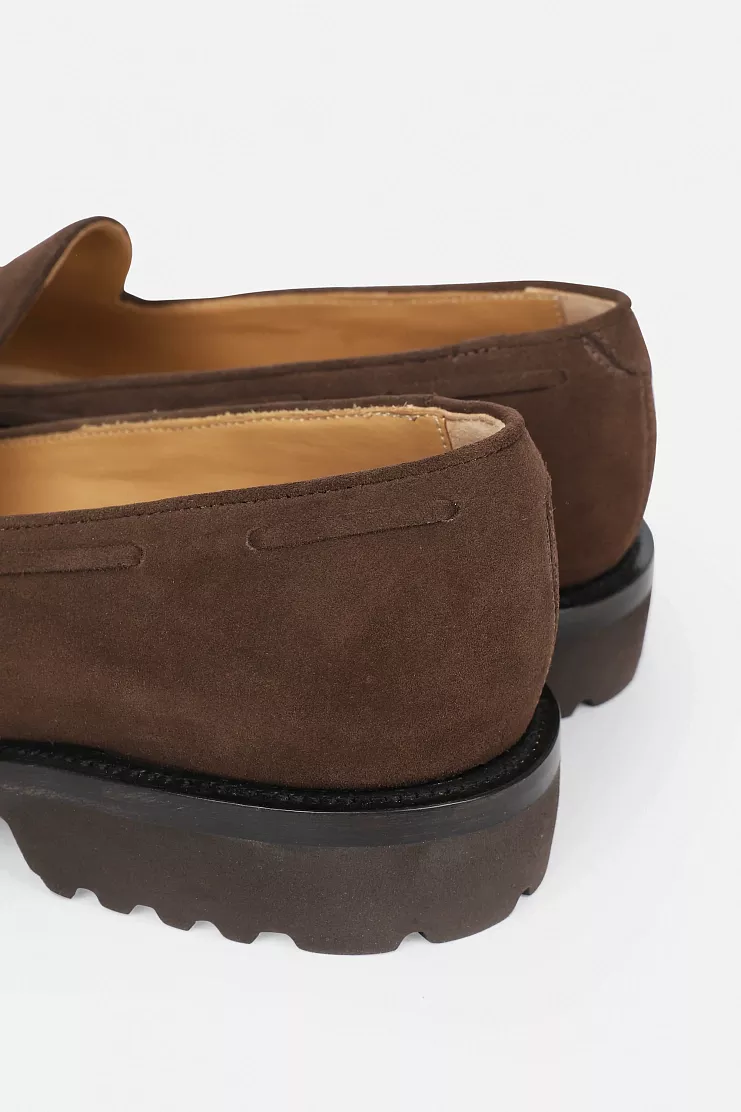 Замшевые лоферы с декоративными строчкой, шнурком и кисточками. Модель выполнена на кожаной подкладке, на толстой протекторной подошве и небольшом каблуке.