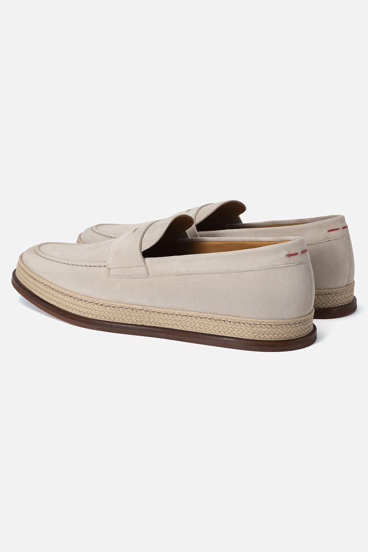 Лоферы с плетеной отделкой, напоминающей эспадрильи, изготовили из бархатистой замши. Пара с фактурным швом на мысе декорирована перемычкой с фигурным вырезом и фирменными красными стежками на заднике. Благодаря подкладке из дышащей натуральной кожи в обуви будет комфортно в течение дня.