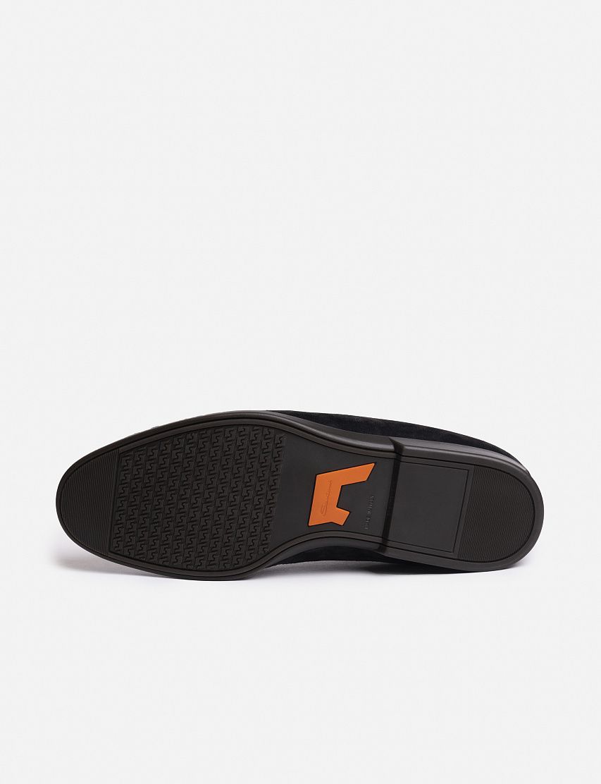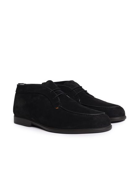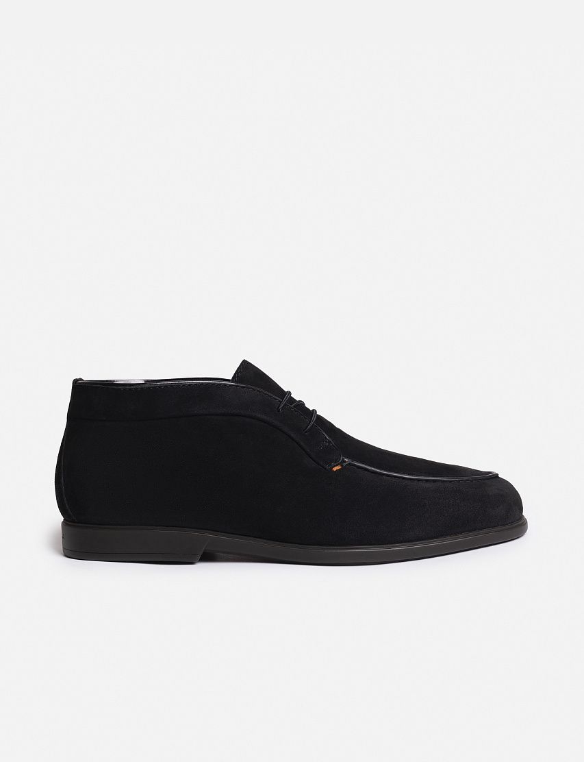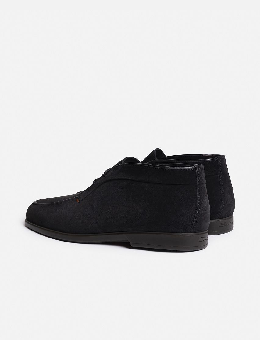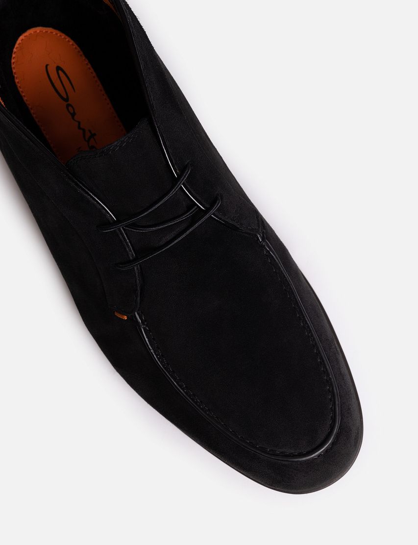 Ботинки на резиновой подошве с широким каблуком выполнили из мягкой замши с бархатистой фактурой. Пара дополнена шнуровкой, тонким швом на мысе, а также кантом из глянцевой кожи, окрашенном в фирменной технике velatura. Небольшой стежок оттенка Arancio Santoni подчеркивает принадлежность к бренду.