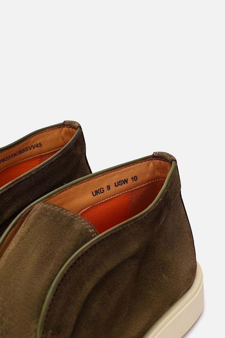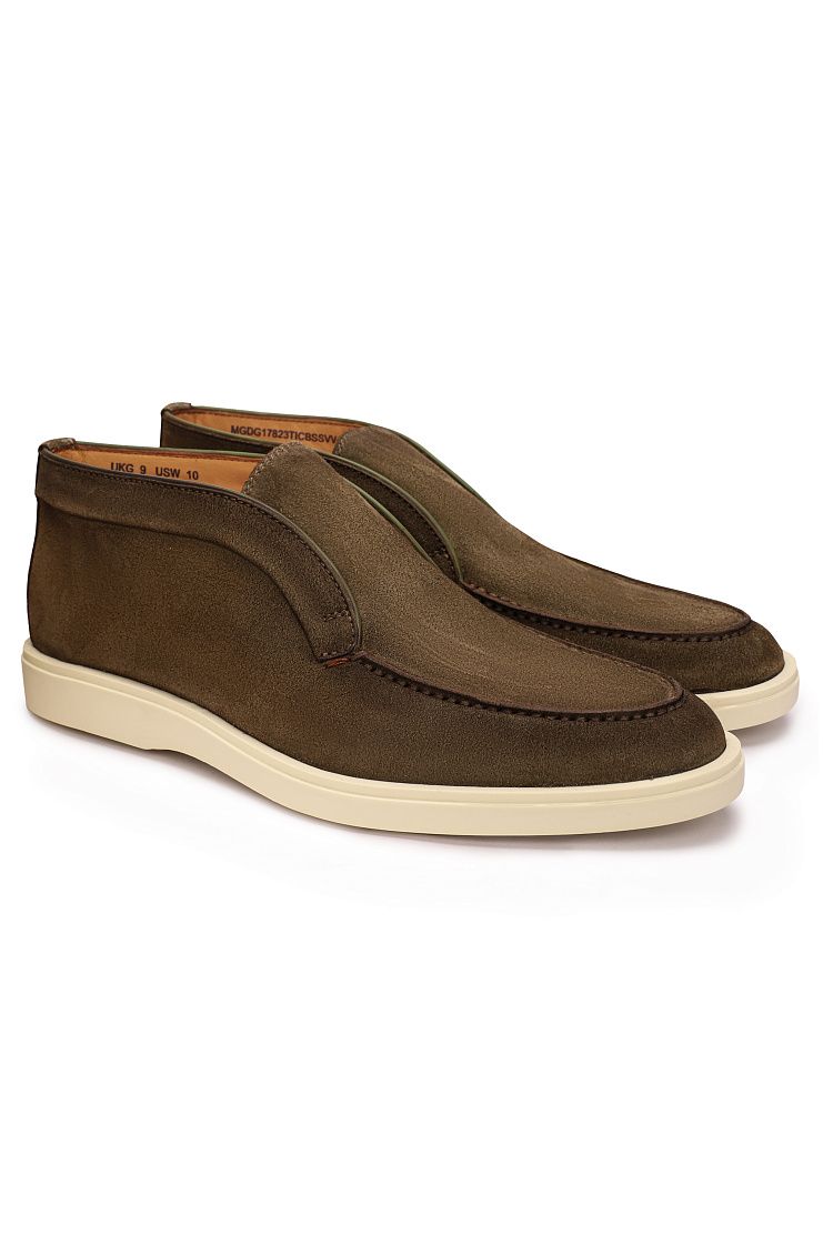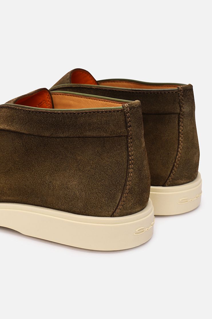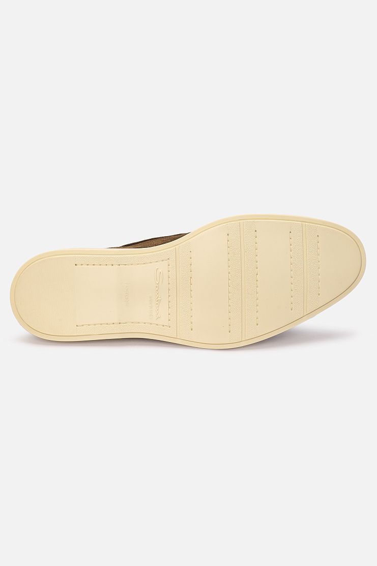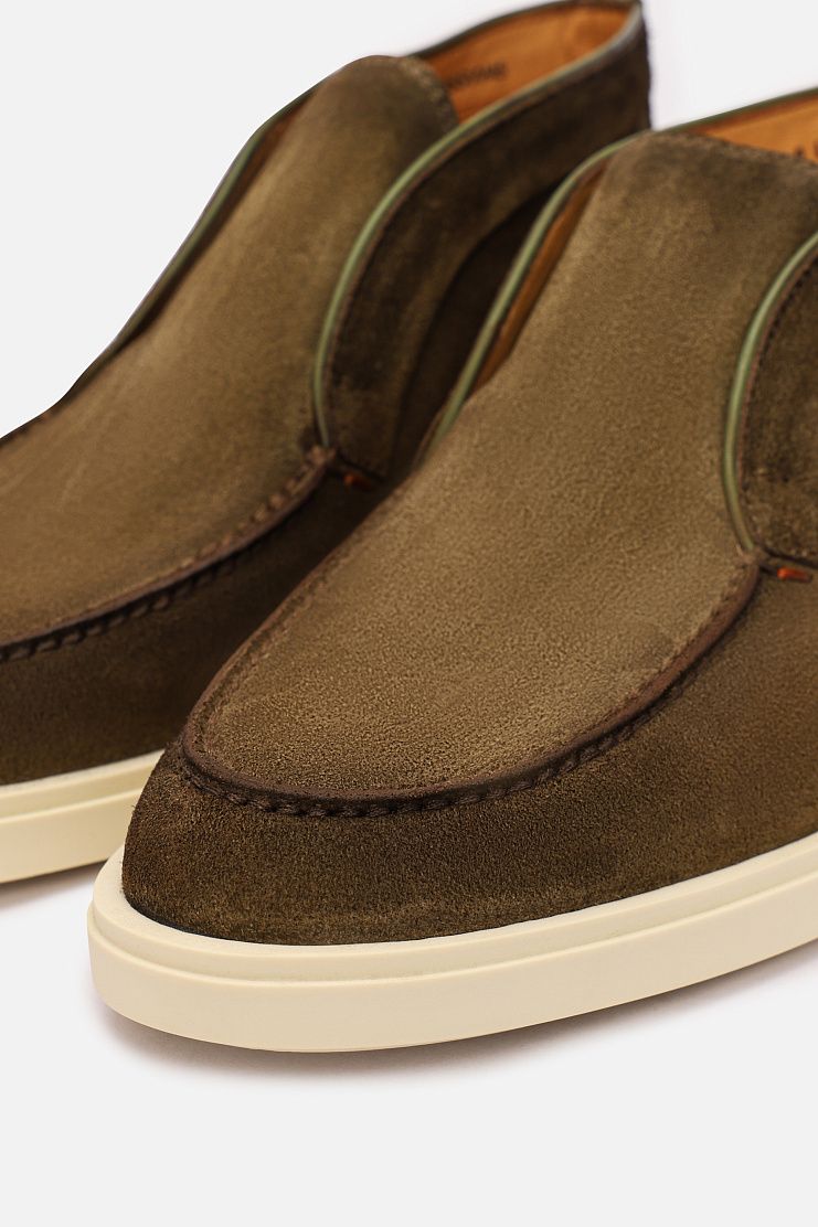 Лоферы на гибкой резиновой подошве выполнили из бархатистой пластичной замши. Пару с рельефным швом на мысе дополнили узким кожаным кантом.