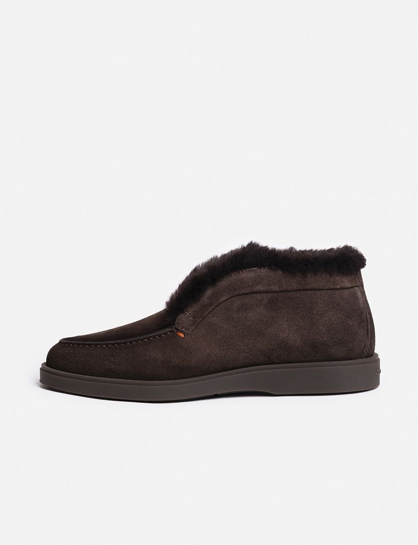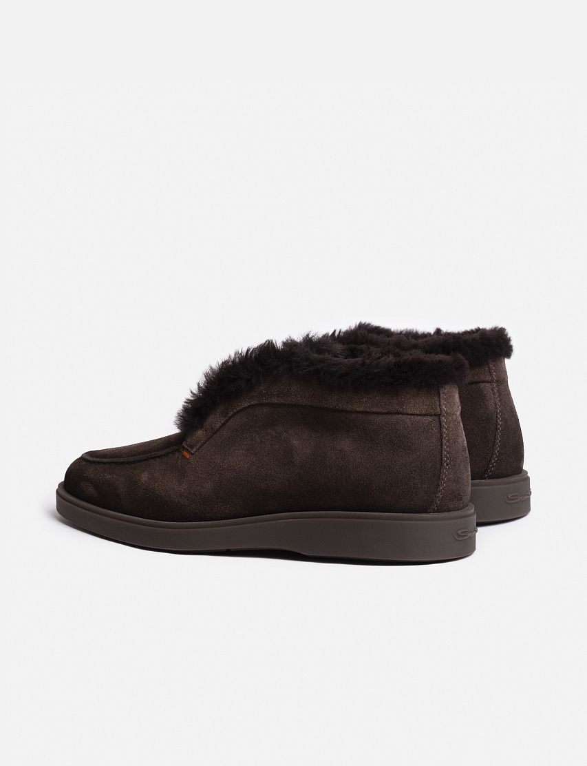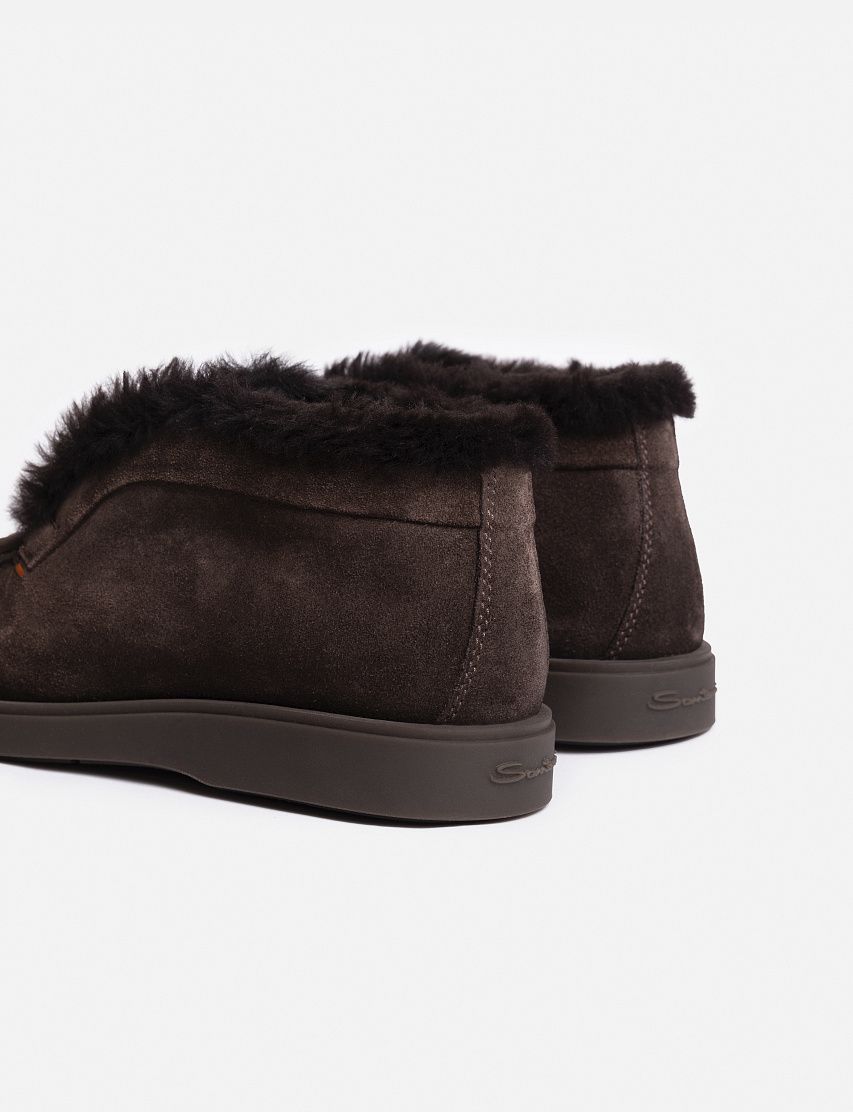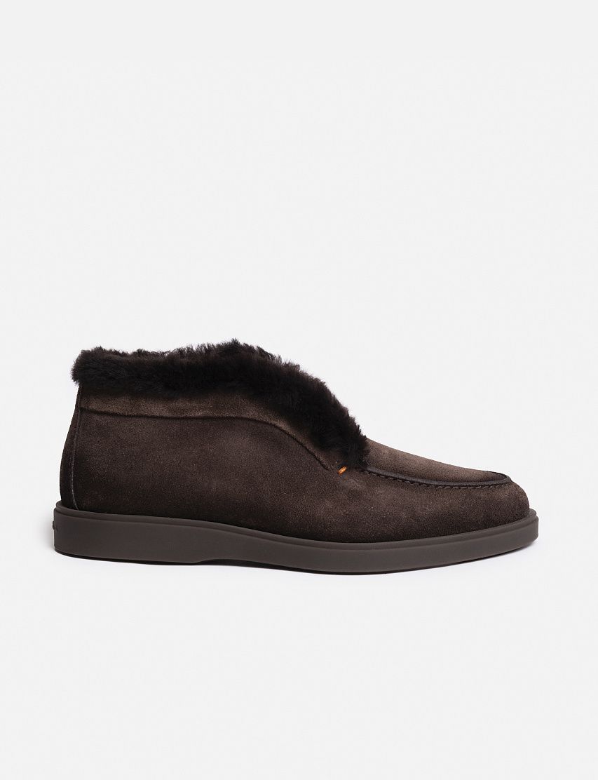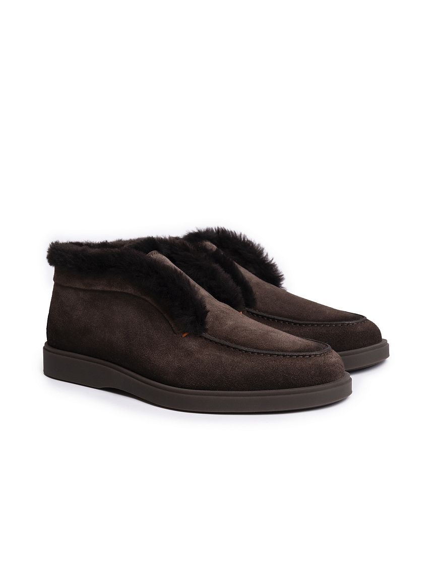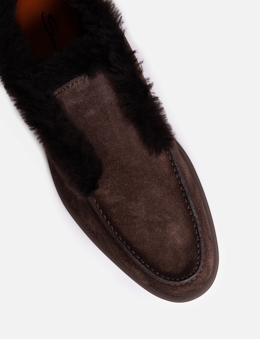 Утепленные лоферы из бархатистой замши — комфортный вариант для зимних прогулок. Модель на гибкой резиновой подошве дополнена опушкой и внутренней отделкой из мягкой овчины с густым ворсом. Стежок фирменного оттенка Arancio Santoni подчеркивает принадлежность к бренду.