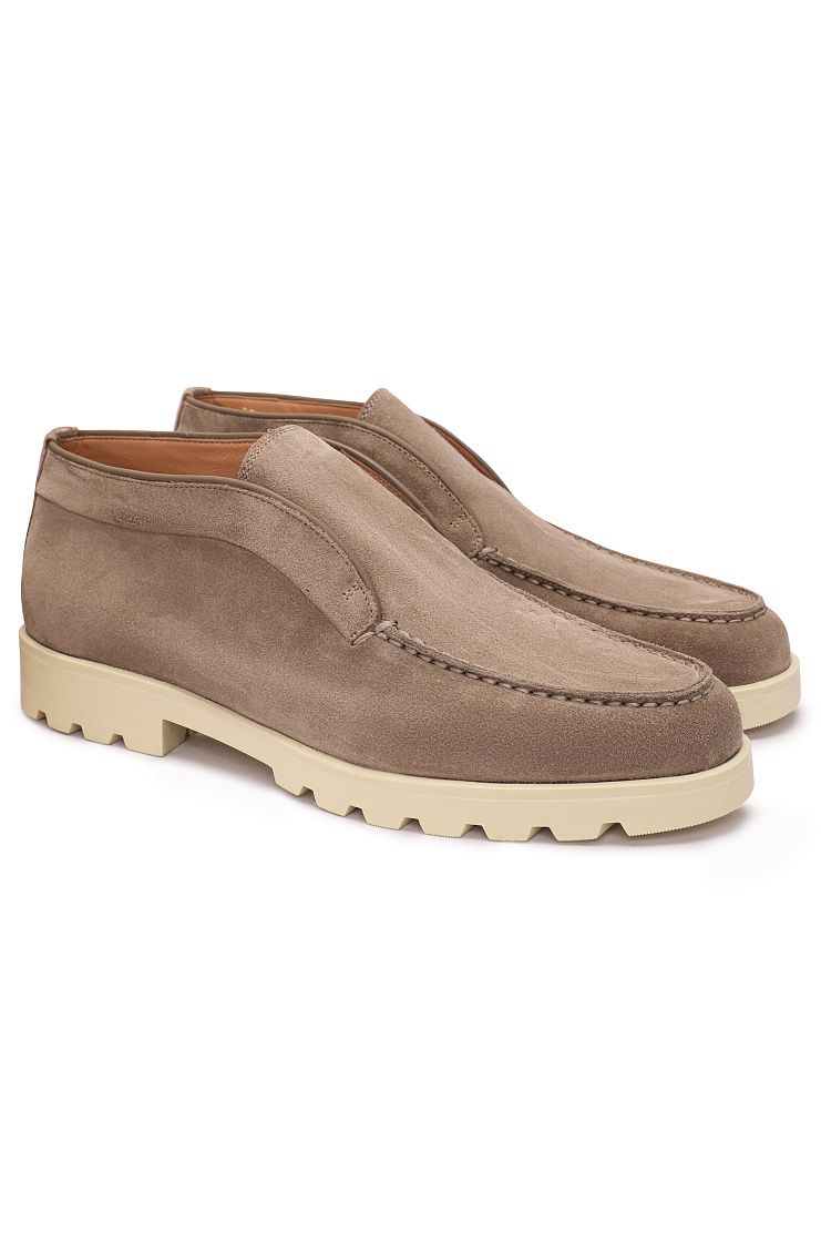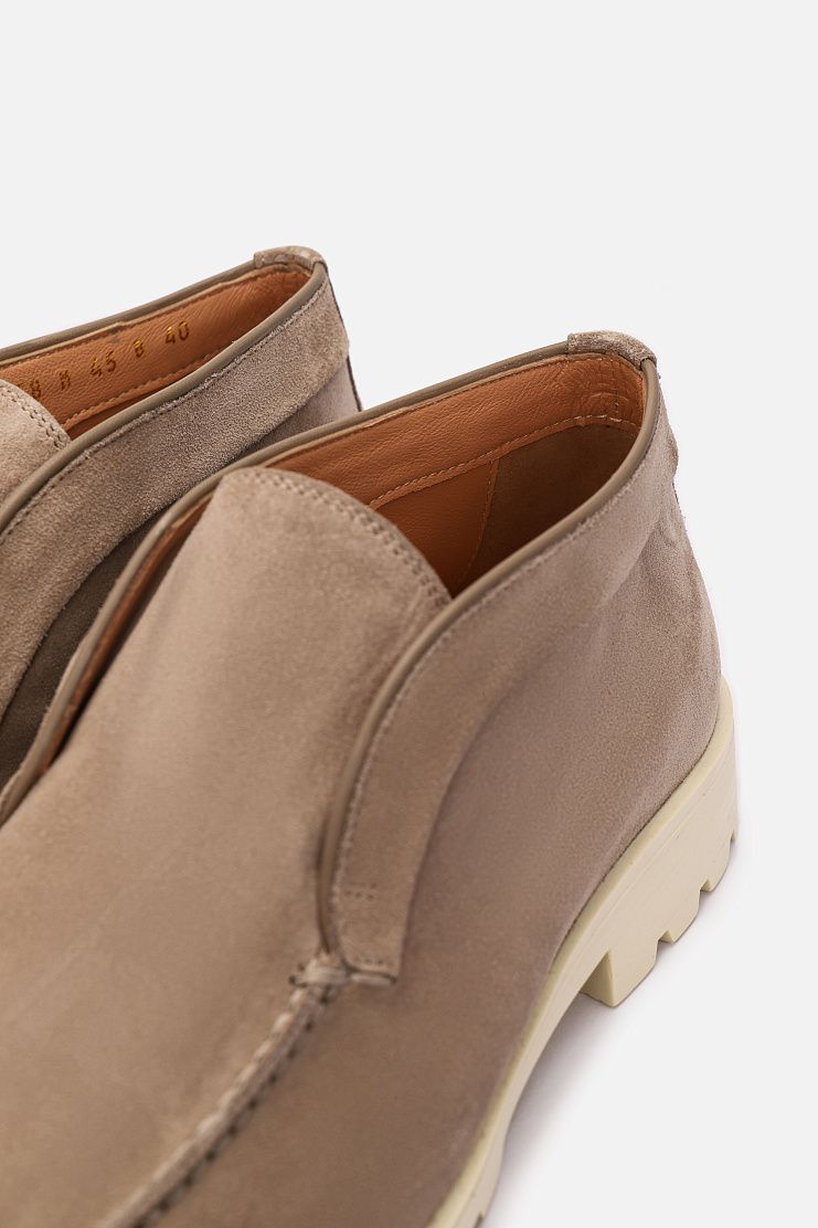 Ботинки с рельефным швом на мысе выполнили из замши с бархатистой фактурой. Пару утеплили мягкой и теплой овчиной и дополнили гибкой резиновой подошвой с протектором.