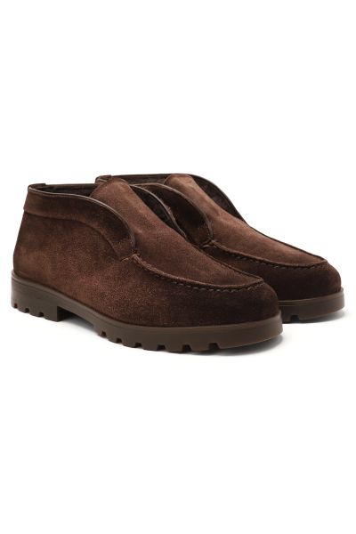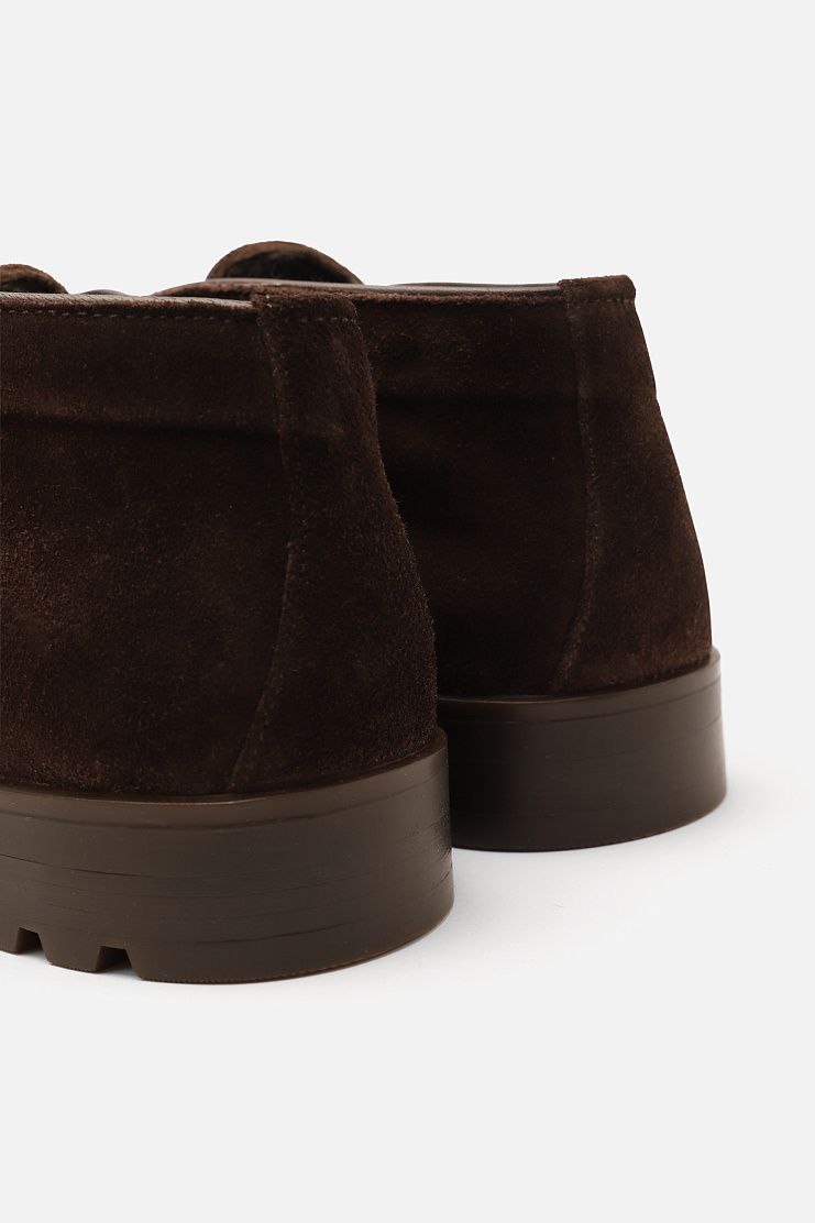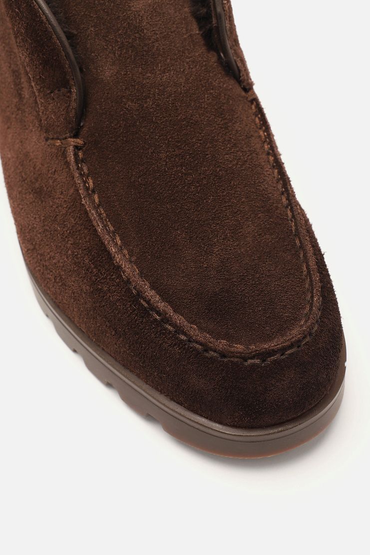 Лоферы с рельефным швом на мысе выполнили из пластичной замши с бархатистой фактурой. Внутри пару утеплили мягкой овчиной с густым ворсом. Резиновая подошва с глубоким протектором помогает избежать скольжения.