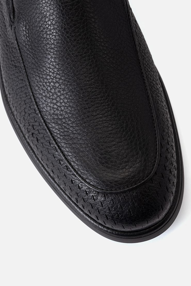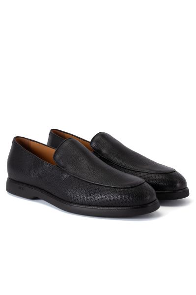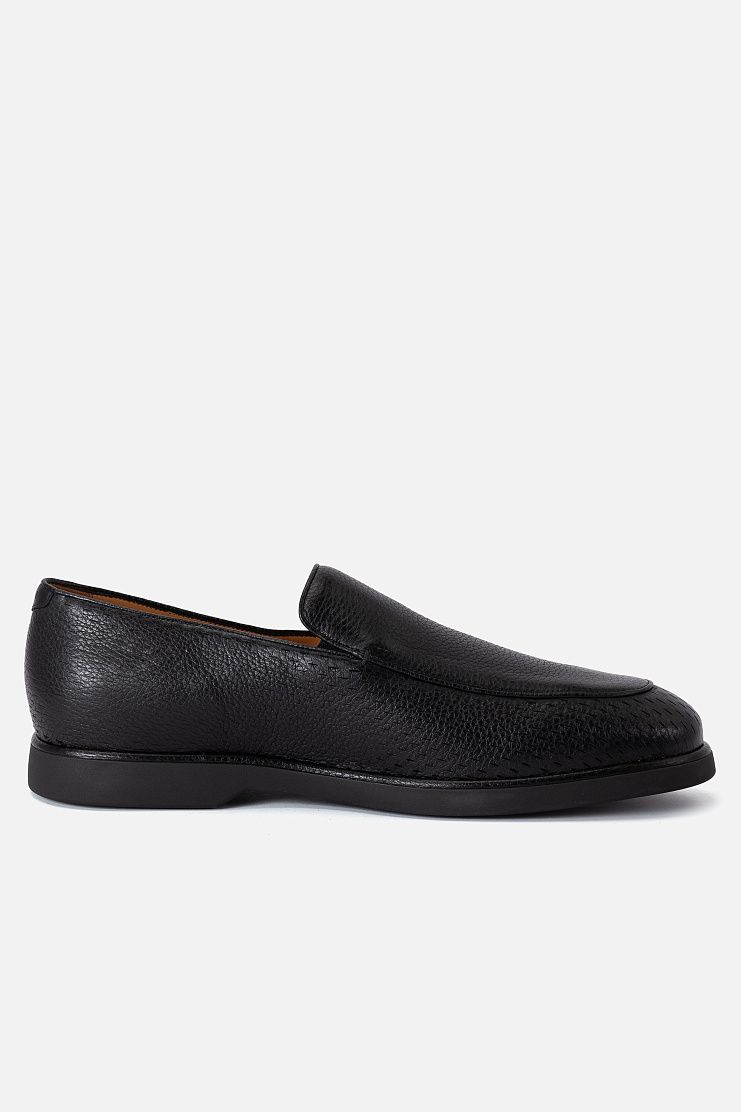 Лоферы с фактурным швом изготовили из крупнозернистой оленьей кожи с перфорацией на мысе, боковых частях и заднике. Литая полимерная подошва украшена тисненым фирменным логотипом.