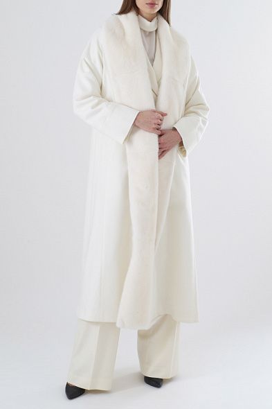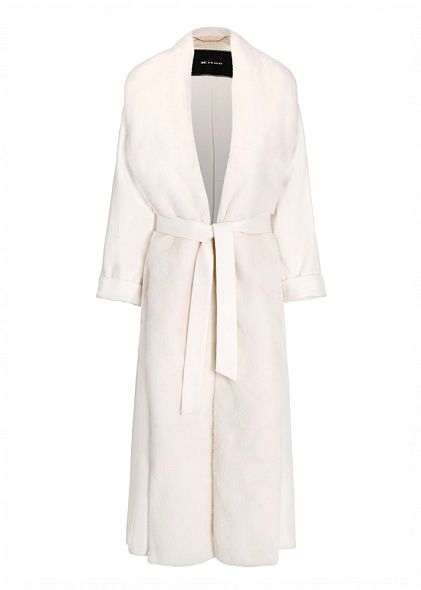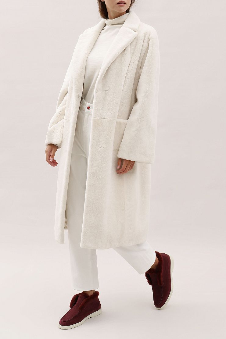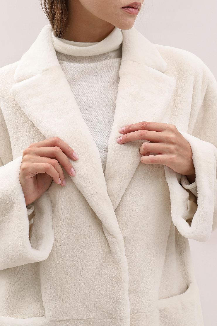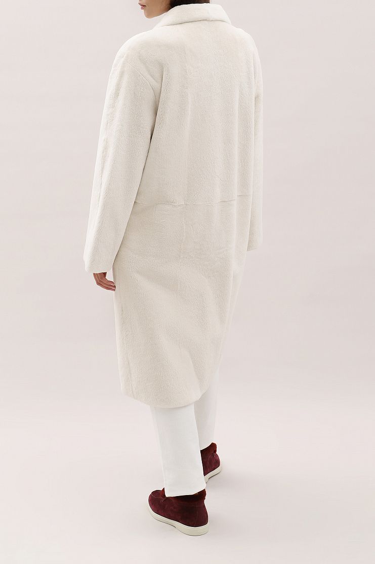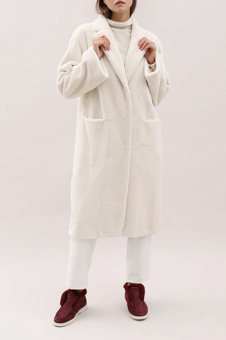 Меховое пальто с боковыми накладными карманами. Модель свободного кроя имеет V-образный вырез и застежку на пуговицу.