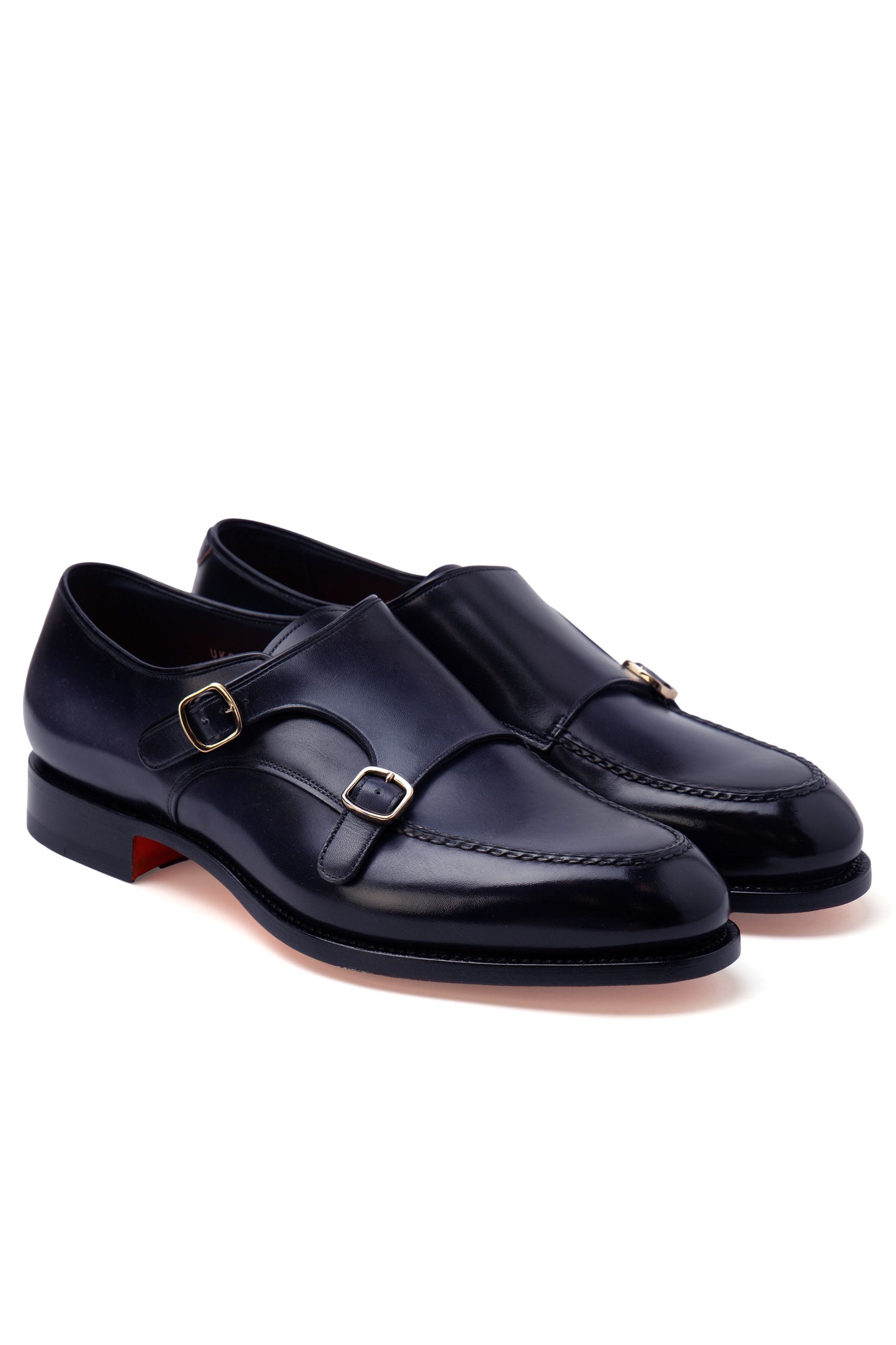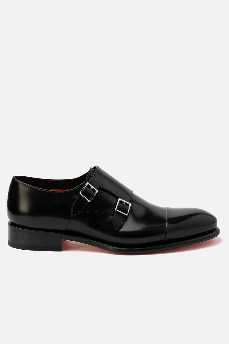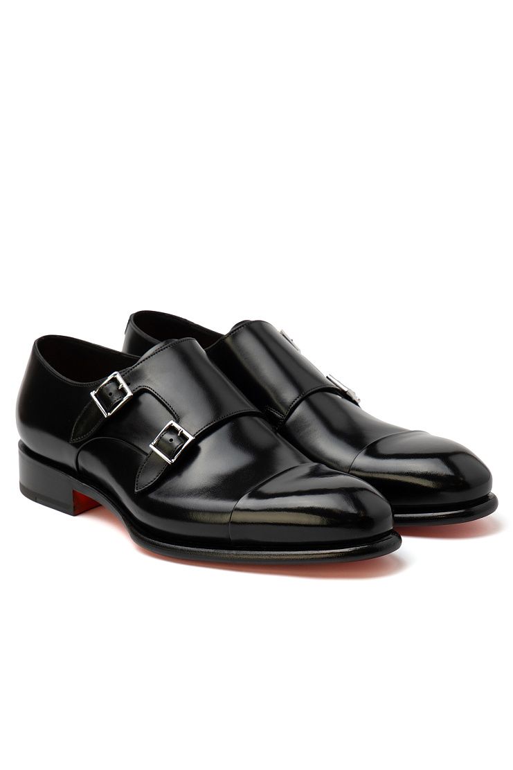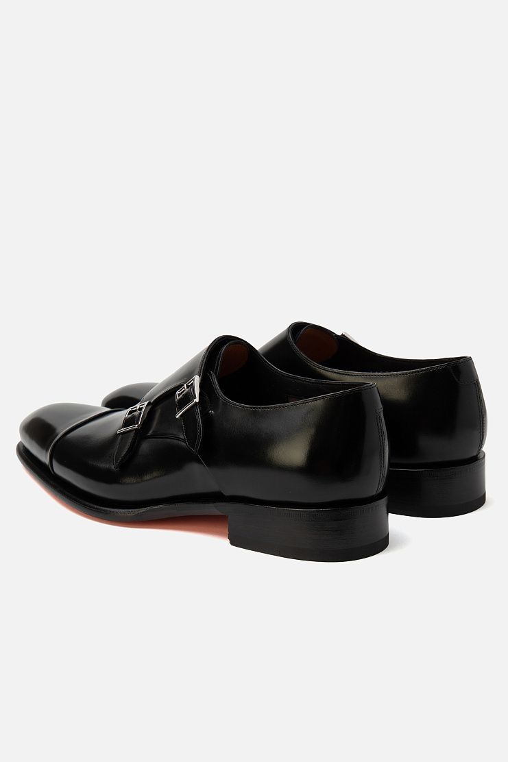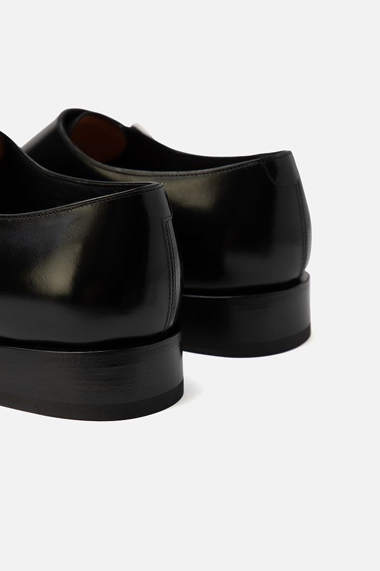 Туфли с двойными ремешками выполнили из мягкой телячьей кожи: основную часть — из мягкой матовой, а отрезной нос — из отполированной глянцевой.