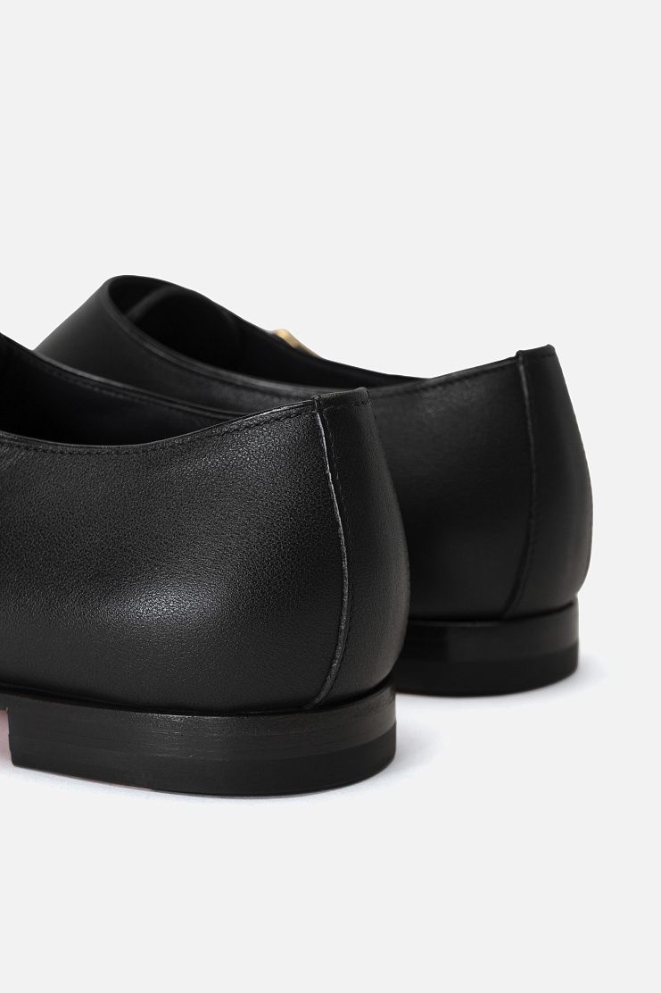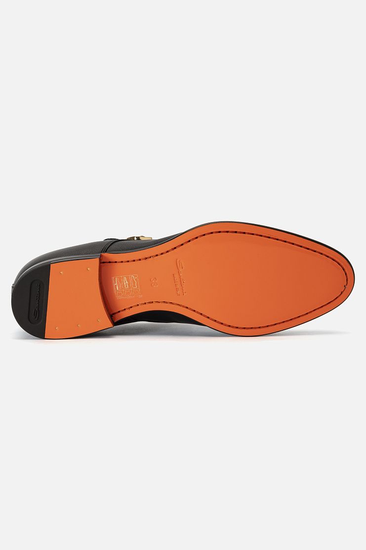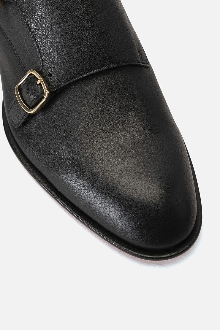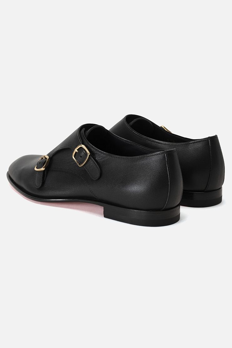 Монки с миндалевидным носком изготовили из гладкой телячьей кожи с деликатным блеском. Модель дополнена кожаными стельками и небольшим каблуком. Особенность дизайна — застежка на два ремешка с золотистыми пряжками. Удачный вариант для образа в стиле casual.