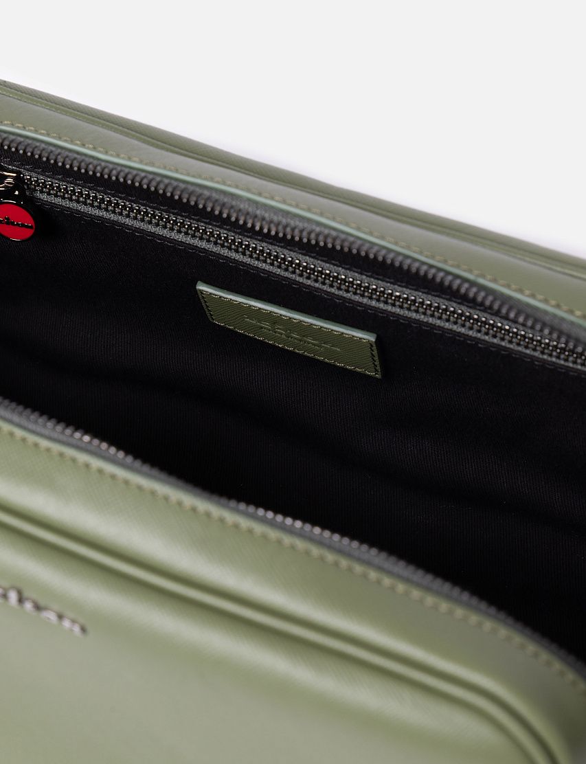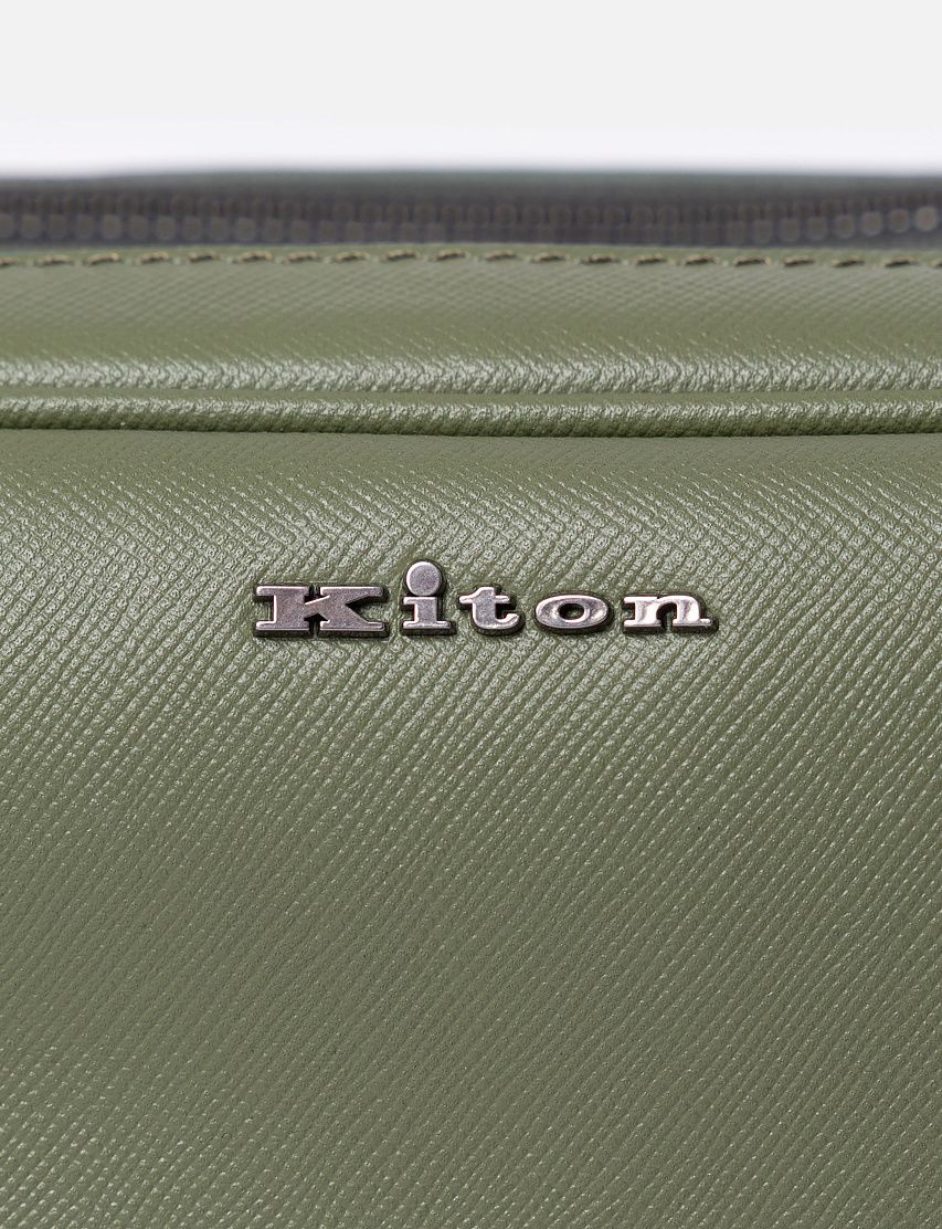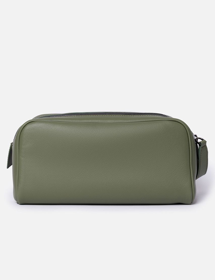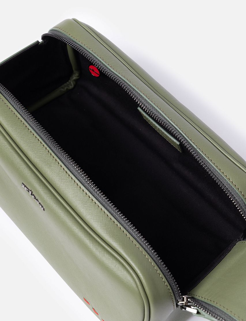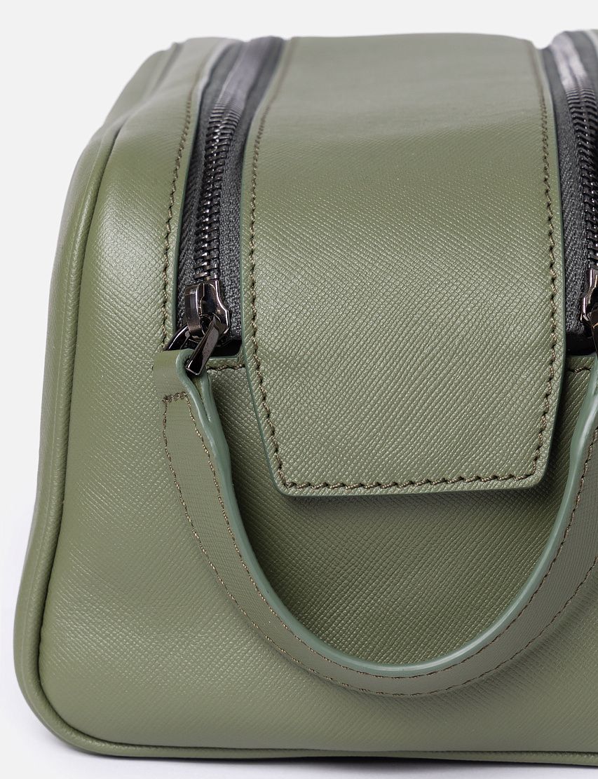Несессер из прочной сафьяновой кожи отлично подойдет для хранения туалетных и косметических принадлежностей. Доступ во вместительное основное отделение обеспечивают две молнии, а роль пуллера выполняет короткая ручка. Аксессуар украсили металлическим логотипом и декоративными стежками фирменного алого цвета на передней панели.
