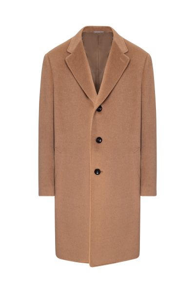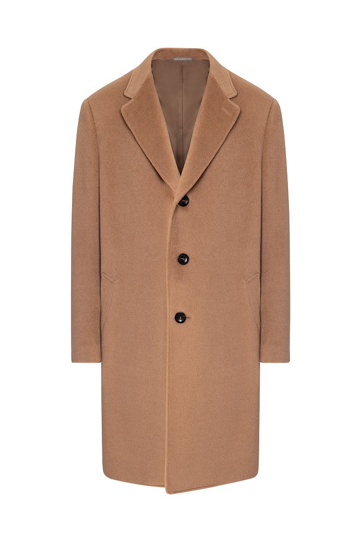 Пальто Kei из верблюжей шерсти оттенка кэмел. Модель приталенного силуэта со стандартными лацканами. Изделие выполнено без подкладки, с двумя боковыми карманами и с застёжкой на три пуговицы.