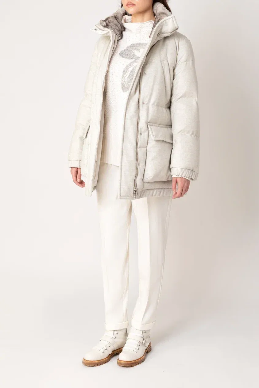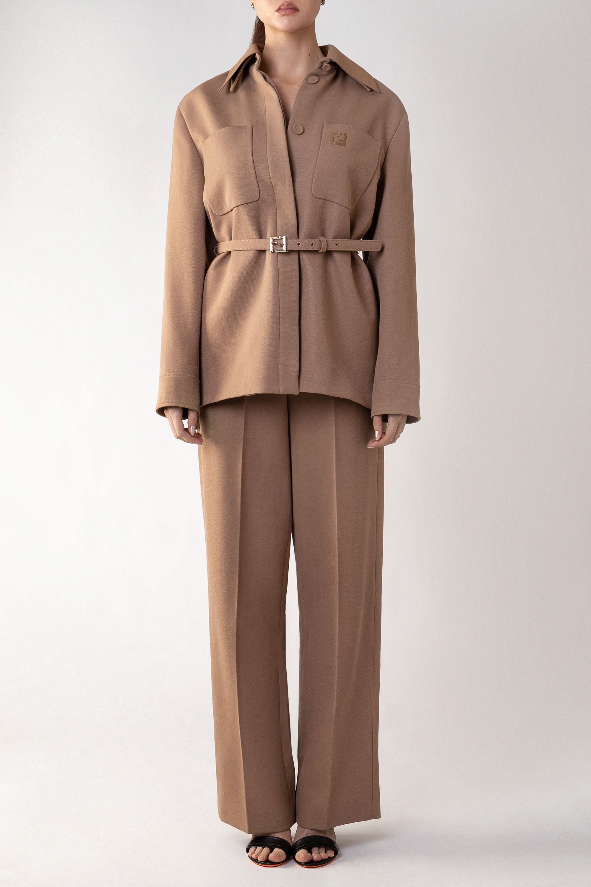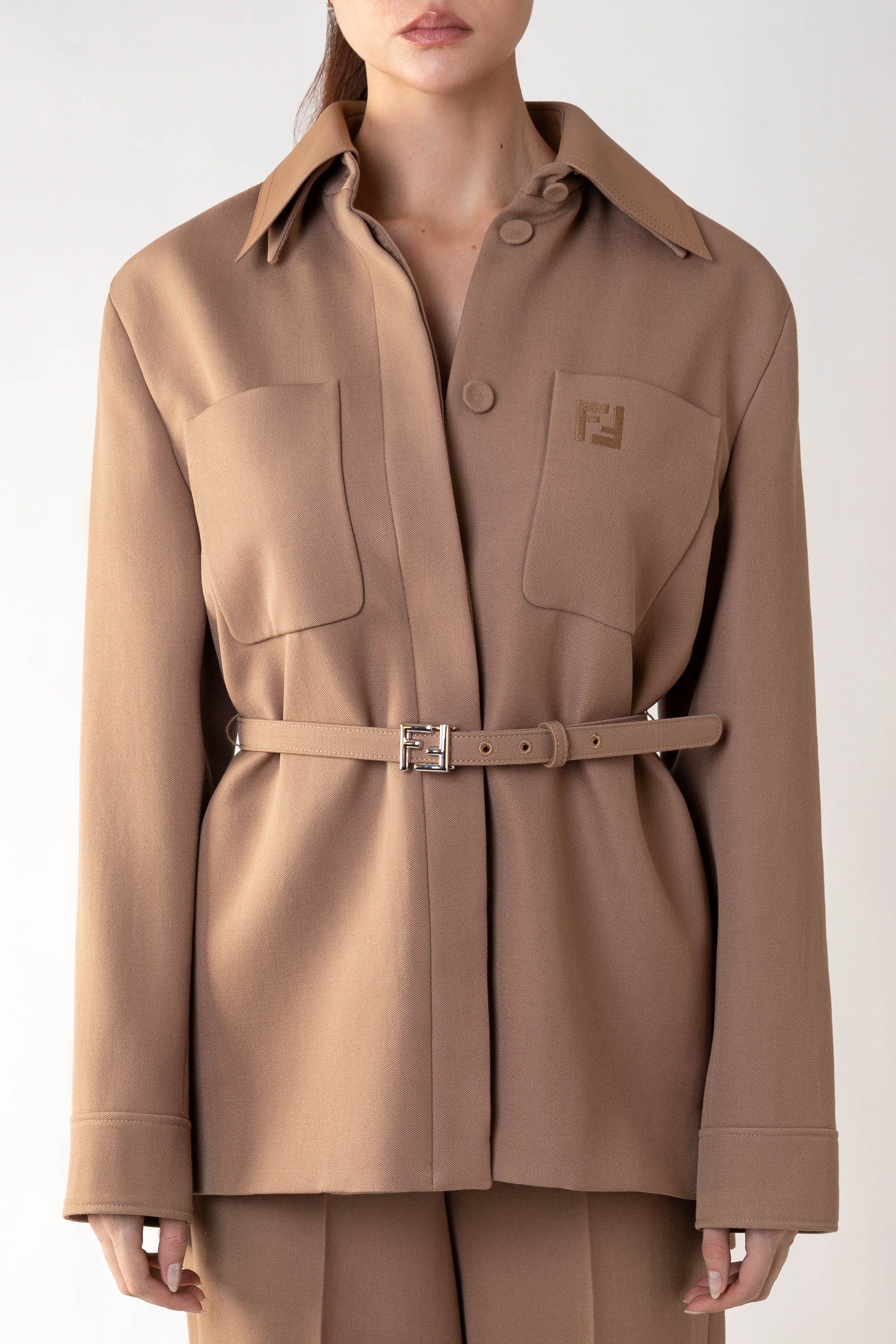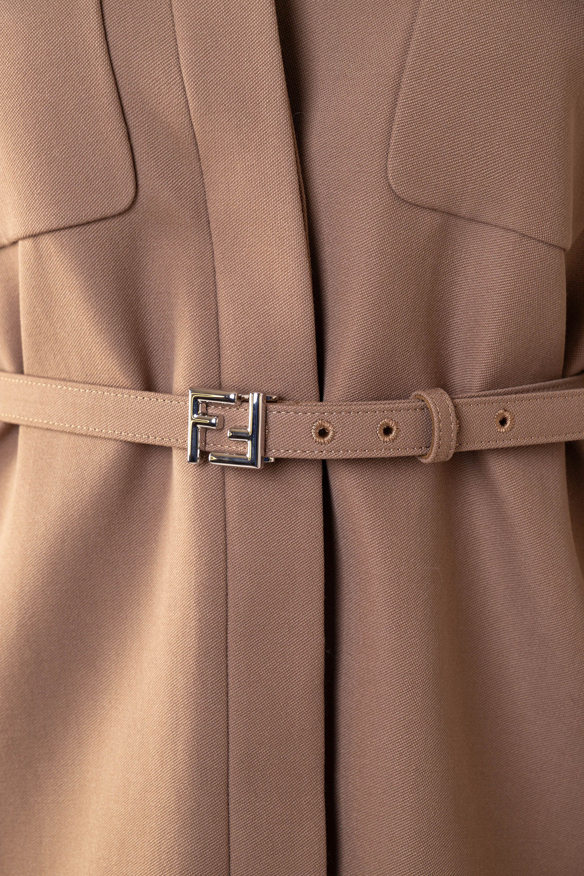 Однобортное пальто прямого кроя сшили из мягко шерстяной ткани с добавлением шелка. Модель с отложным воротником и лацканами дополнена прорезными карманами, потайной застежкой на пуговицы и шлицей сзади. Узнаваемый жаккардовый узор FF на подкладе и воротнике подчеркивает фирменный стиль Fendi.