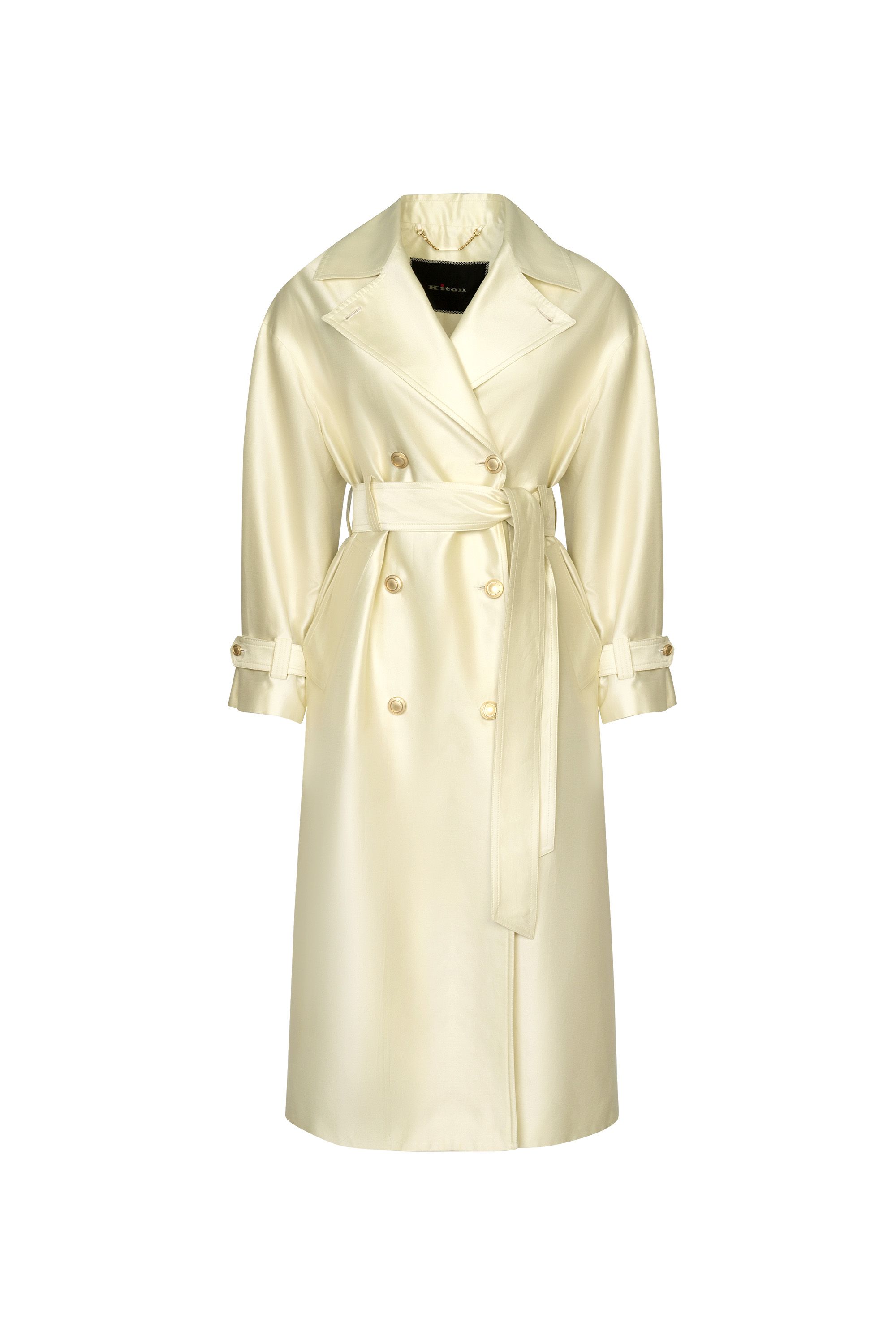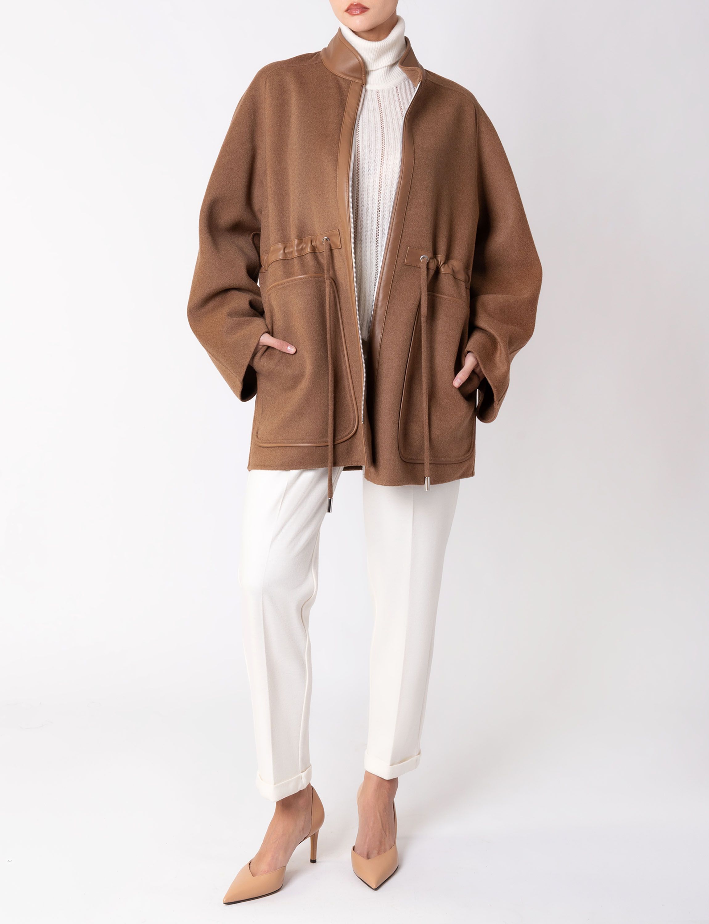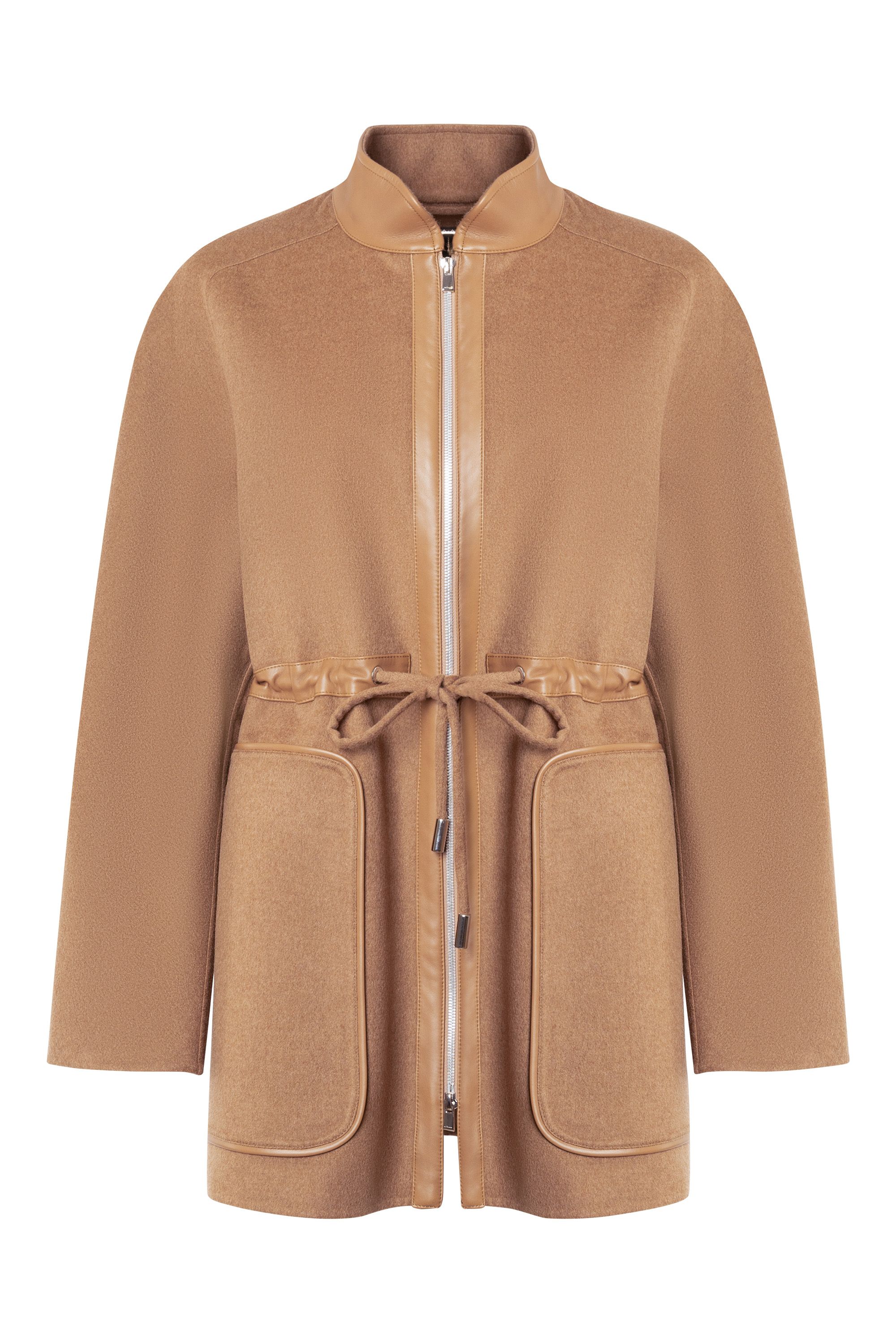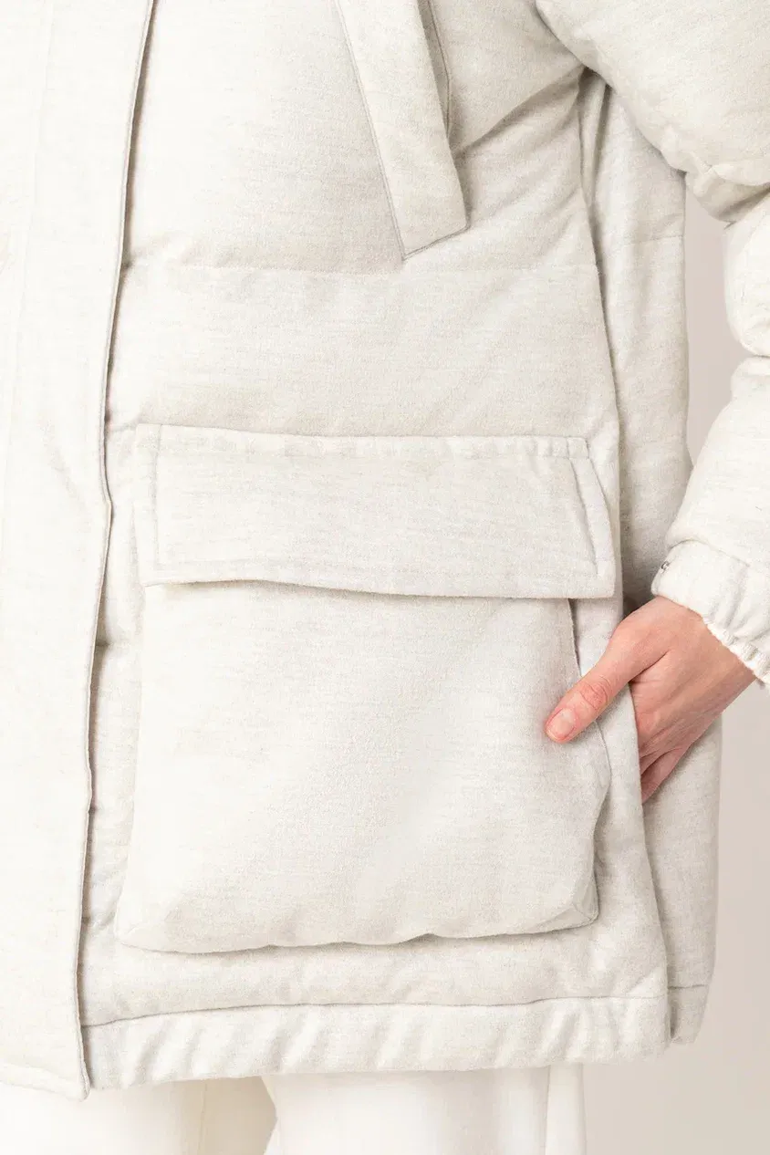 Однобортное пальто прямого кроя сшили из мягко шерстяной ткани с добавлением шелка. Модель с отложным воротником и лацканами дополнена прорезными карманами, потайной застежкой на пуговицы и шлицей сзади. Узнаваемый жаккардовый узор FF на подкладе и воротнике подчеркивает фирменный стиль Fendi.