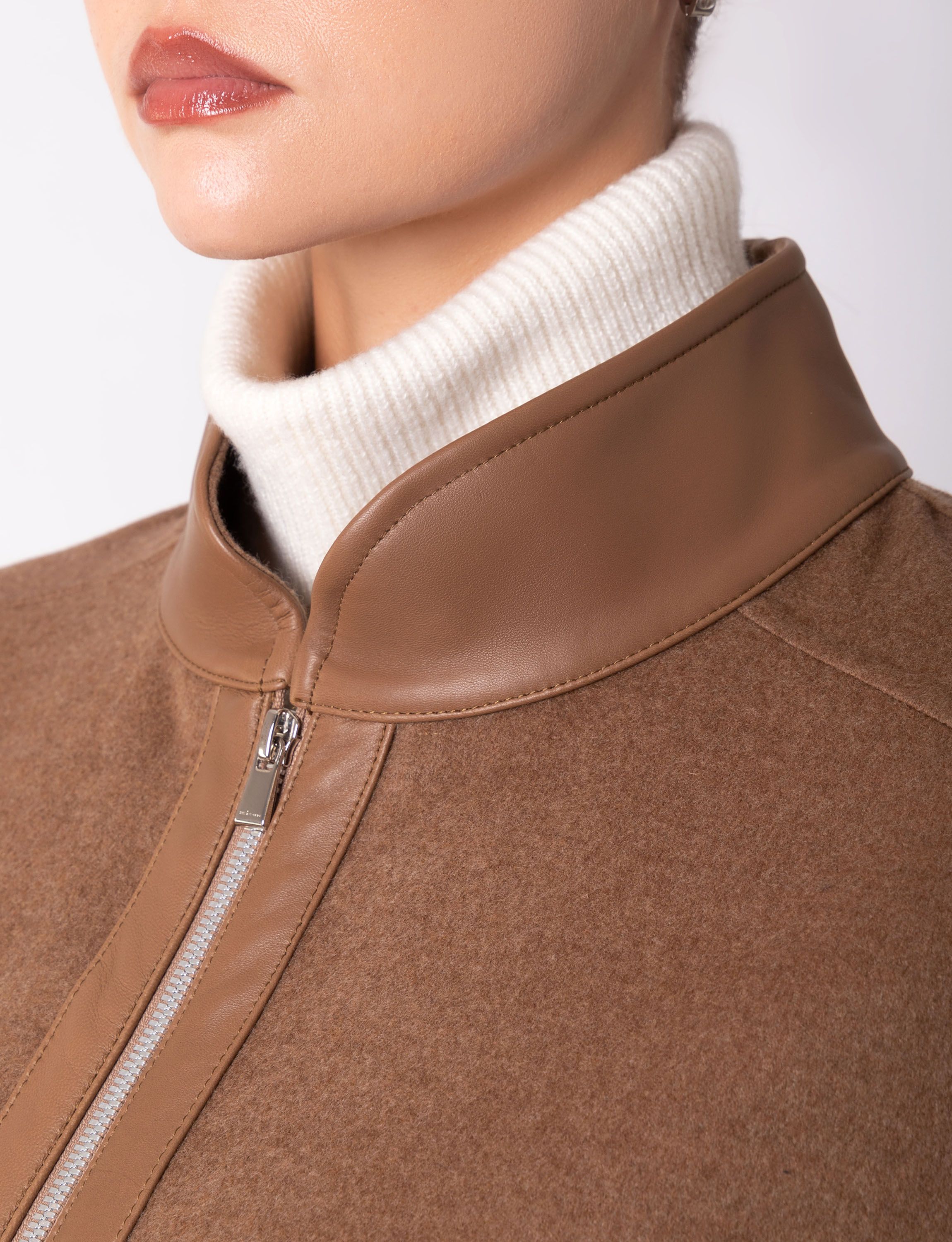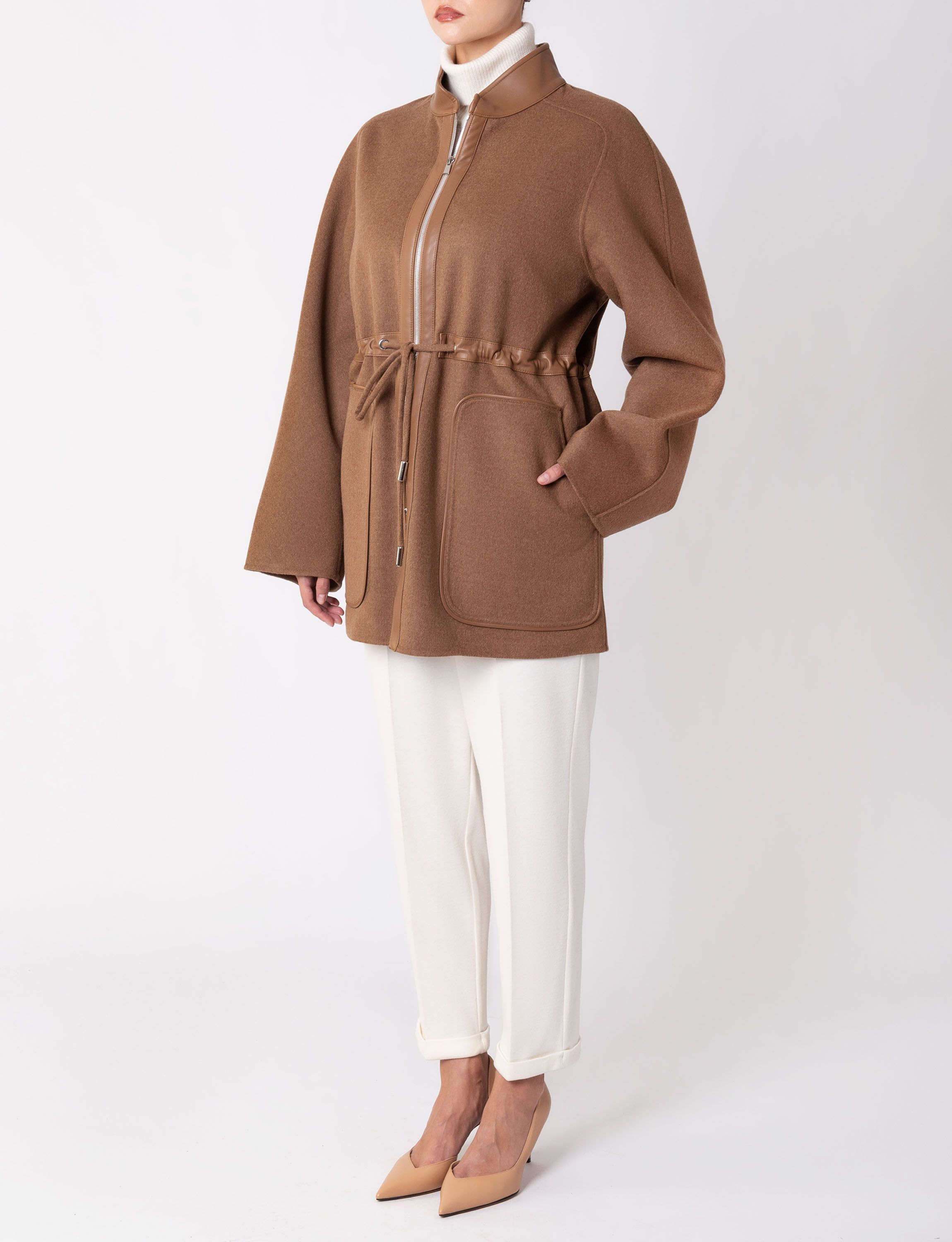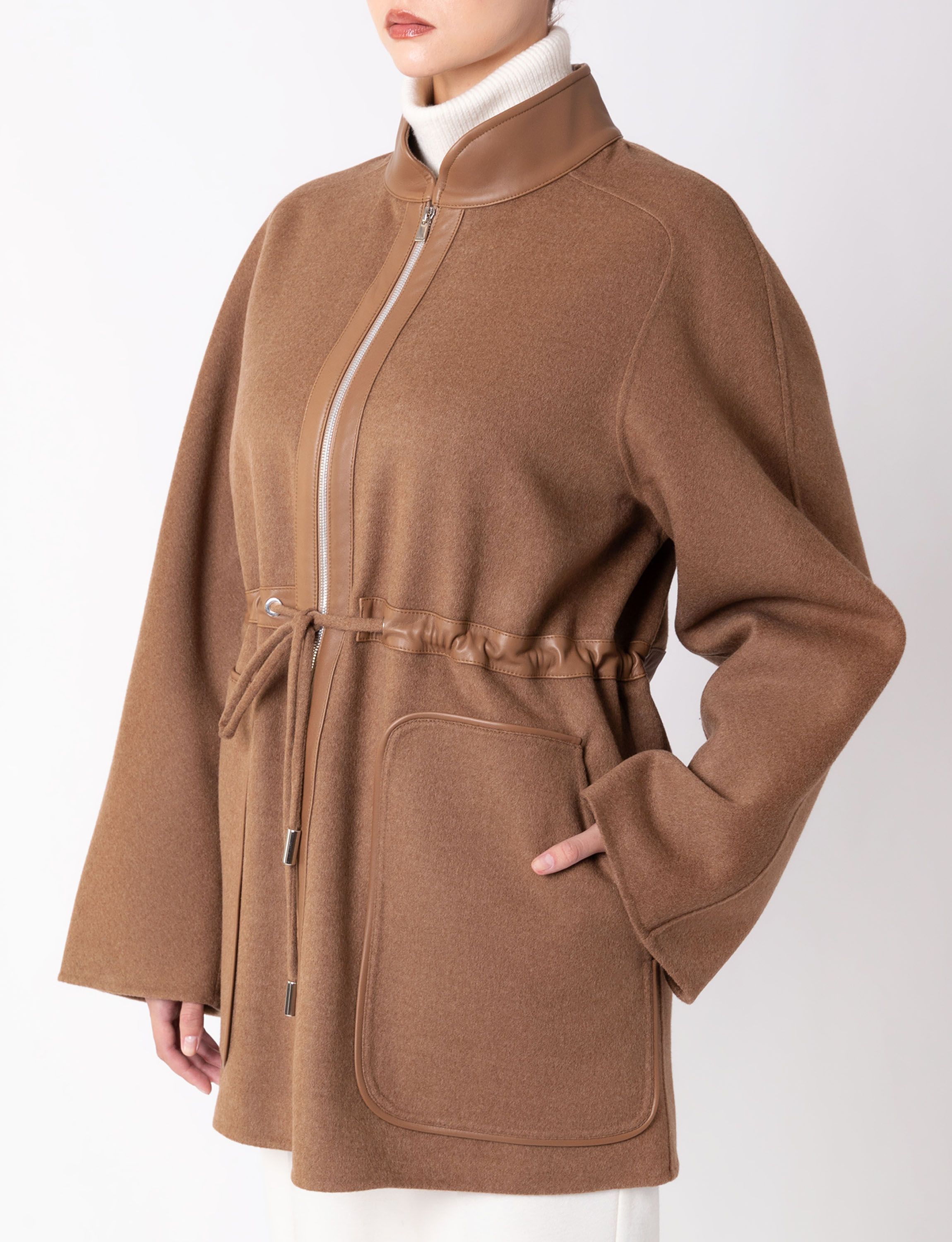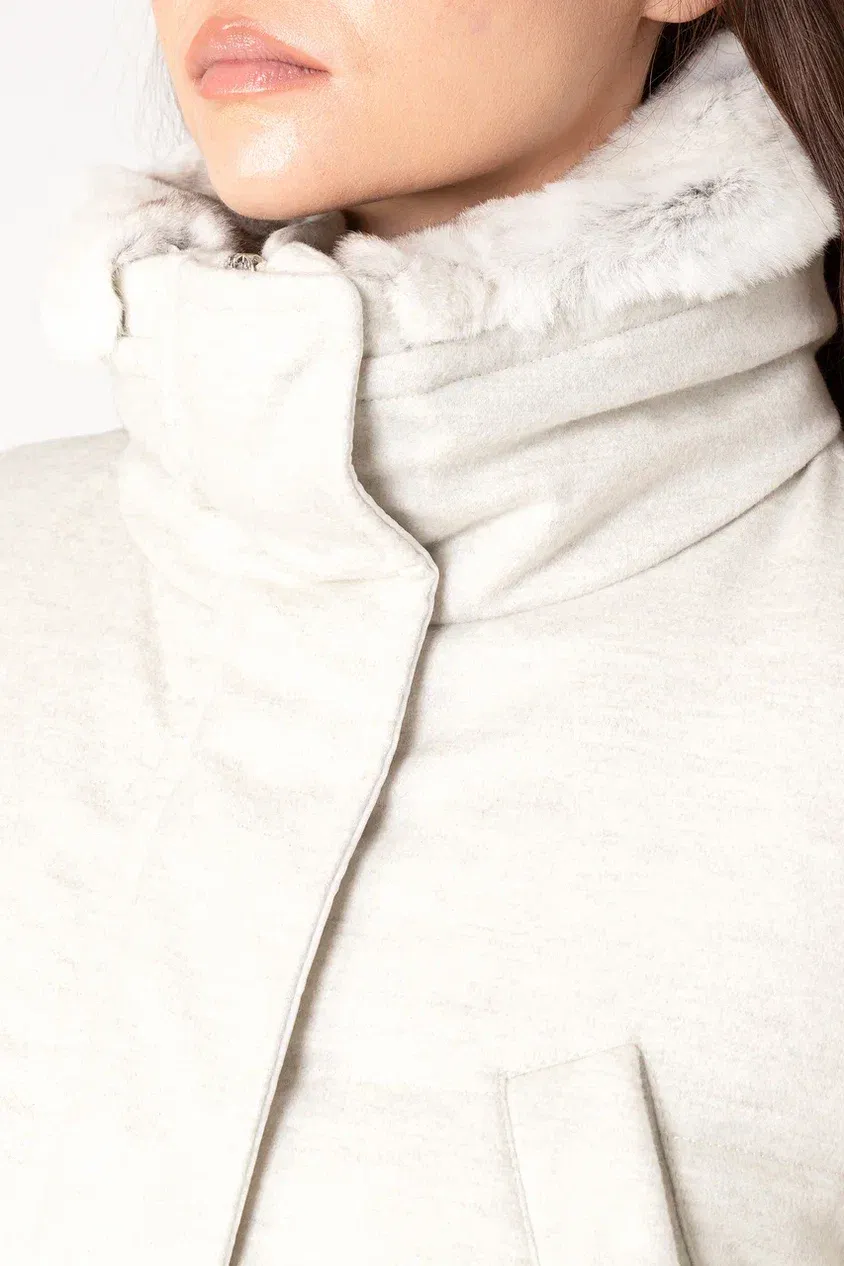 Однобортное пальто прямого кроя сшили из мягко шерстяной ткани с добавлением шелка. Модель с отложным воротником и лацканами дополнена прорезными карманами, потайной застежкой на пуговицы и шлицей сзади. Узнаваемый жаккардовый узор FF на подкладе и воротнике подчеркивает фирменный стиль Fendi.