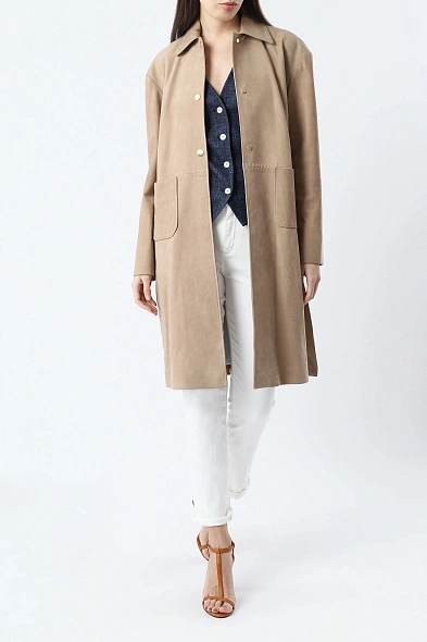 Однобортное пальто прямого кроя сшили из мягко шерстяной ткани с добавлением шелка. Модель с отложным воротником и лацканами дополнена прорезными карманами, потайной застежкой на пуговицы и шлицей сзади. Узнаваемый жаккардовый узор FF на подкладе и воротнике подчеркивает фирменный стиль Fendi.