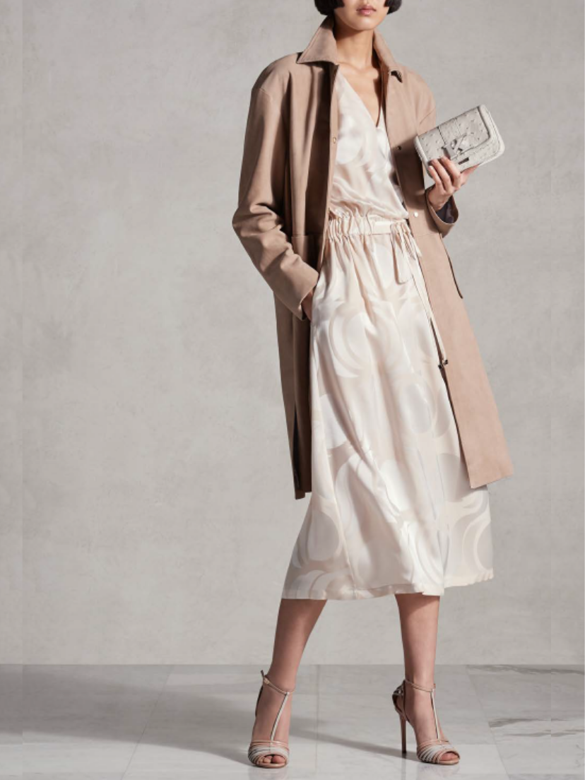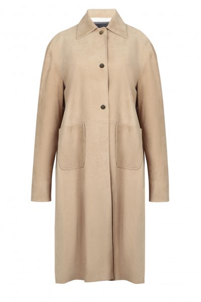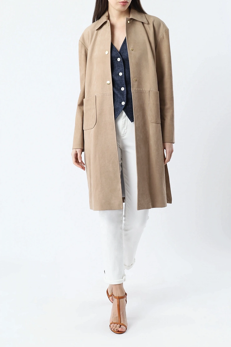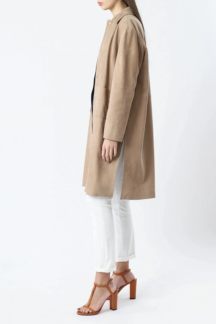 Кожаное пальто поможет составить изысканный весенний образ. Модель прямого кроя с разрезами по бокам, отложным воротником, накладными боковыми карманами и застежкой на кнопки.