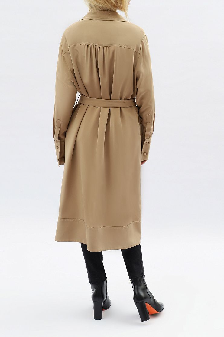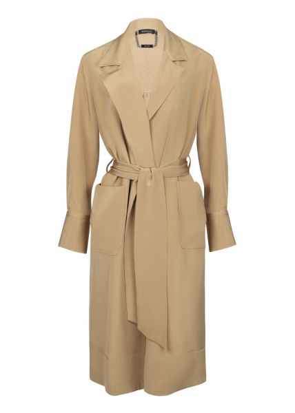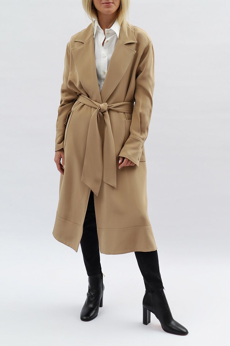 Шелковое пальто на запахе позволит создать элегантный повседневный образ. Модель с лацканами, боковыми накладными карманами и широким поясом на талию.