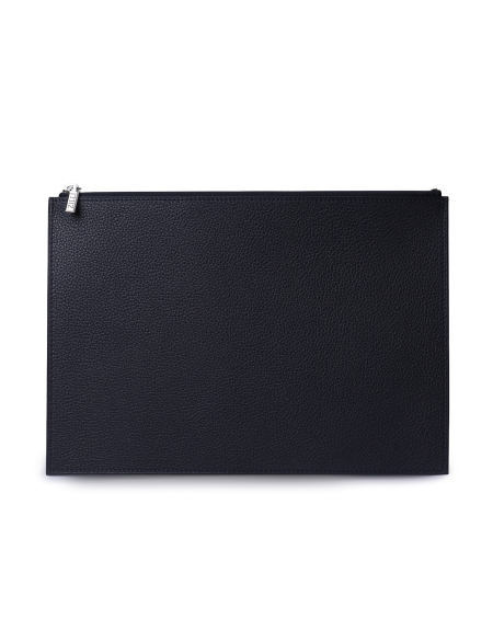Папку для бумаг выполнили из прочной телячьей кожи с зернистой фактурой. Модель застегивается на молнию с брендированным пуллером.