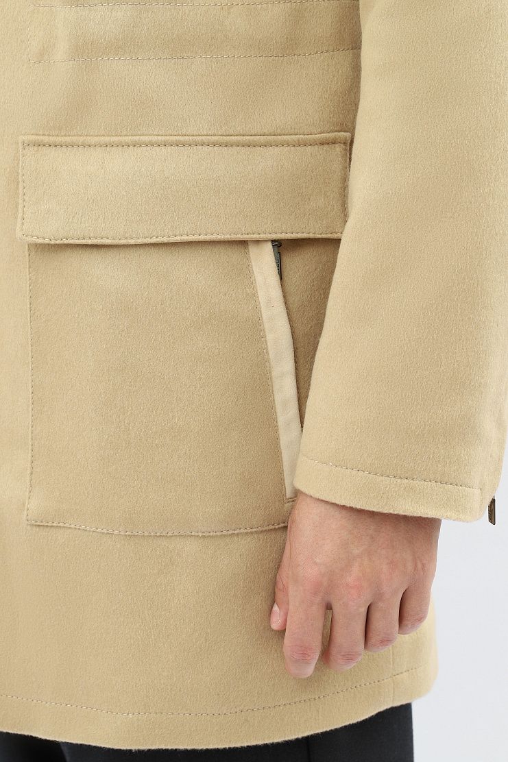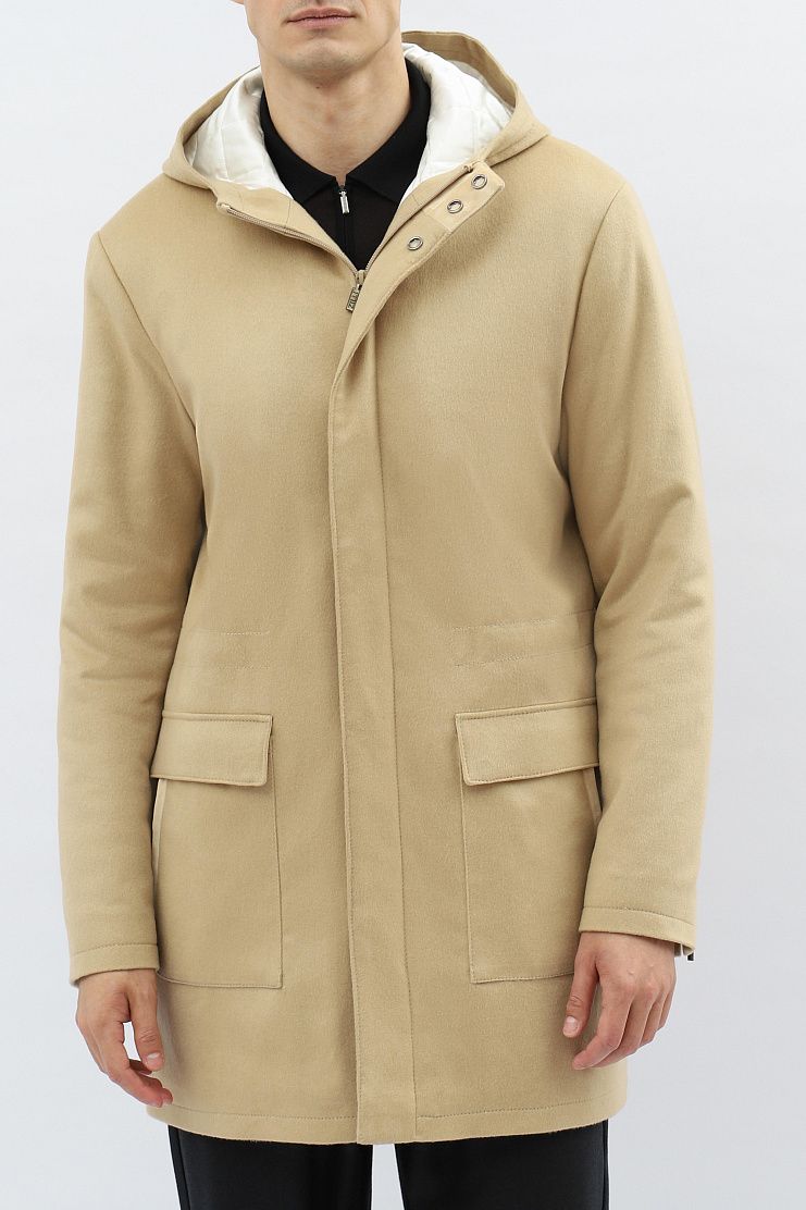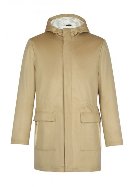 Кашемировая парка с отделкой из замши отлично подойдет для теплой осенней погоды. Модель на шелковой подкладке имеет капюшон, пояс на кулиске, боковые накладные карманы и застежку на молнию и кнопки.