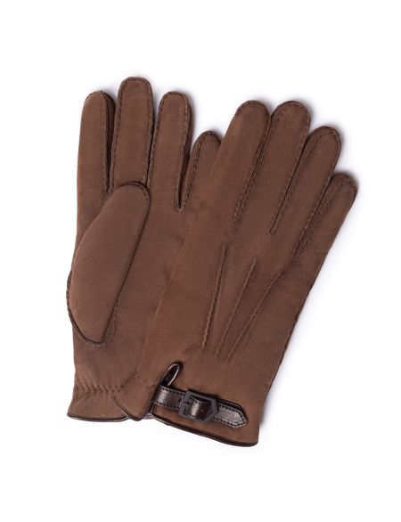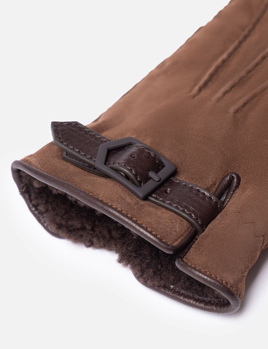 Перчатки с рельефными швами на тыльной стороне сшили из бархатистой замши. Аксессуар дополнили подкладкой из мягкой овчины, поэтому в них будет тепло даже в морозные дни. Лаконичный элемент декора — кожаный ремешок с застежкой-пряжкой.