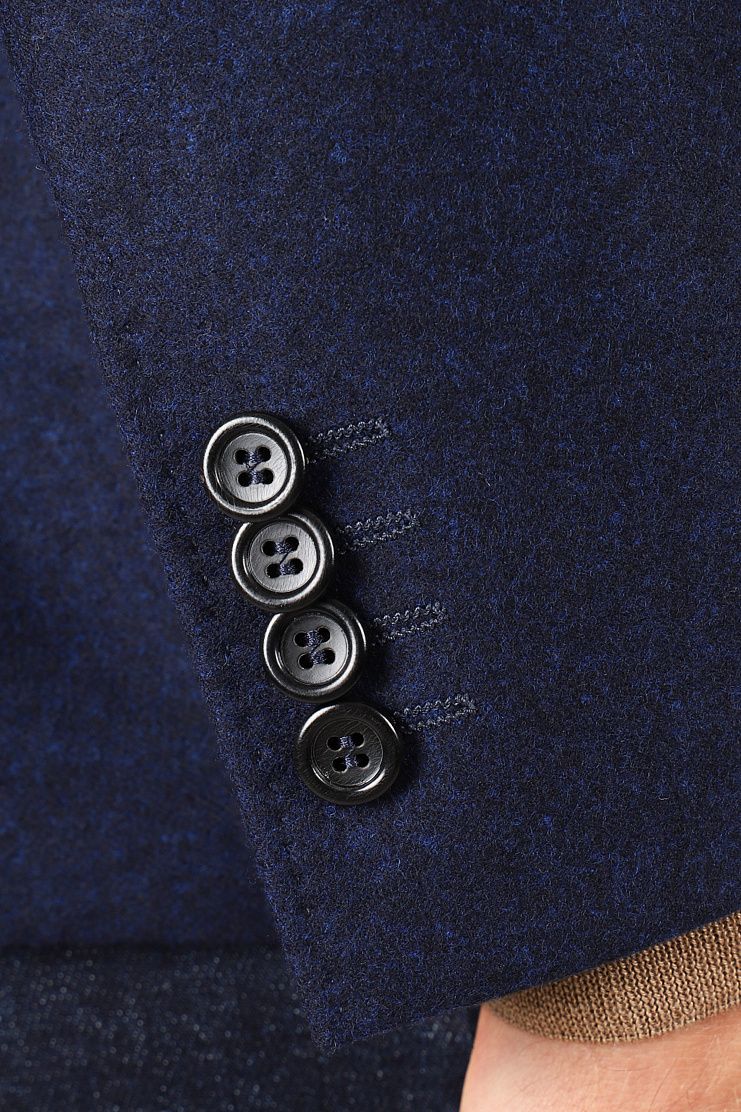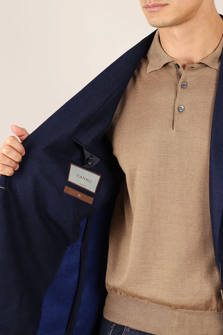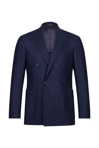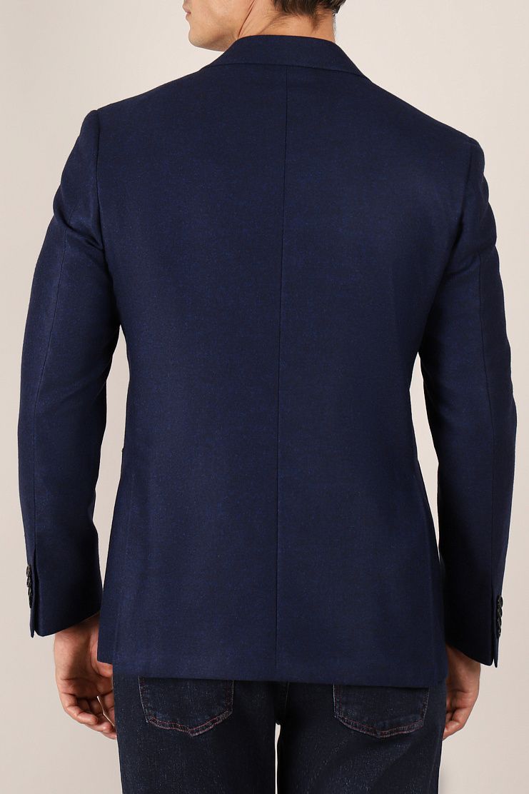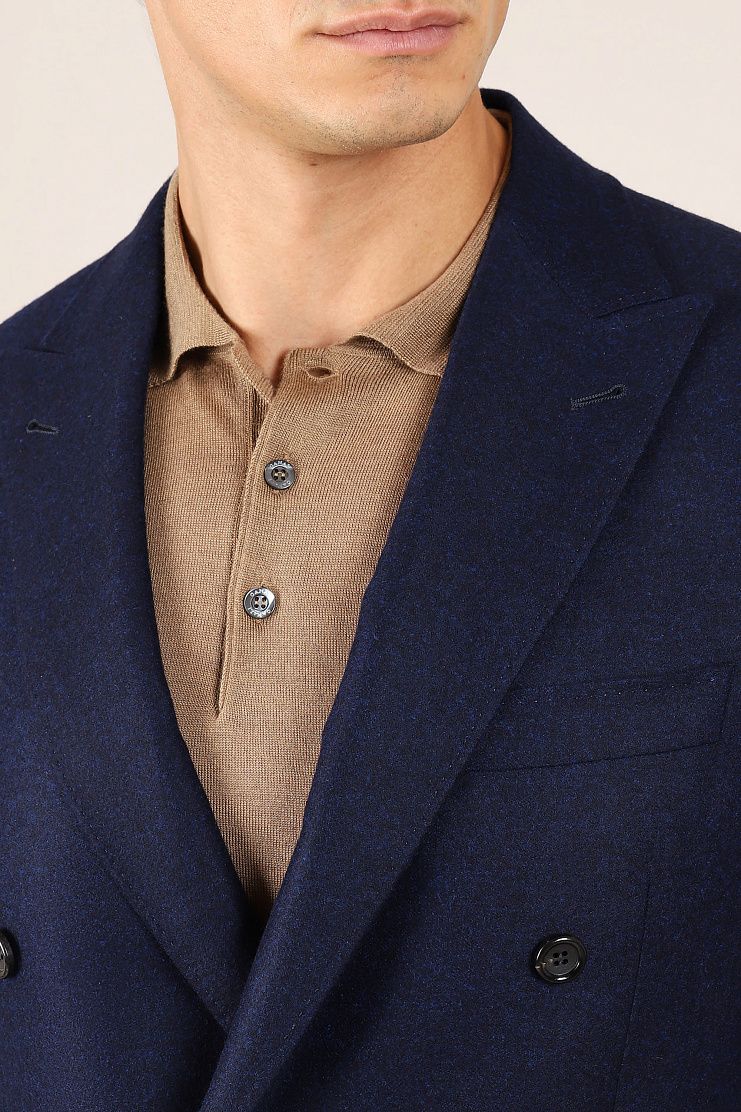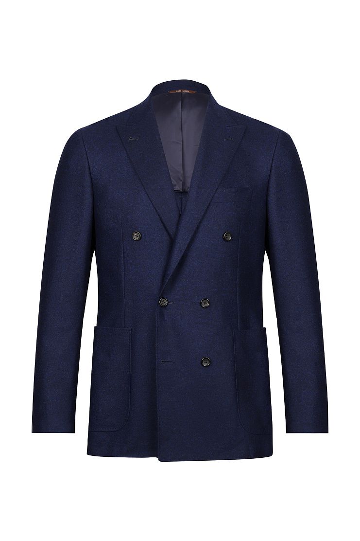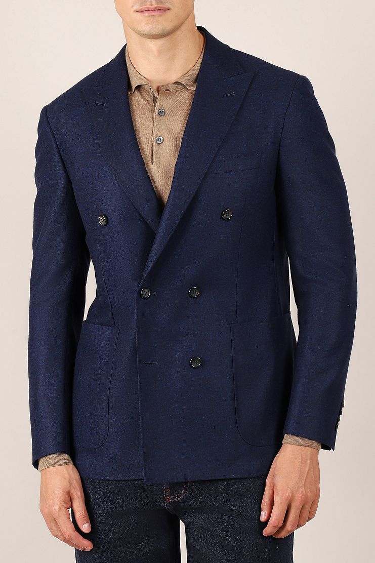 Двубортный пиджак с заостренными лацканами и боковыми накладными карманами превосходно подойдет для повседневного элегантного образа. Слегка приталенная модель на полуподкладке.