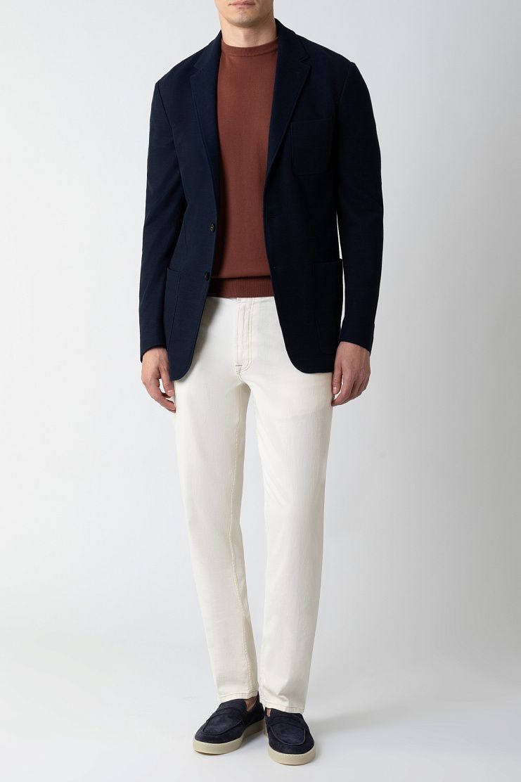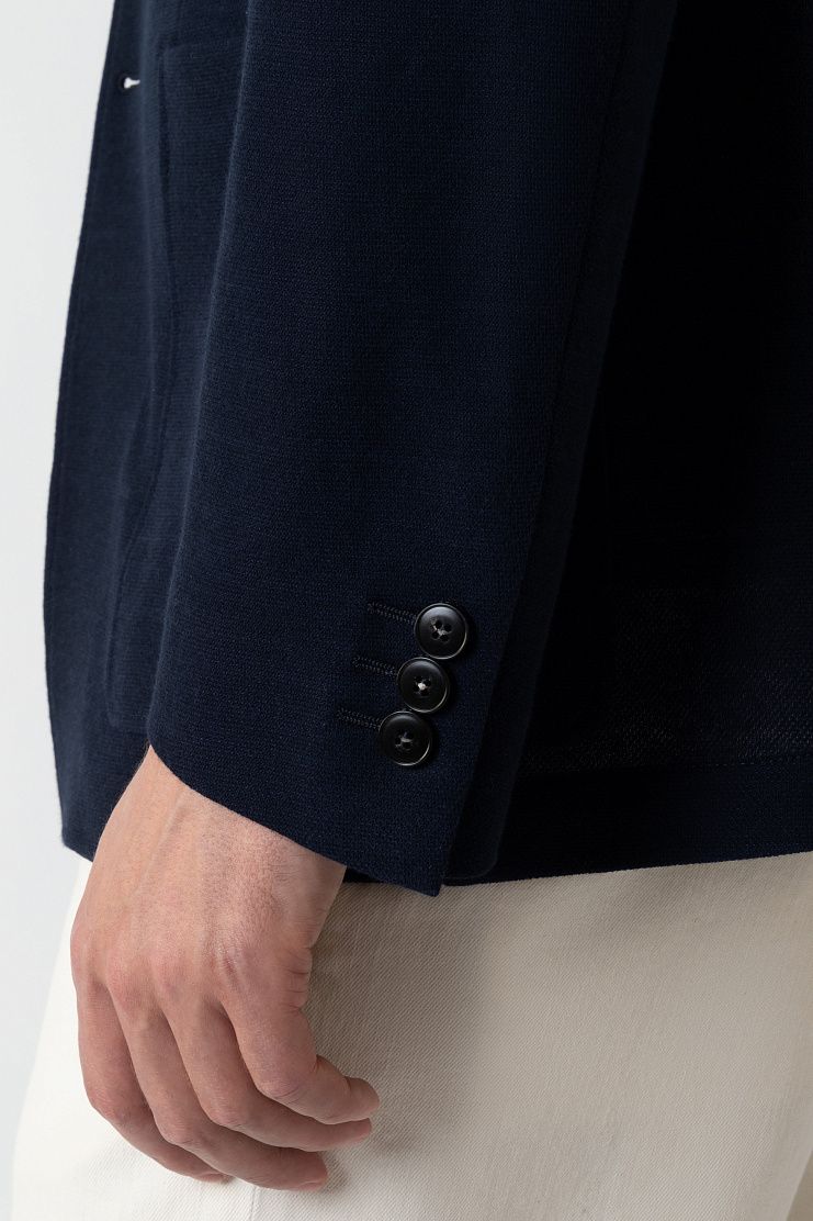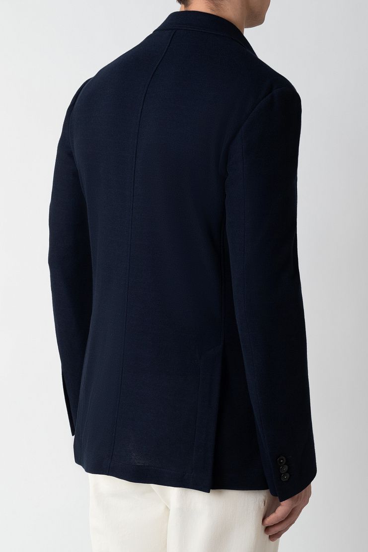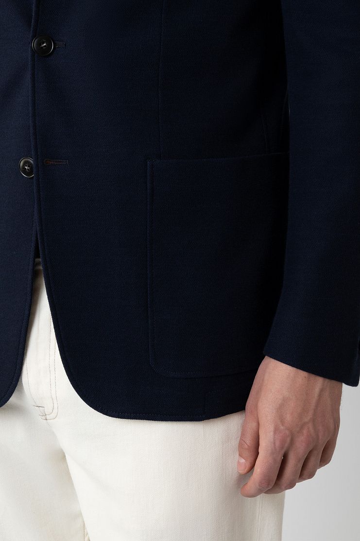 Однобортный пиджак сшили из мягкого трикотажного джерси на основе высококачественного хлопка. Благодаря выбору материала, отсутствию подклада и двум шлицам изделие комфортно садится по фигуре и не стесняет движений. Модель с мягкой линией плеч и накладными карманами застегивается на две пуговицы.
