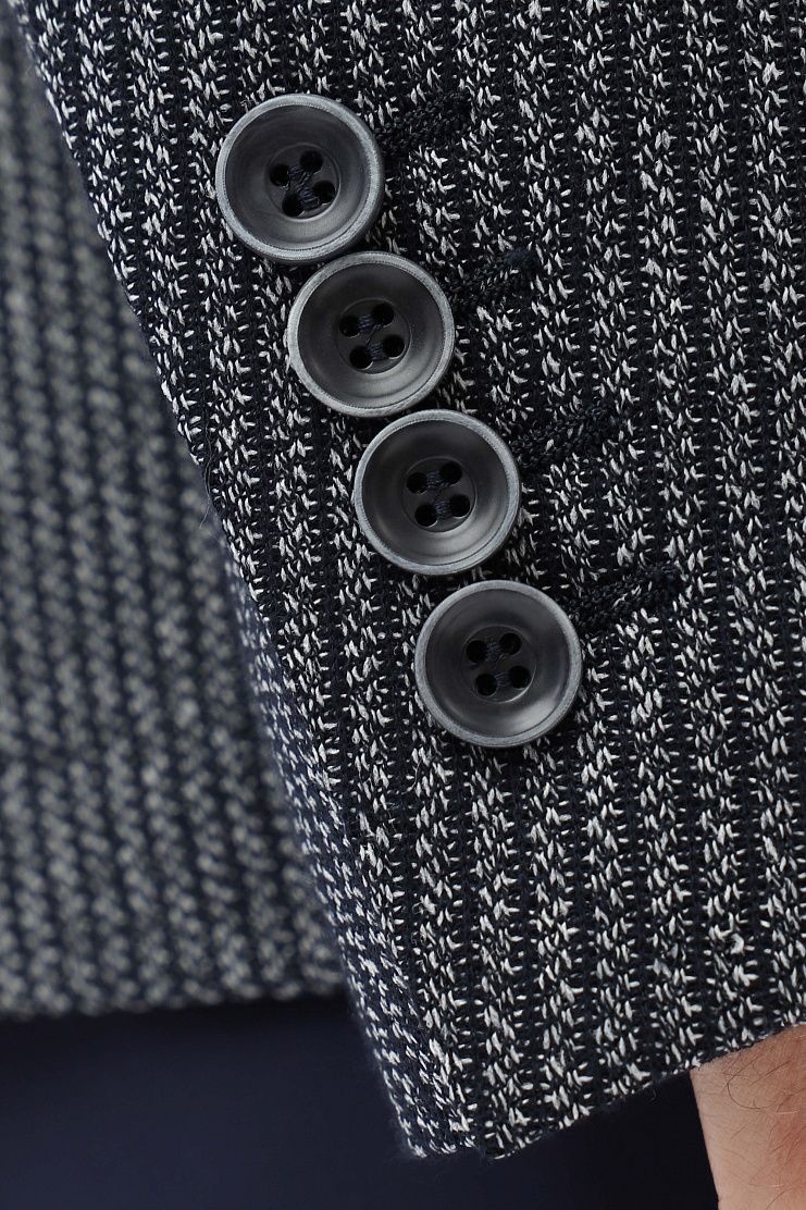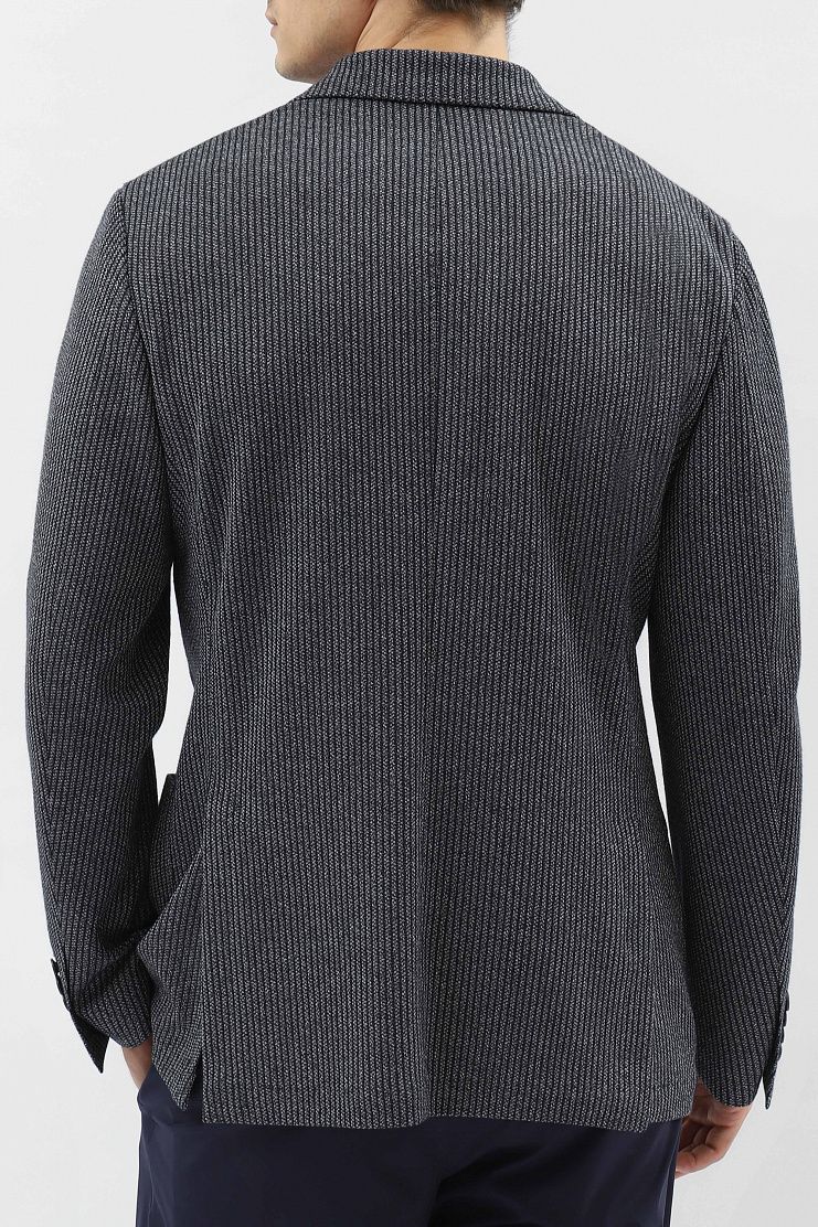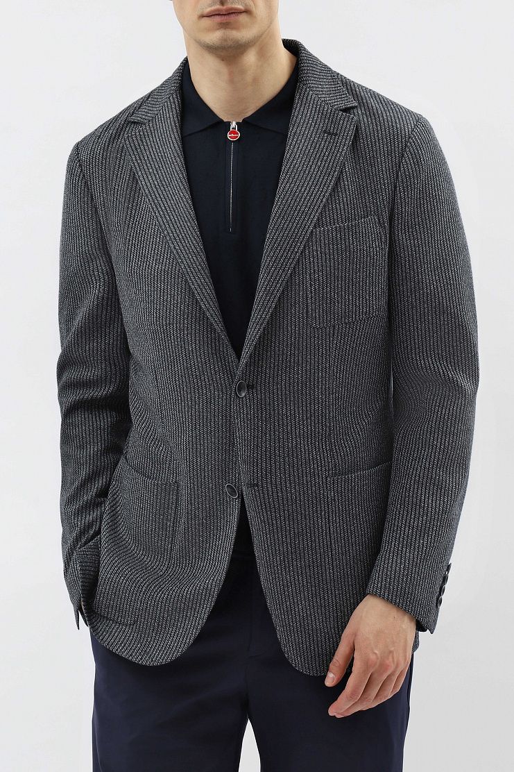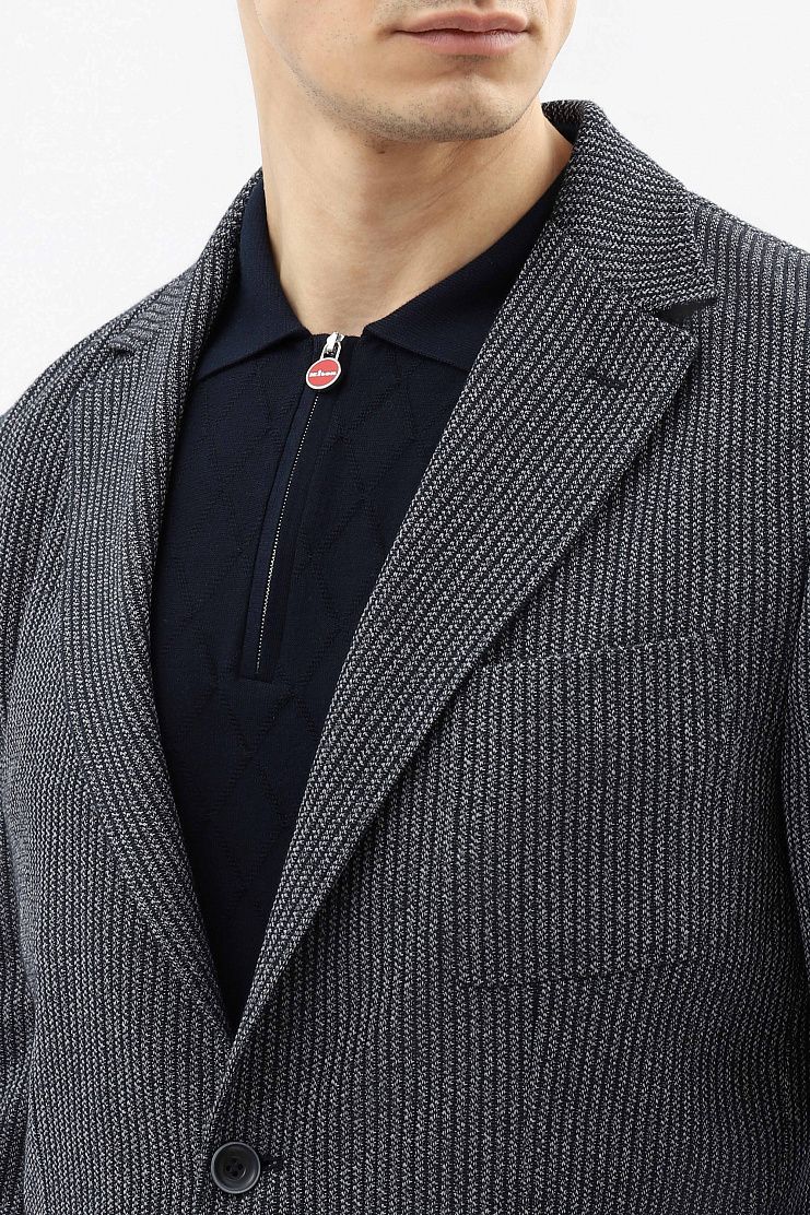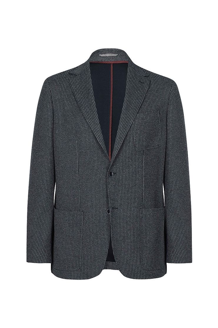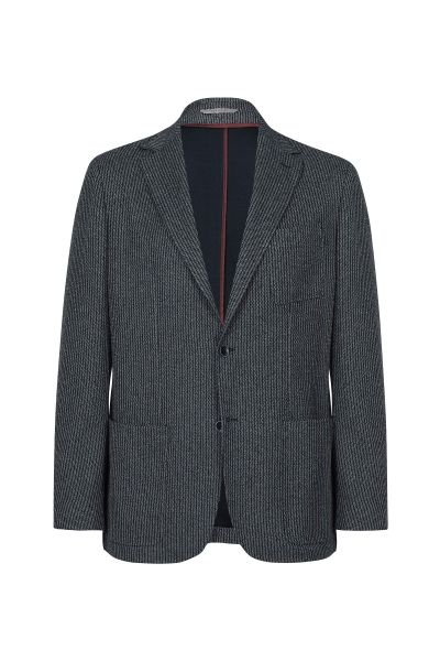 Пиджак из ткани с фактурной вертикальной полоской прекрасно подойдет для повседневного элегантного образа. Модель имеет накладные карманы.