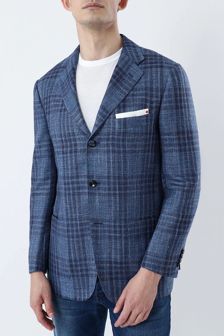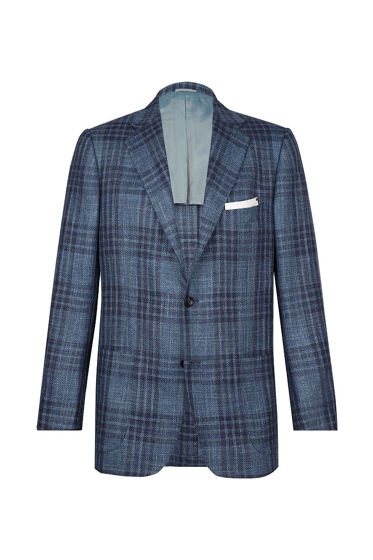 Пиджак в клетку выполнен из фактурной ткани с содержанием кашемира, шерсти, шелка и льна. Модель с накладными боковыми карманами превосходно подойдет для свободного офисного или повседневного стиля. Изделие слегка приталенногоо силуэта на подкладке из шелковистого материала купро. Пиджак дополнен нагрудным платком с вышивикой.