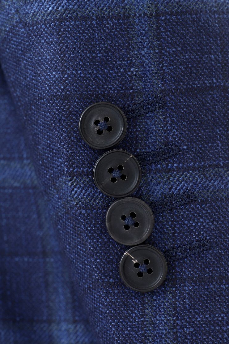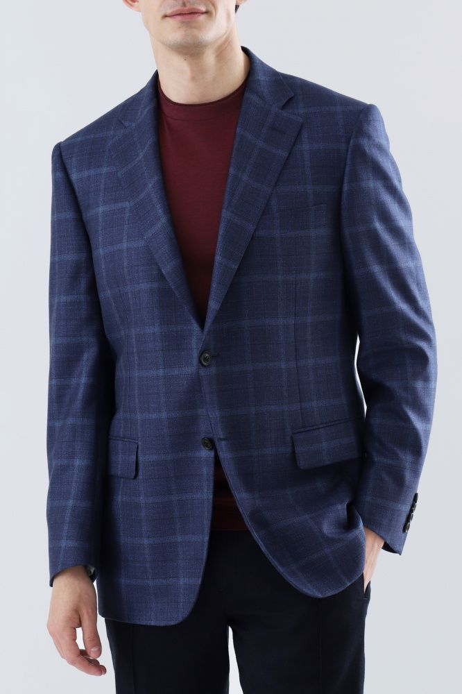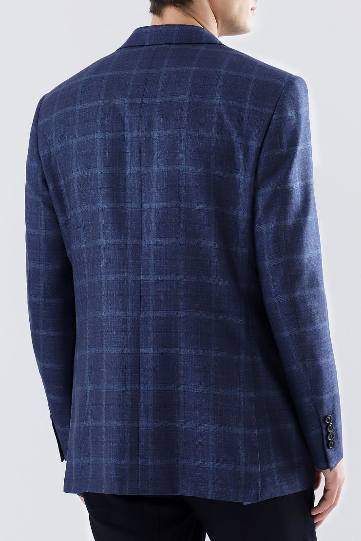 Пиджак в клетку выполнен из шелка и кашемира. Приталенная модель с лацканами, боковыми карманами с клапанами и нагрудным.