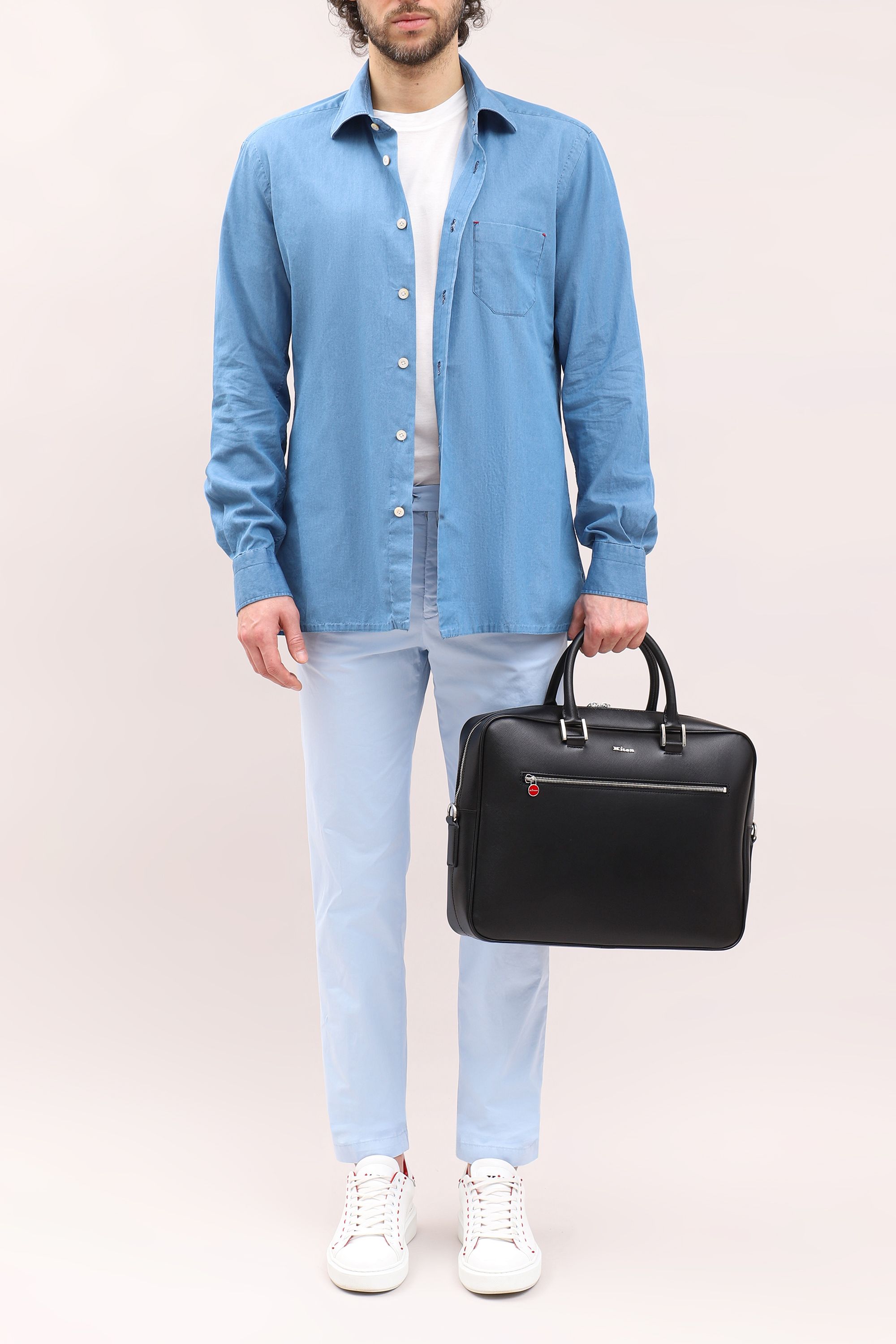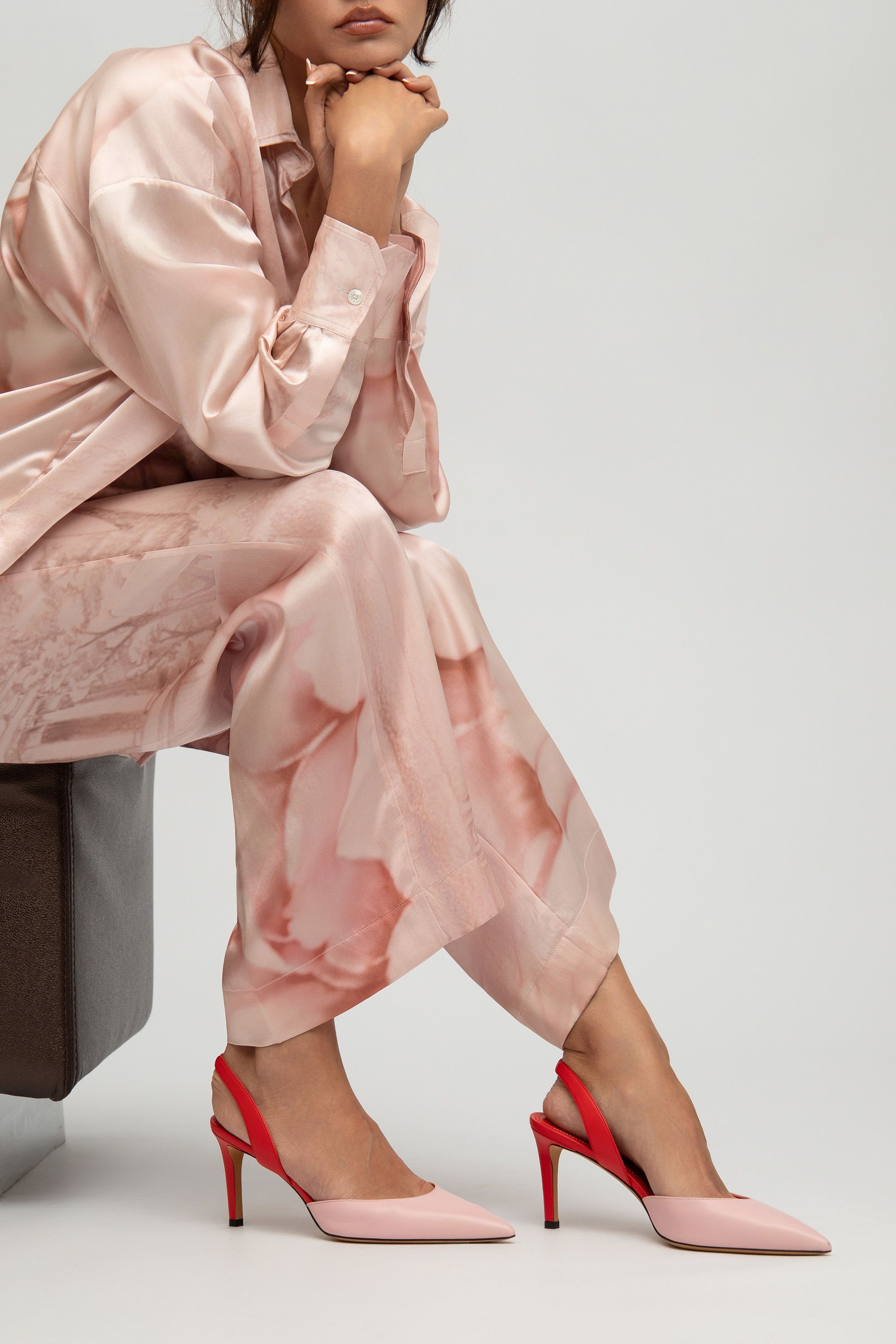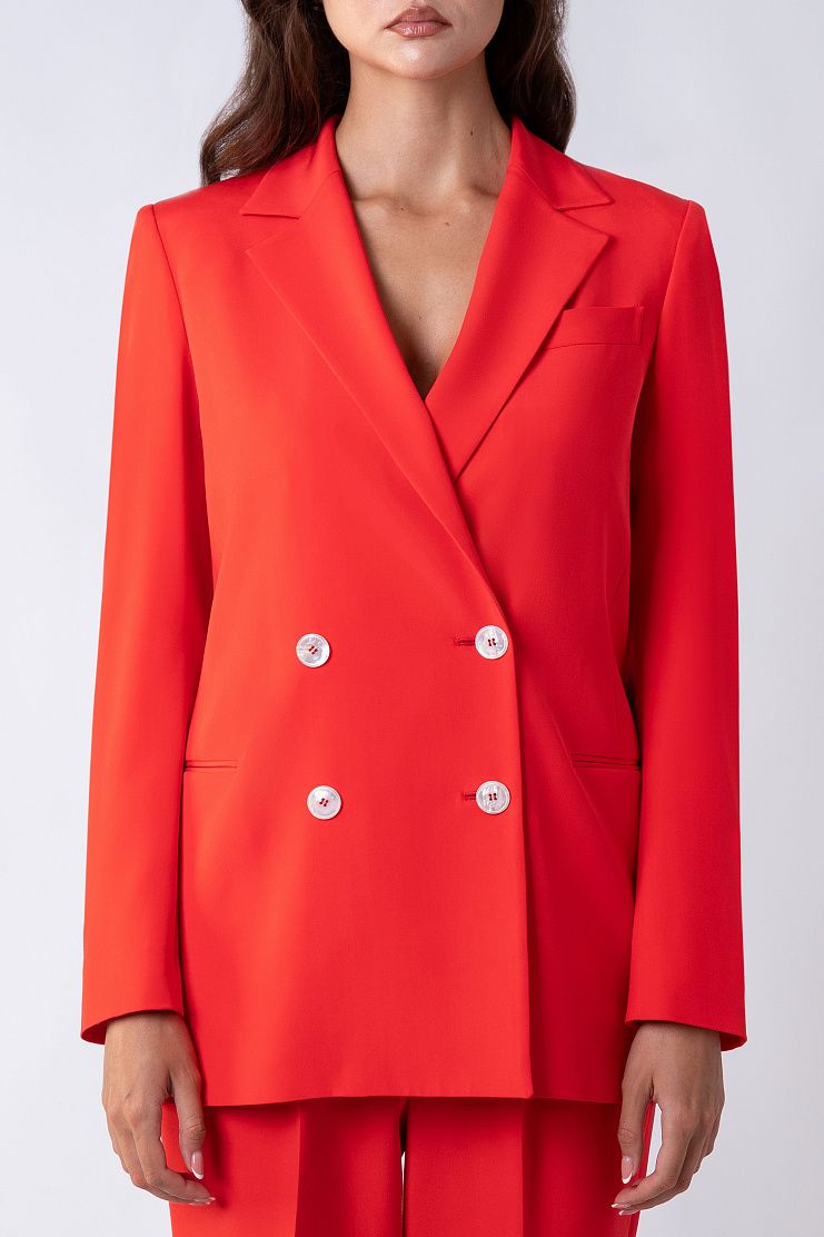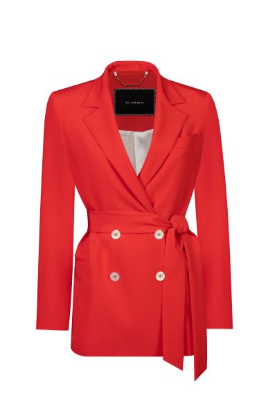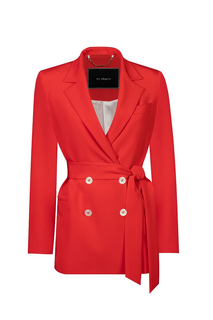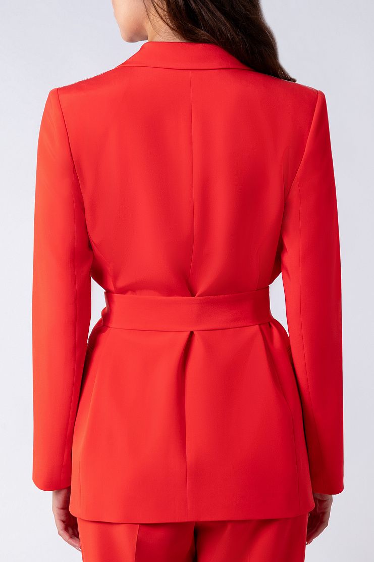 Двубортный жакет с прямоугольными лацканами сшили из гладкого шелка, усиленного волокнами эластана. Модель с внутренним и тремя внешними карманами дополнена поясом, подчеркивающим талию, и застегивается на крупные контрастные пуговицы.