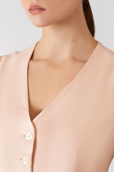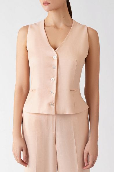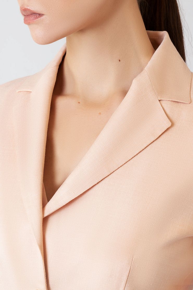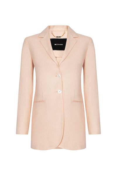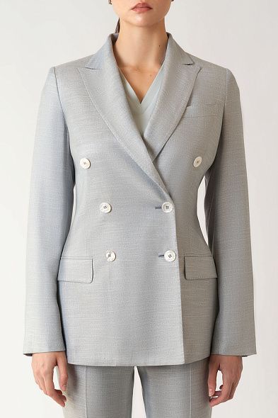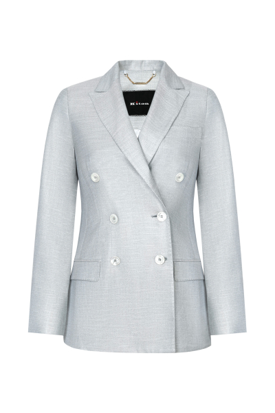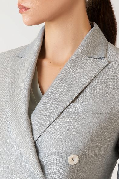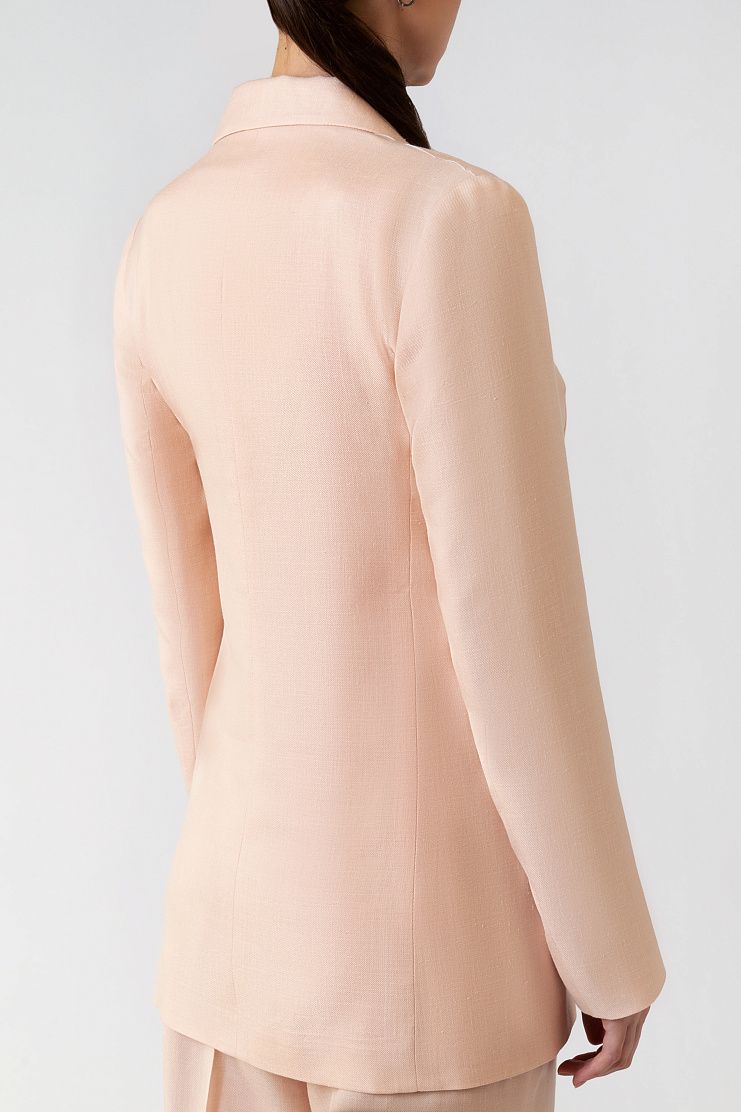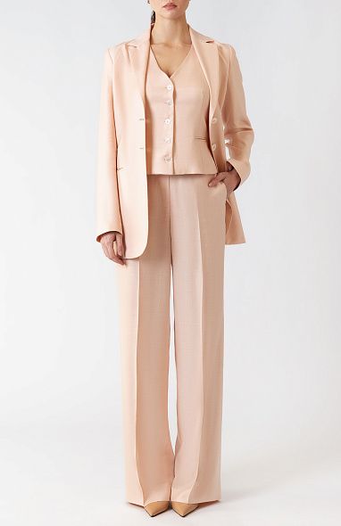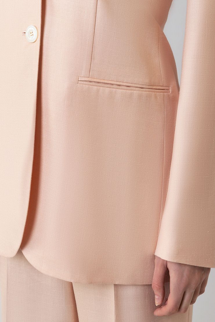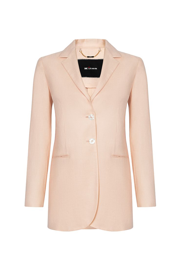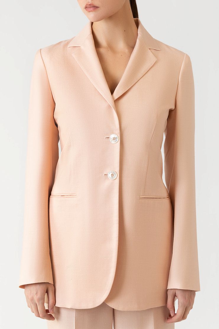 Однобортный пиджак приталенного кроя сшили из ткани, соединившей нежную шерсть с тонкими и прочными нитями шелка и льна. Изделие с боковыми карманами и подкладкой из шелкового атласа застегивается на две перламутровые пуговицы. Сочетайте эту модель с костюмным жилетом и брюками.