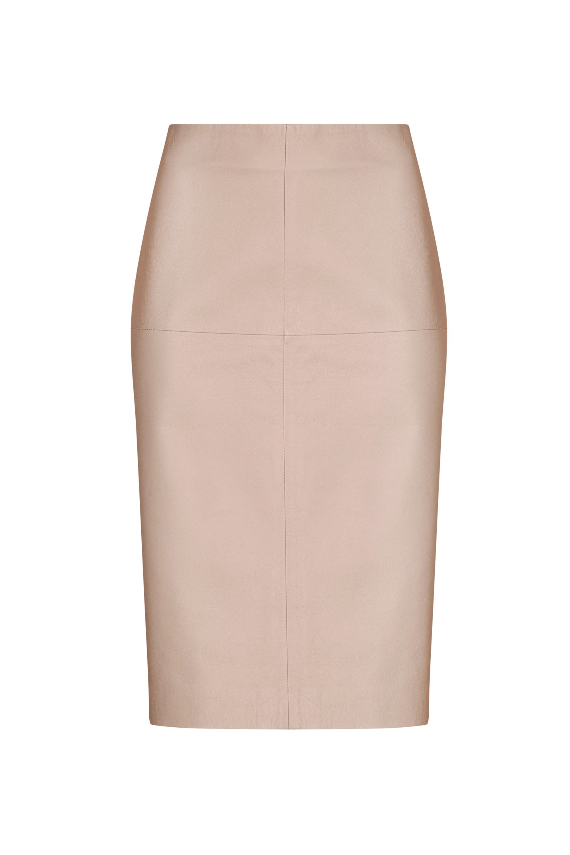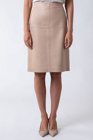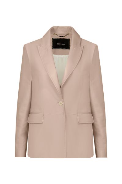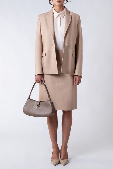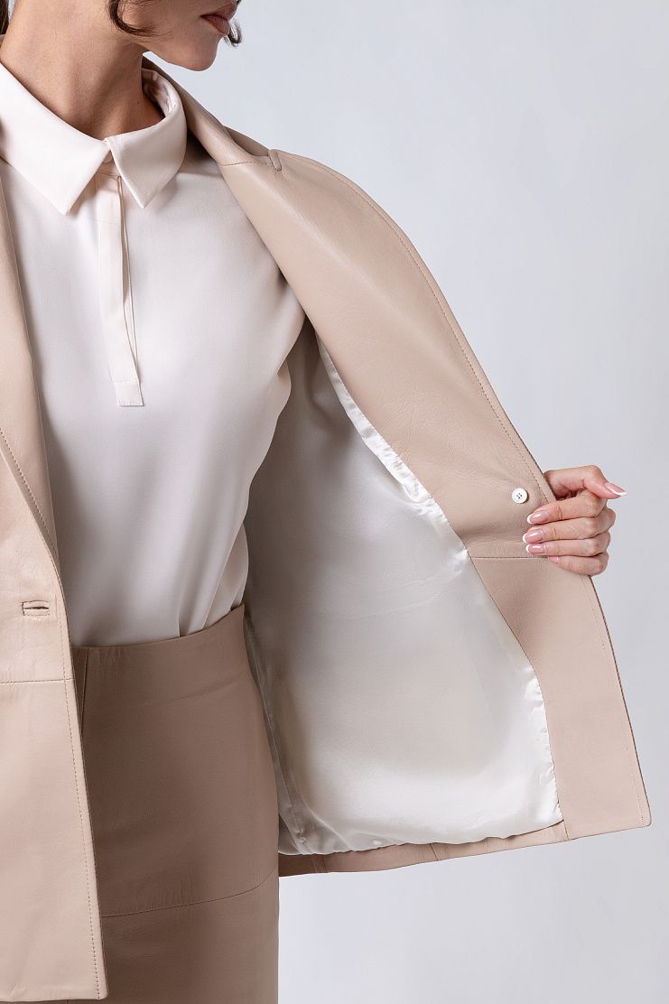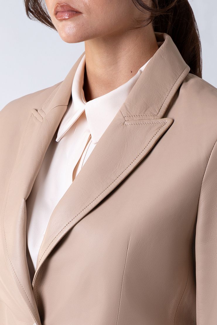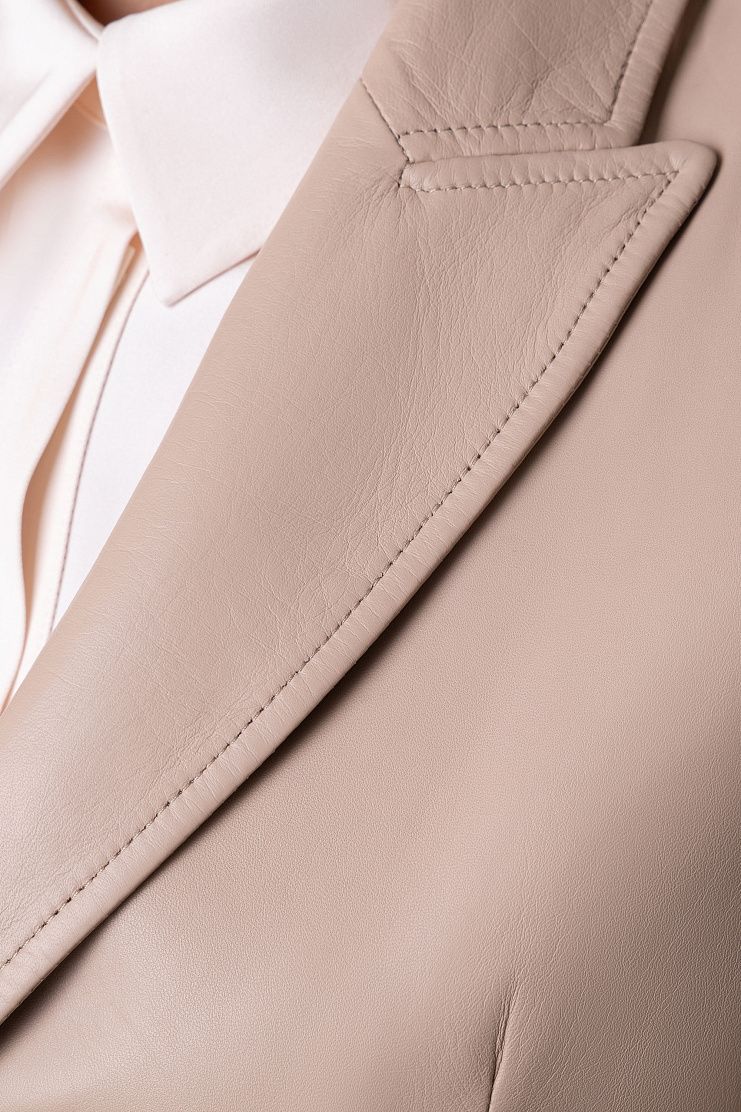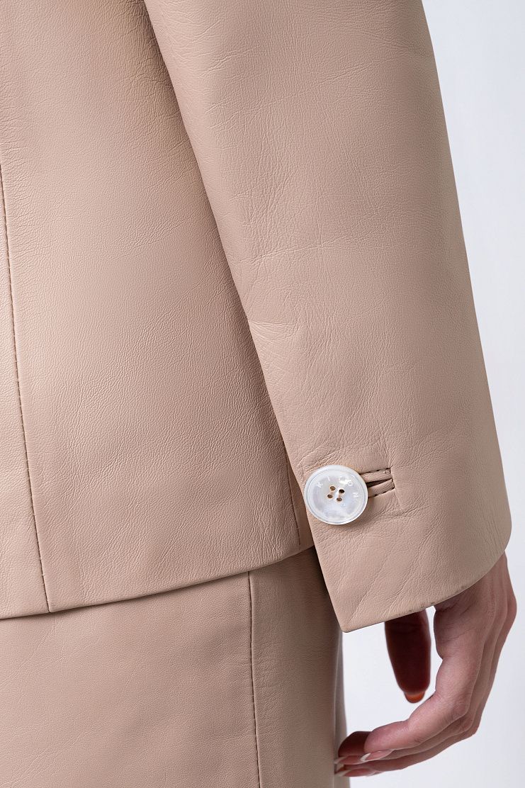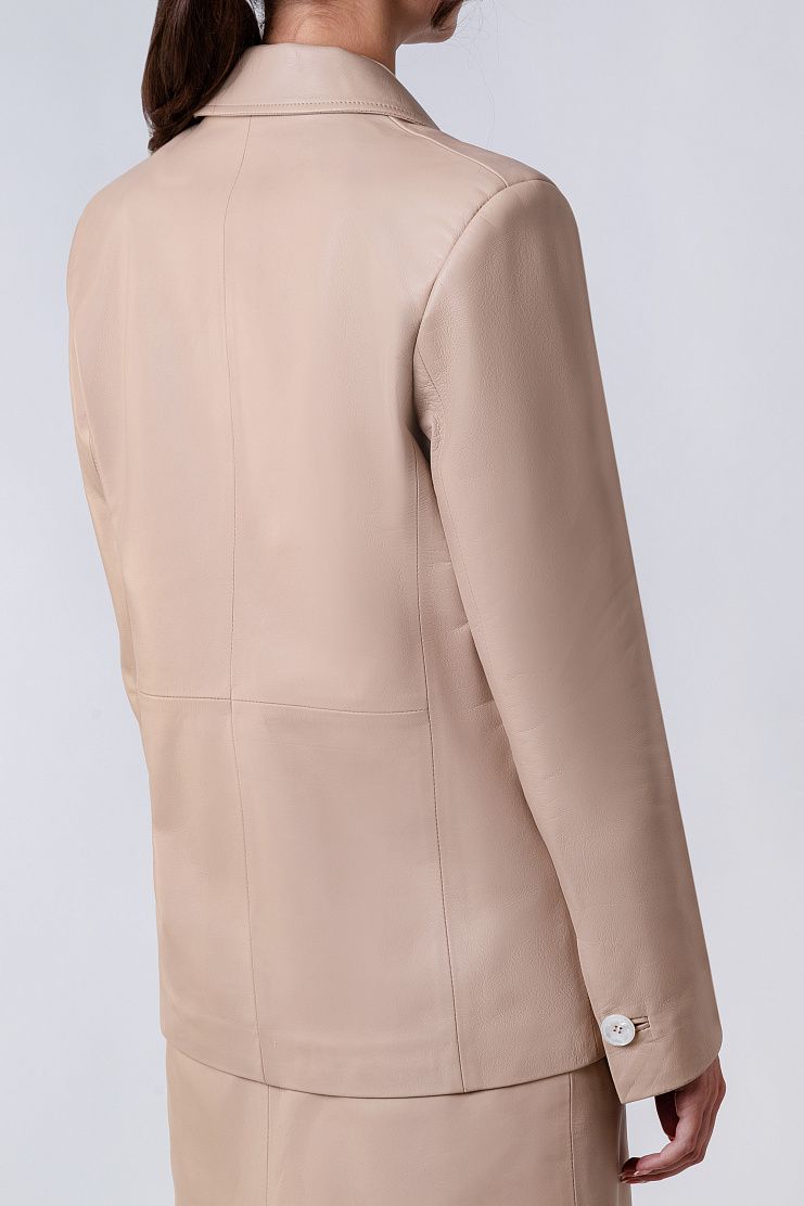 Однобортный пиджак из мягкой матовой кожи составит идеальный ансамбль с парной юбкой-карандашом. Модель с заостренными лацканами дополнена карманами и застегивается на пуговицу.