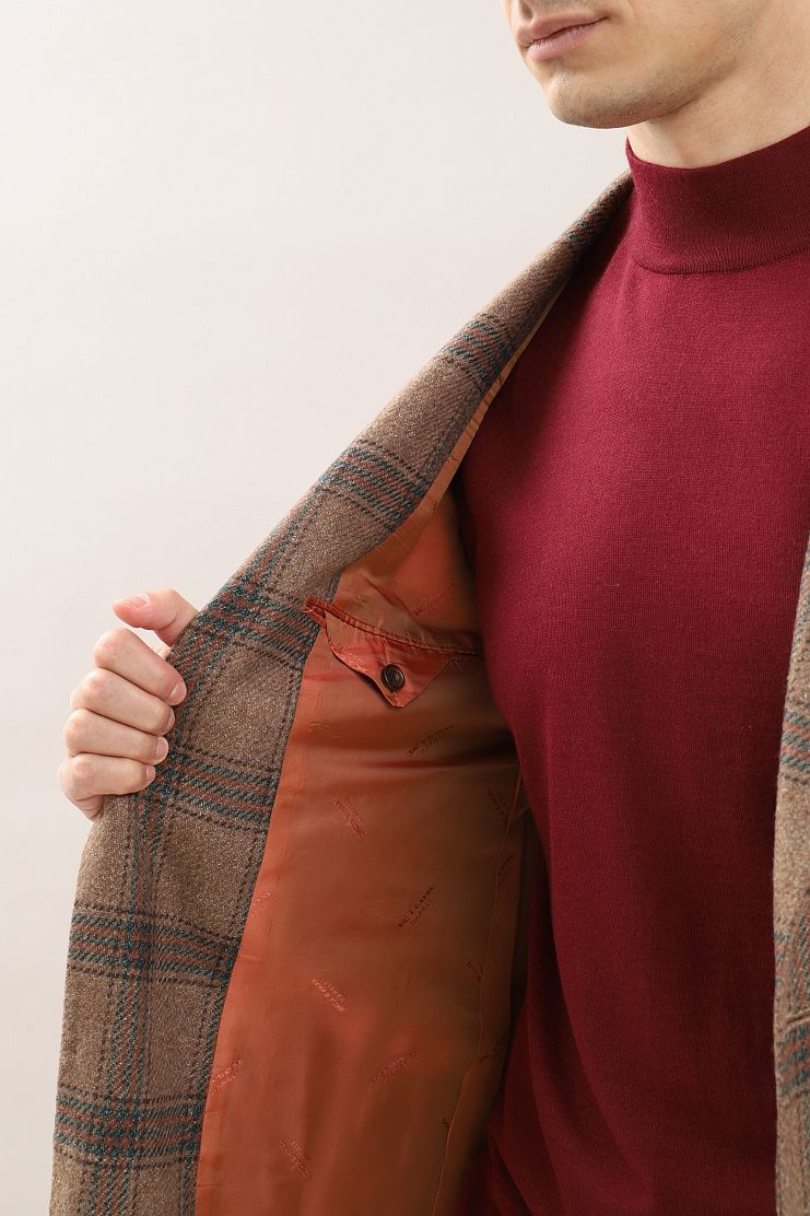 Пиджак в клетку из фактурной ткани идеально подойдет для непринужденного элегантного образа. Приталенная модель на полуподкладке дополнена белым нагрудным платком с вышивкой.