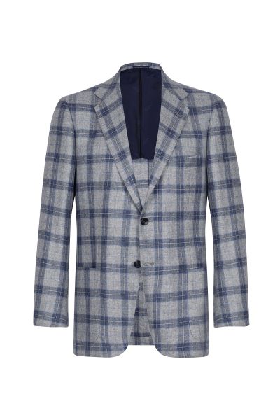Пиджак в клетку выполнен из кашемира с добавлением шерсти викуньи и шелка. Приталенная модель на подкладке с накладными боковыми карманами и нагрудным платком.