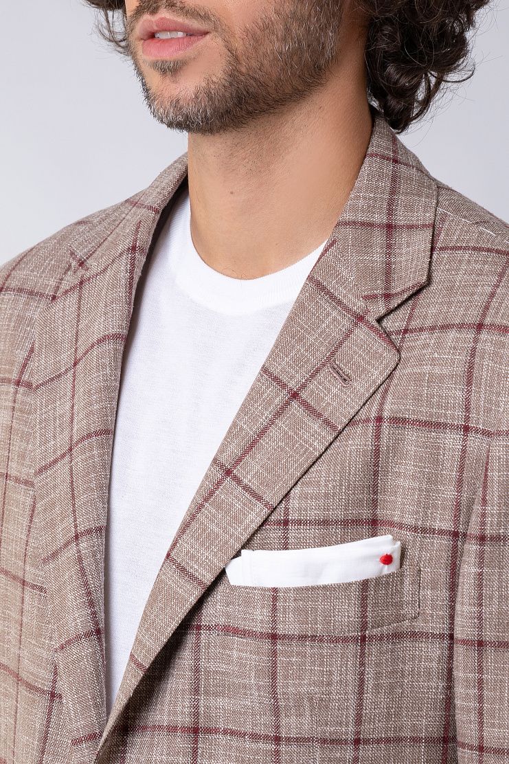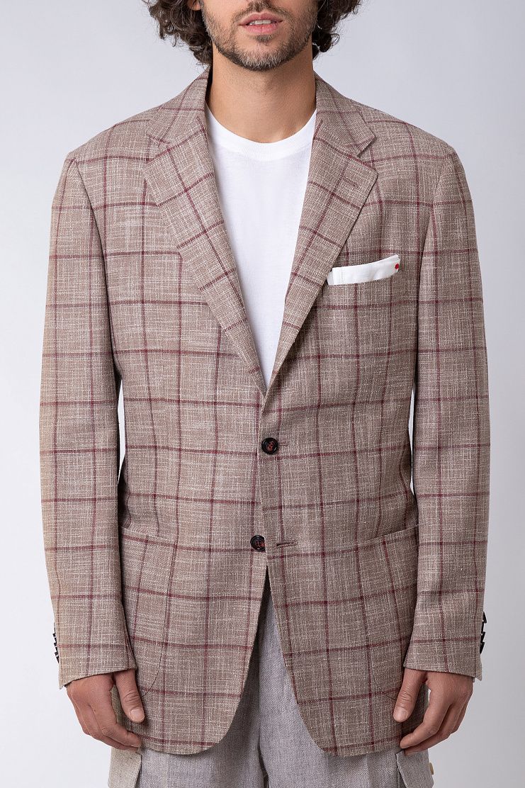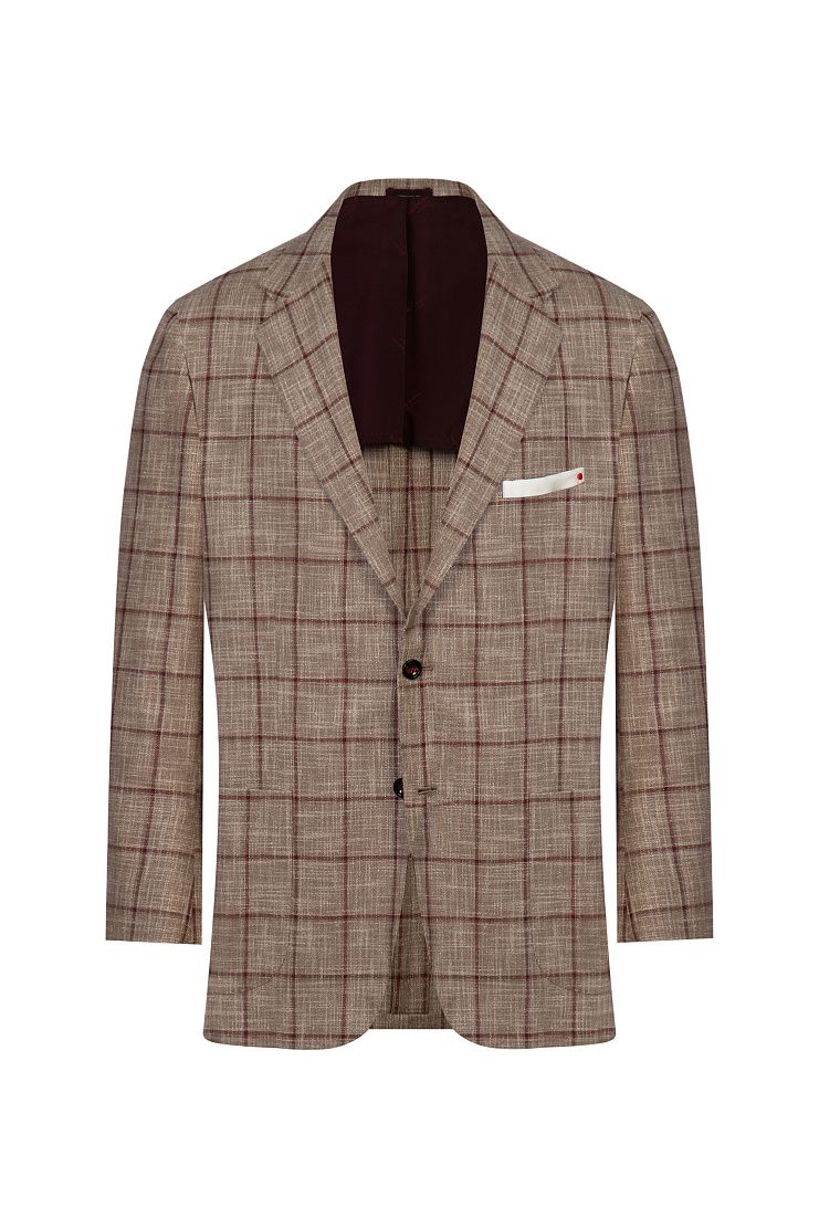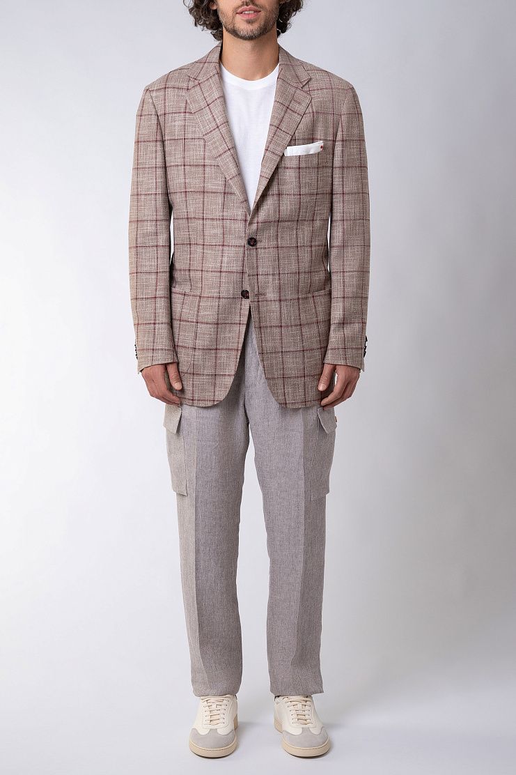 Однобортный пиджак в клетку сшили из микса шерсти, шелка и хлопка. Модель с прямоугольными лацканами и полуподкладом застегивается на роговые пуговицы. В нагрудном кармане — носовой платок с вышитой точкой фирменного алого оттенка.