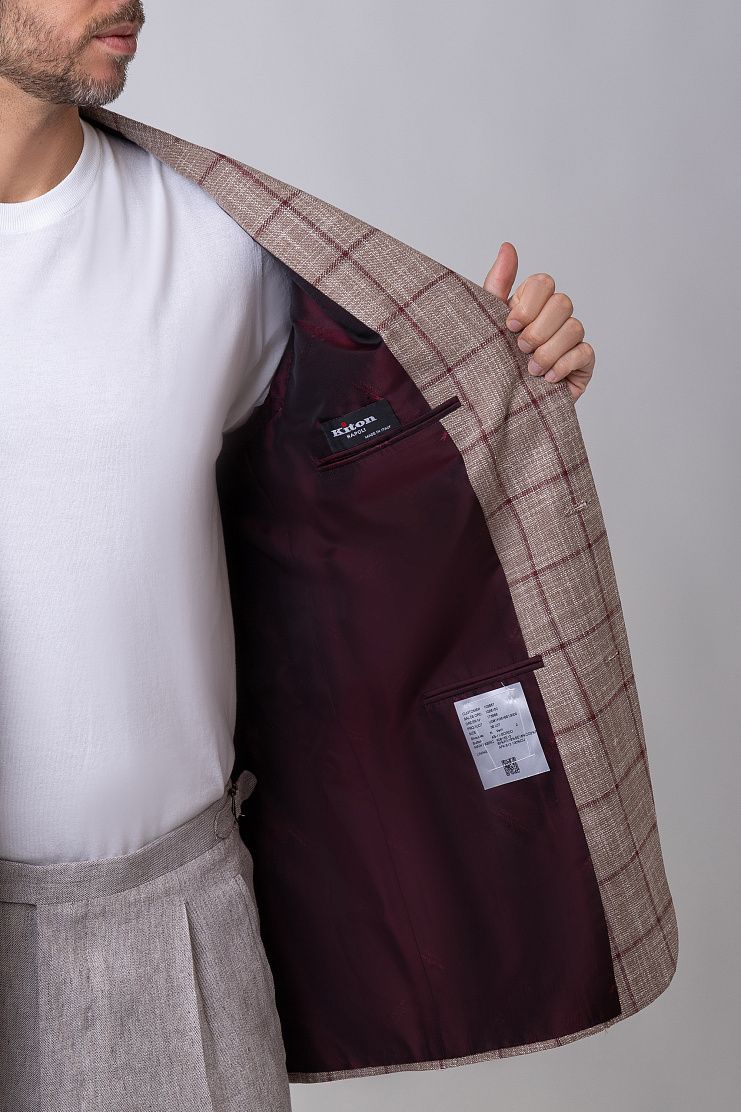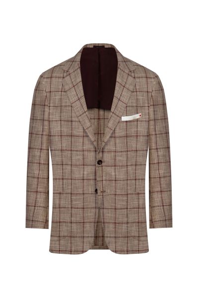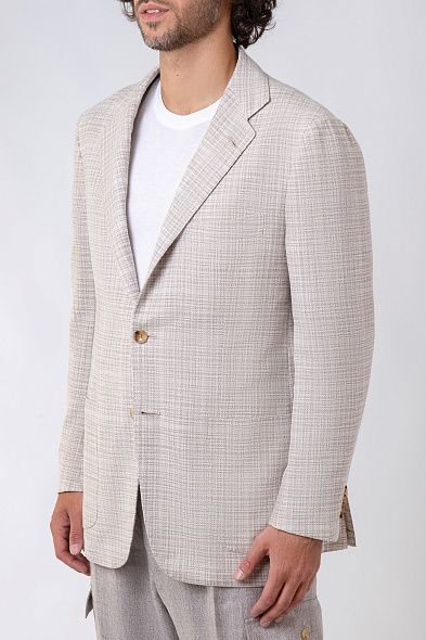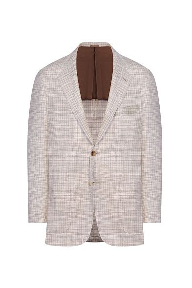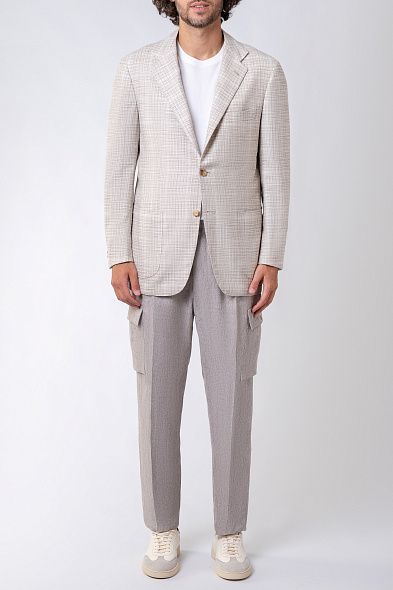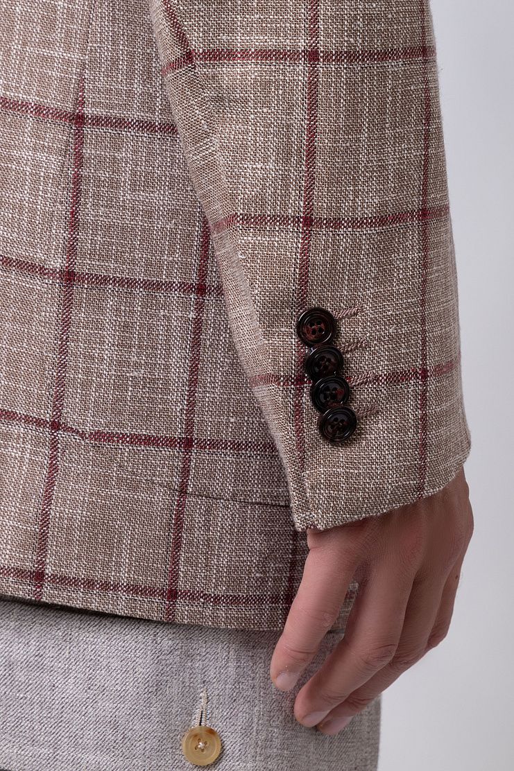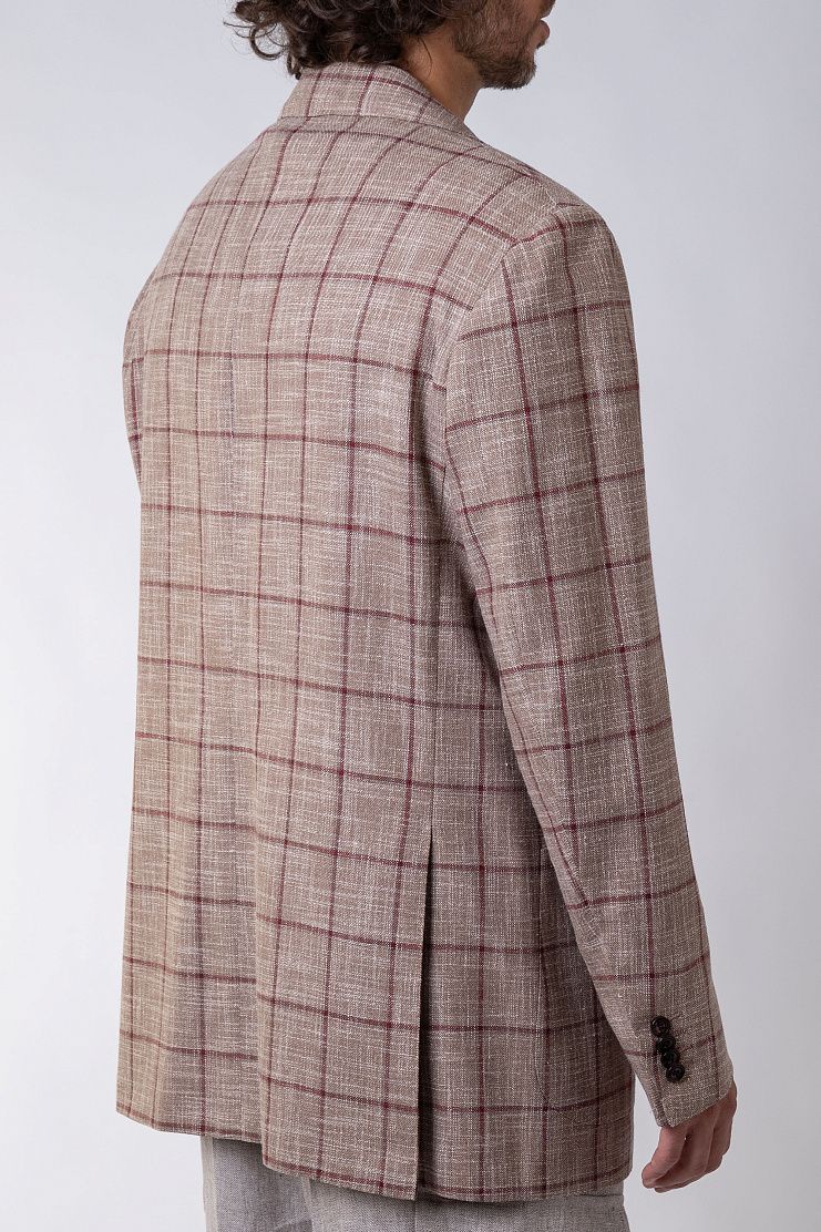 Однобортный пиджак в клетку сшили из микса шерсти, шелка и хлопка. Модель с прямоугольными лацканами и полуподкладом застегивается на роговые пуговицы. В нагрудном кармане — носовой платок с вышитой точкой фирменного алого оттенка.