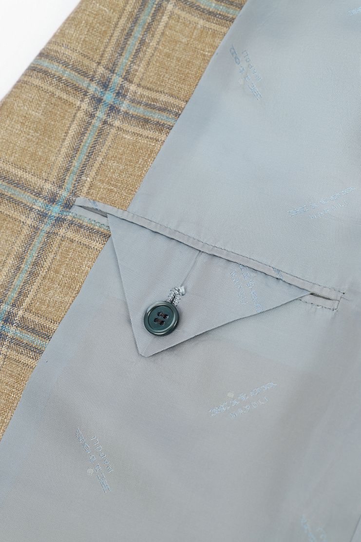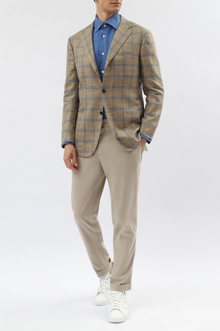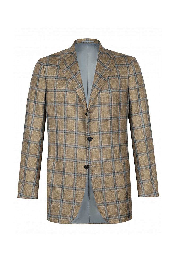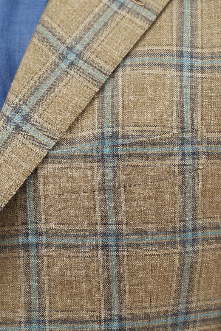 Пиджак серо-коричневого цвета в синюю клетку выполнен из фактурной кашемировой ткани с добавлением шелка и льна. Слегка приталенная модель на подкладке с накладными боковыми карманами.
