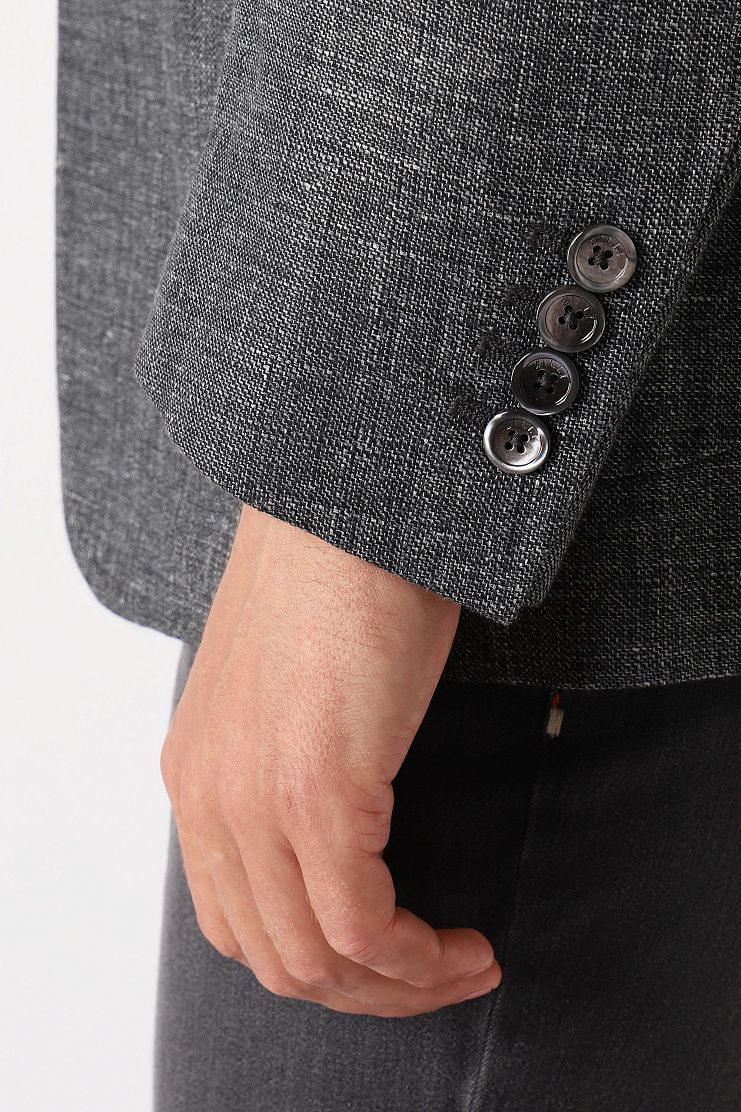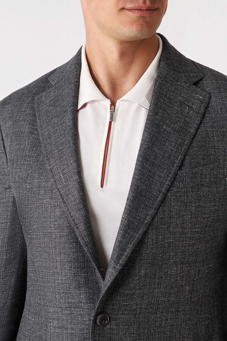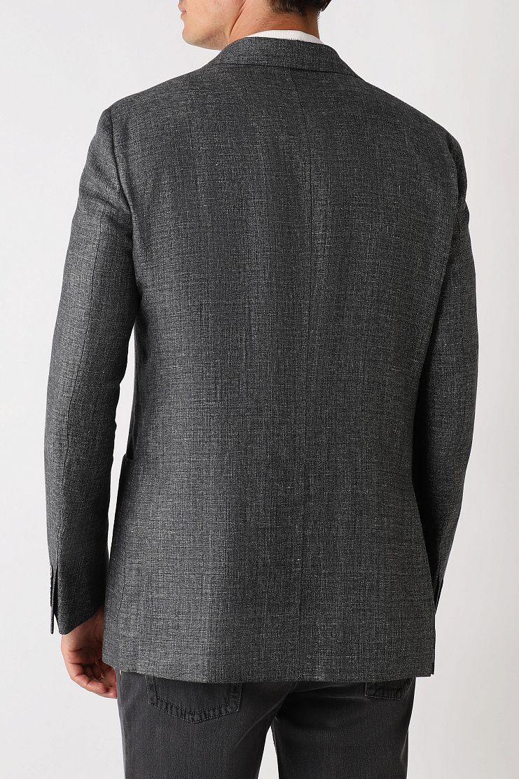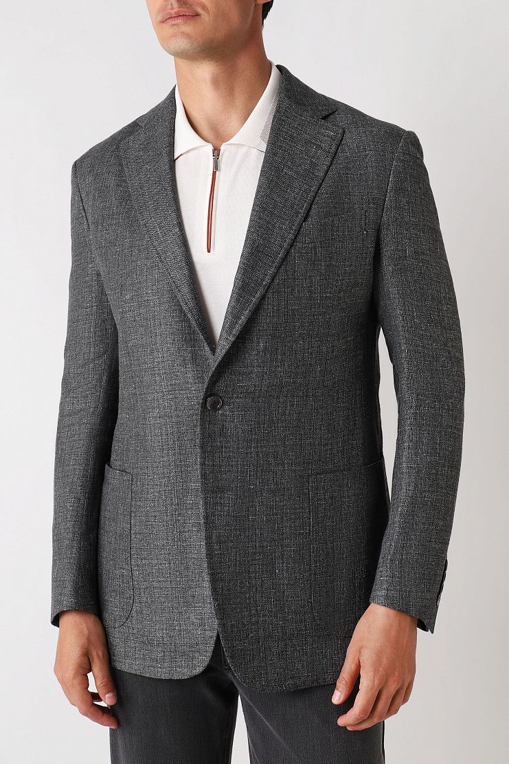 Пиджак выполнен из шерсти и дышащего льна. Такой материал почти не мнется и гарантирует комфортную регуляцию температуры. Пуговицы с перламутровым блеском дополнены фирменным логотипом. Сочетайте пиджак с брюками в тон для создания комплекта.