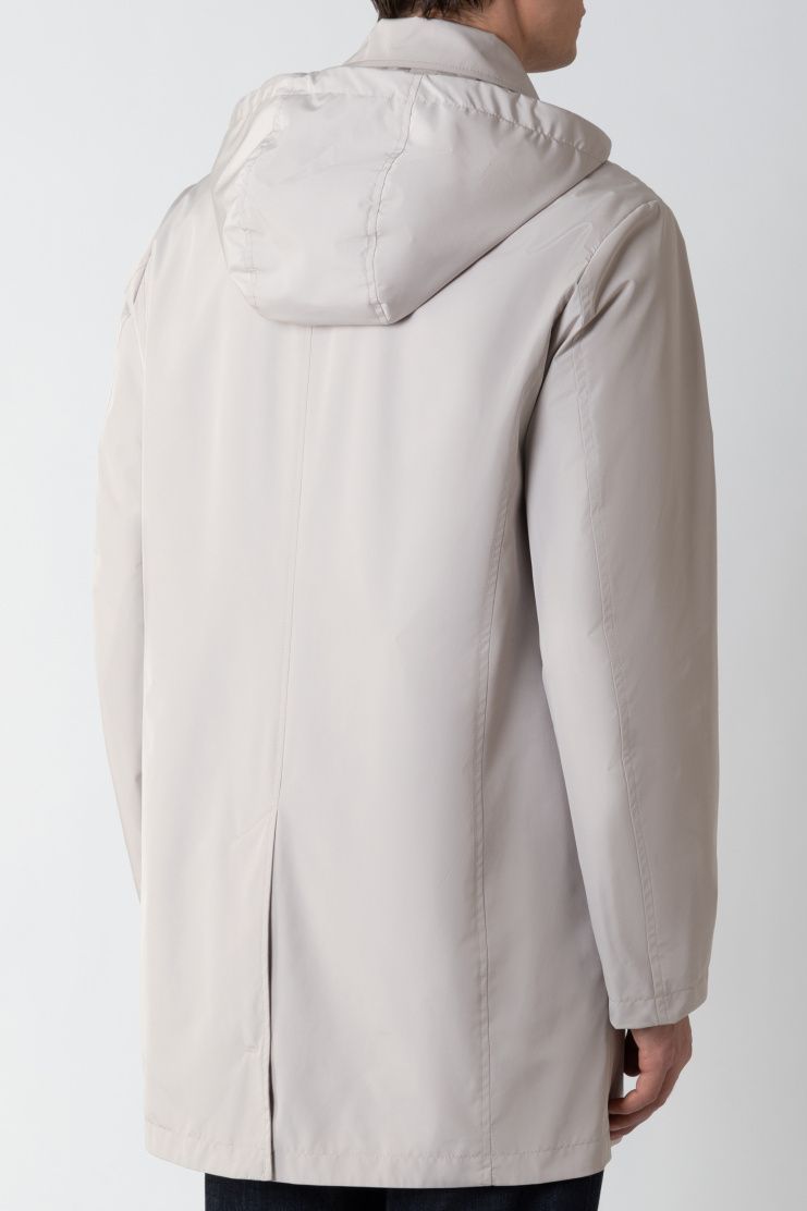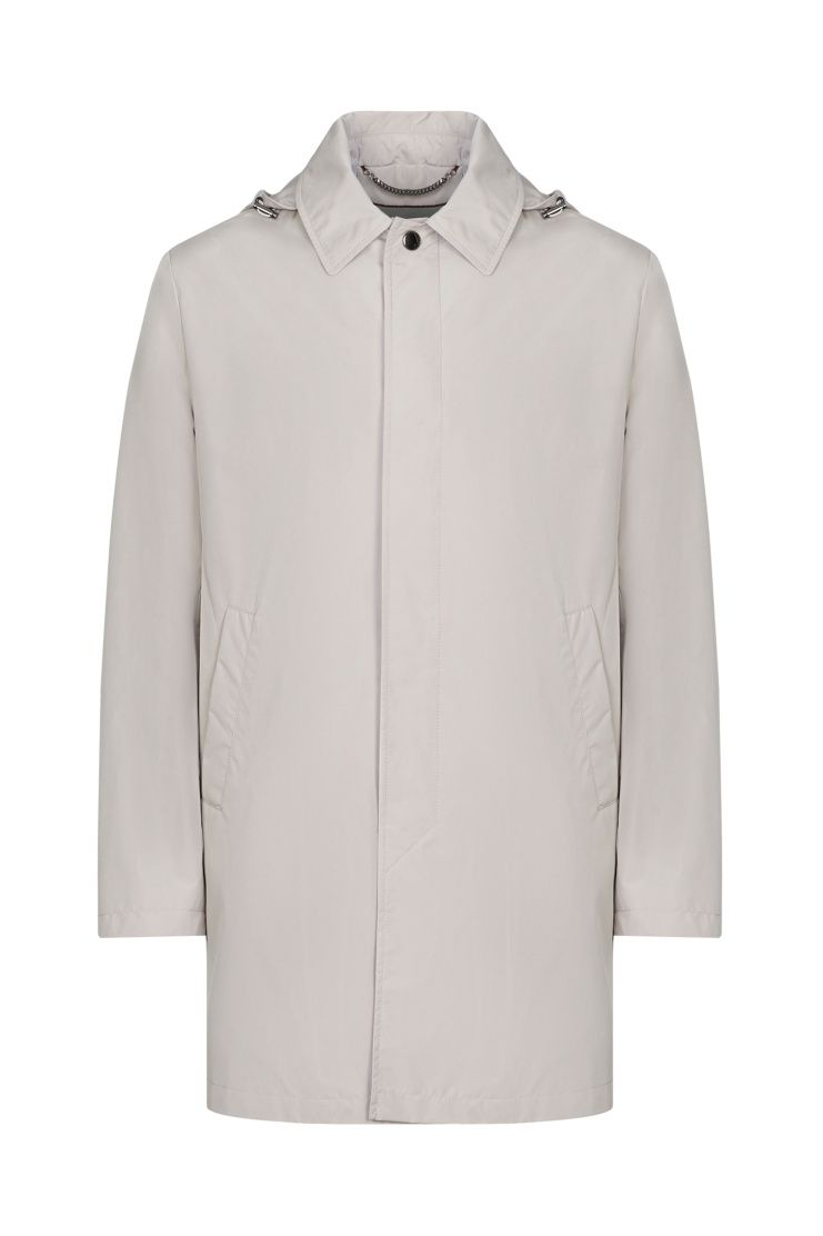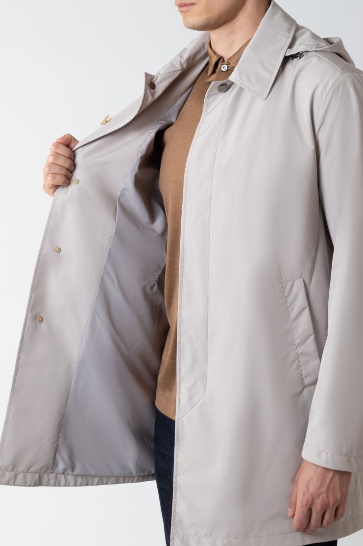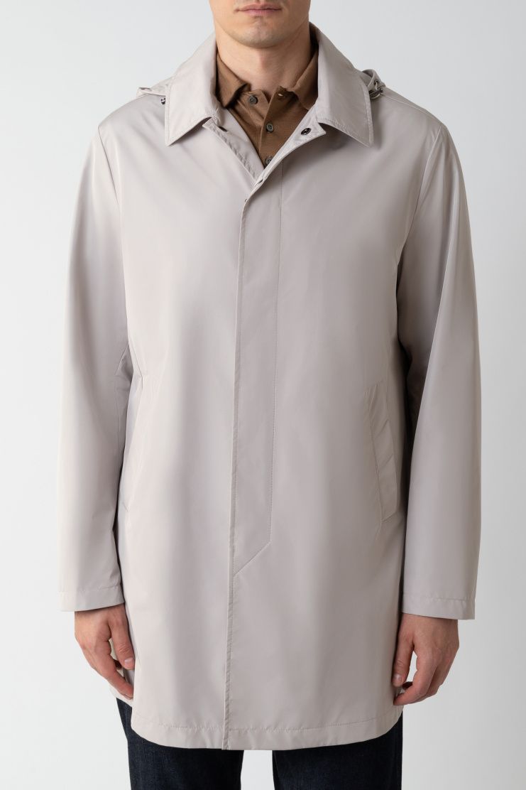 Короткий плащ с высокой шлицей из гладкого полиэстера идеально завершит и повседневный, и более строгий образ. Модель дополнена съемным капюшоном на кулиске и прорезными карманами. Застегивается на скрытые под планкой пуговицы.
