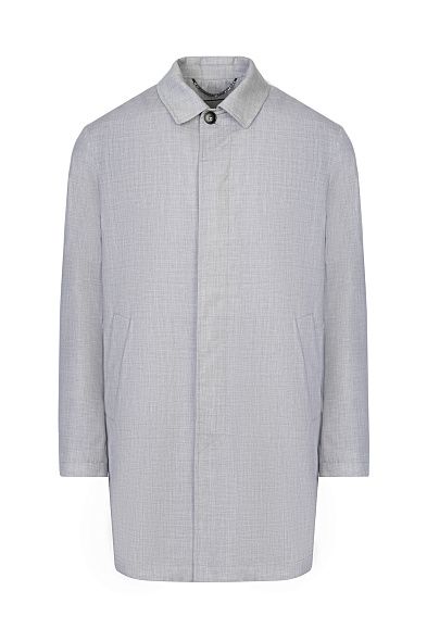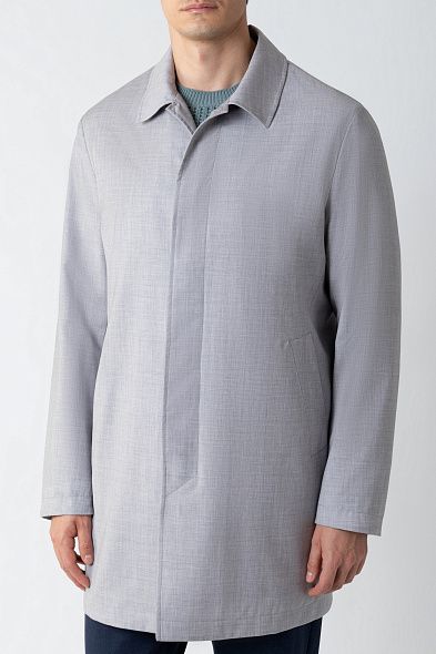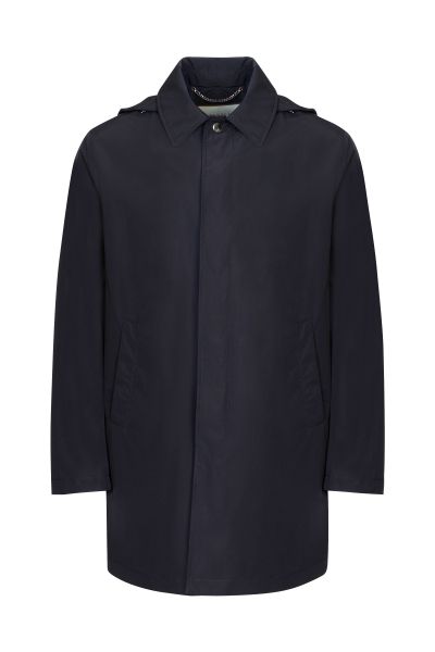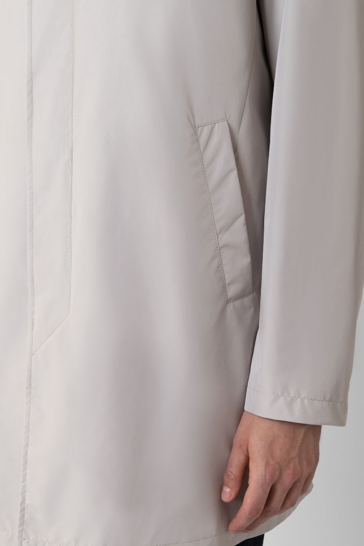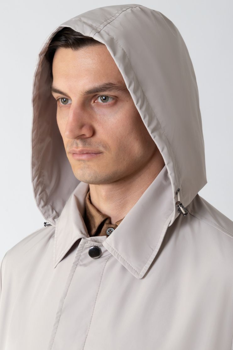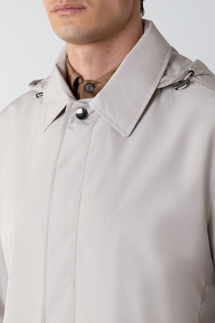 Короткий плащ с высокой шлицей из гладкого полиэстера идеально завершит и повседневный, и более строгий образ. Модель дополнена съемным капюшоном на кулиске и прорезными карманами. Застегивается на скрытые под планкой пуговицы.