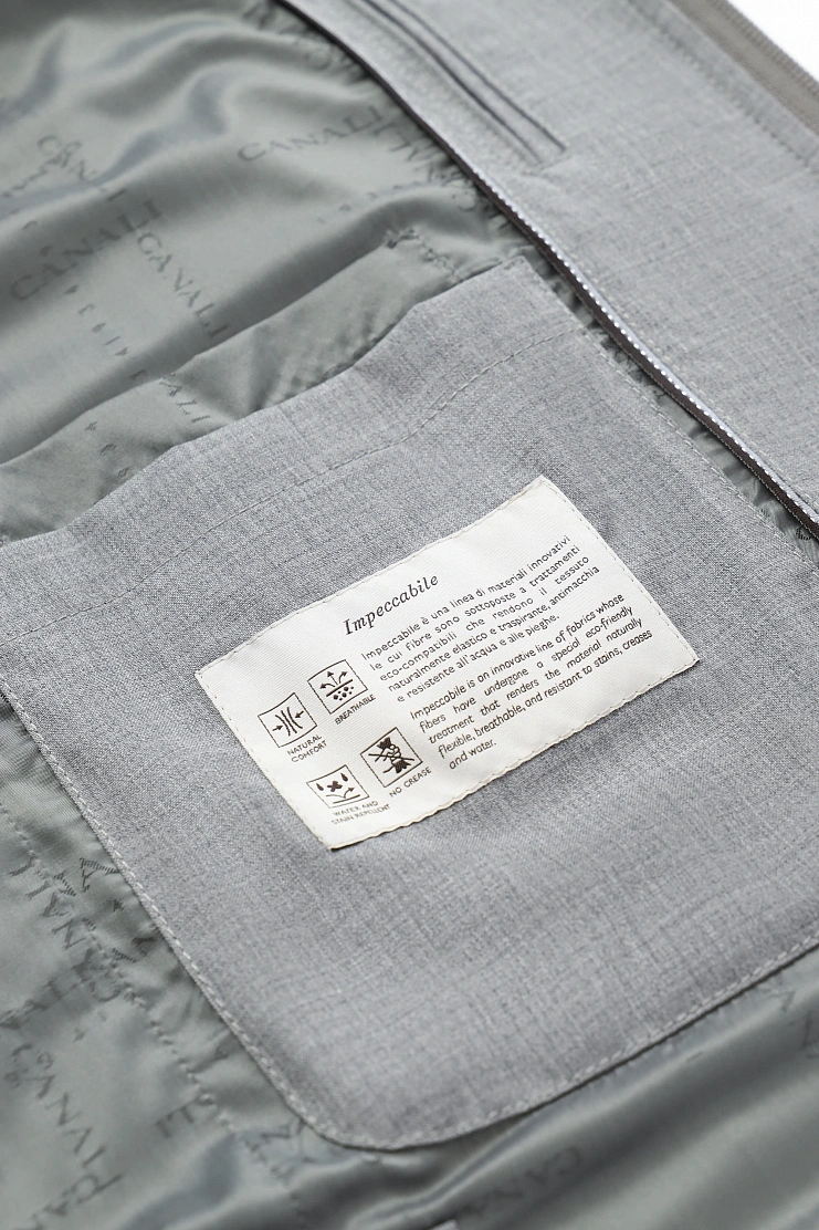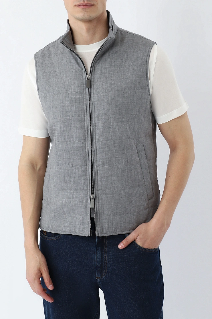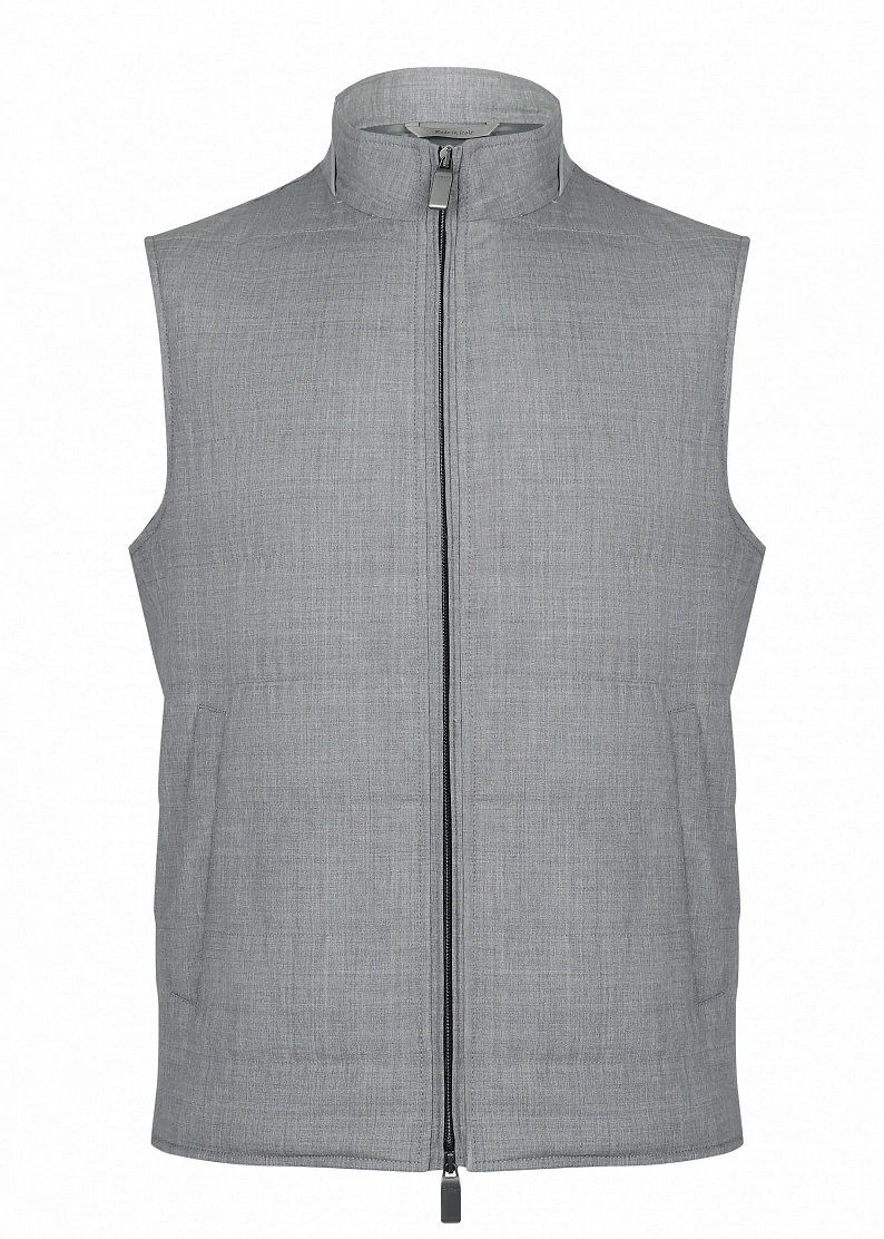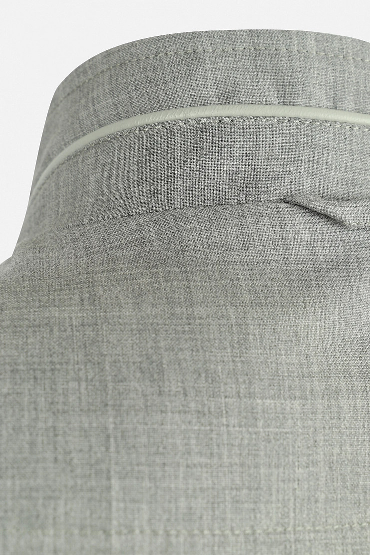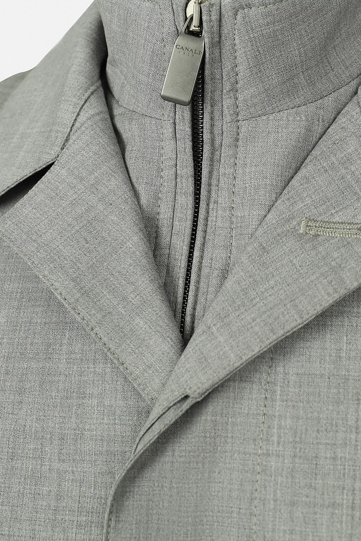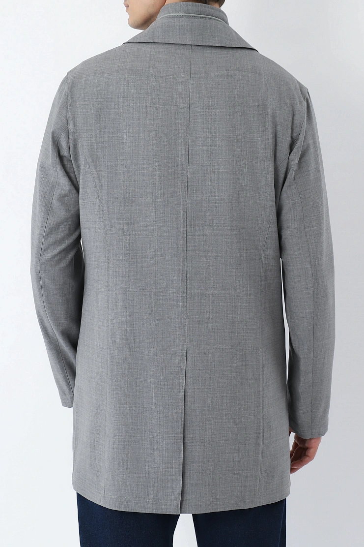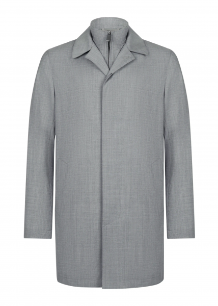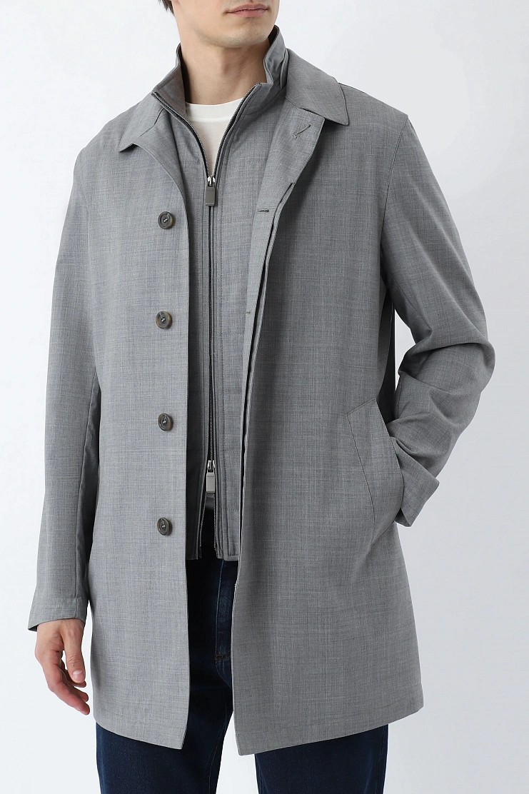 Плащ из меланжевой ткани имеет отложный воротник, наклонные боковые карманы и скрытую застежку на пуговицы. Модель выполнена со съемной стеганой жилеткой на молнии, которую можно носить как самостоятельный предмет одежды.