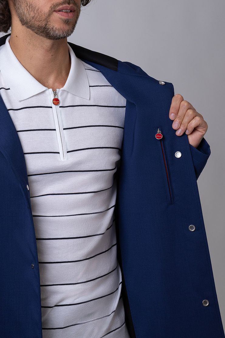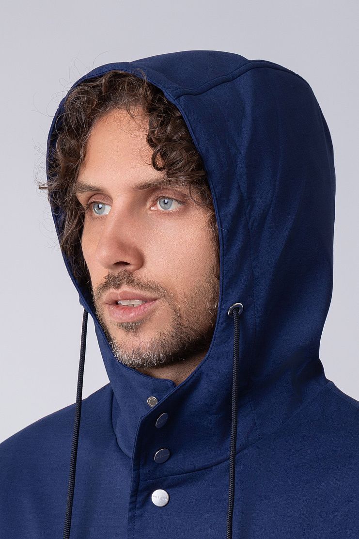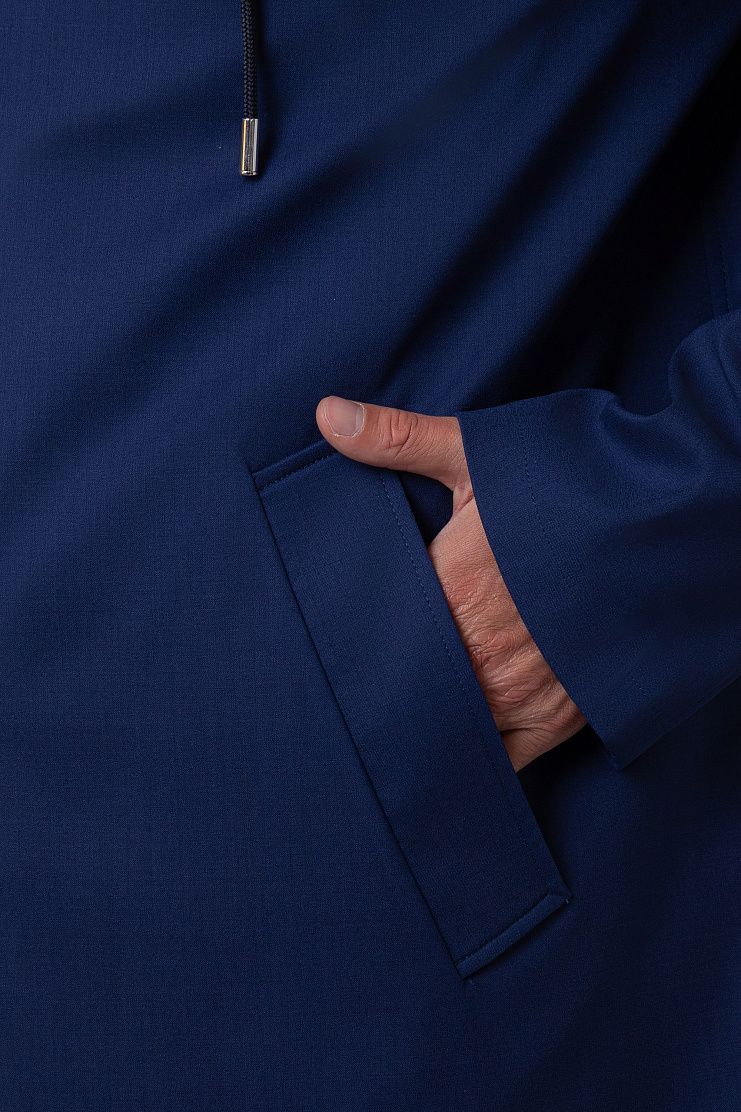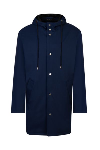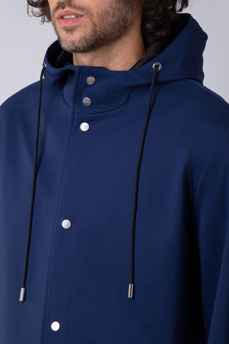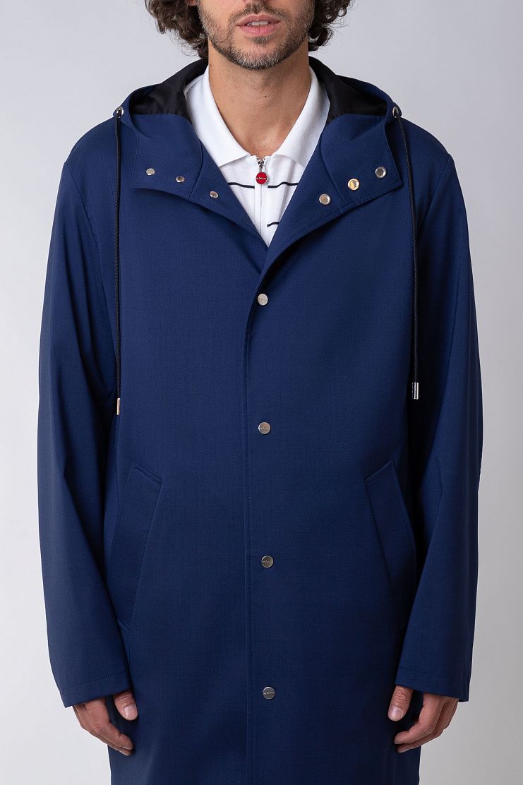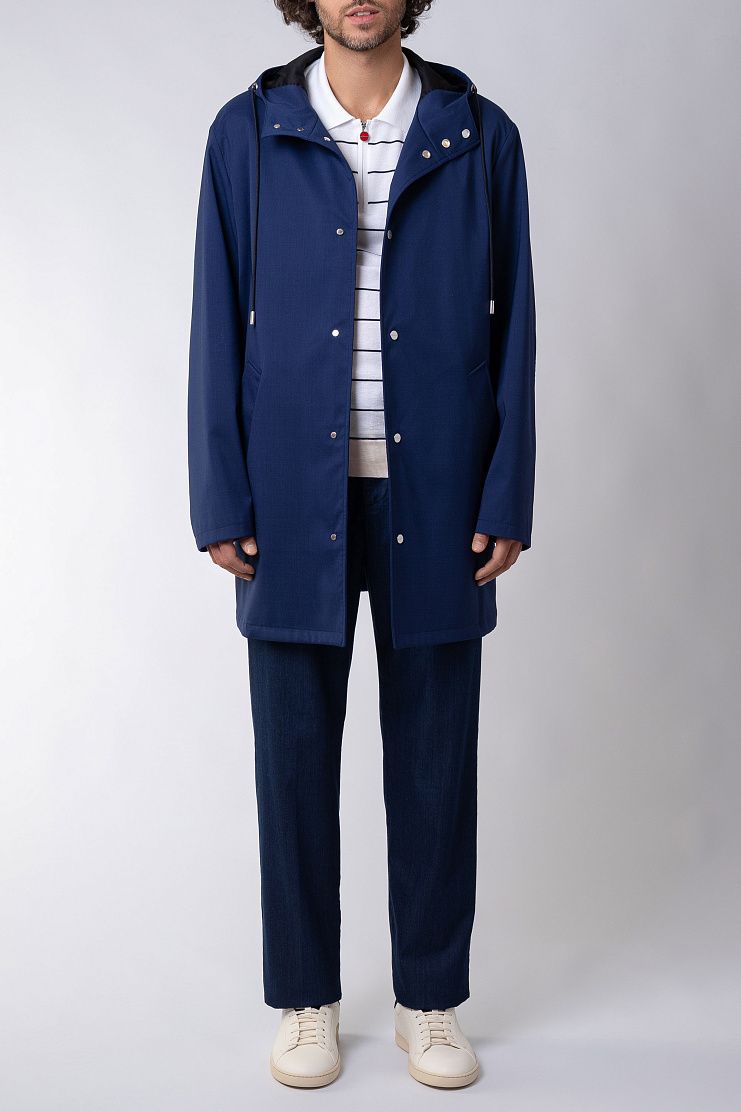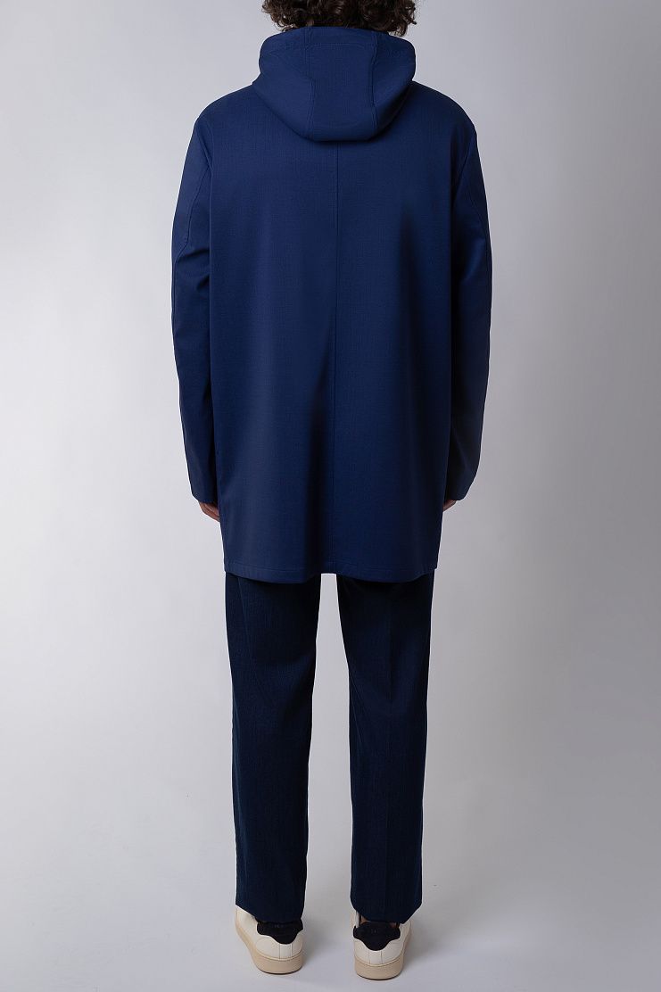 Для пошива плаща с капюшоном на кулиске использовали тонкую шерсть. Модель с воротником-стойкой дополнена внутренним карманом на молнии и двумя внешними прорезными карманами. Изделие прямого кроя застегивается на металлические кнопки.