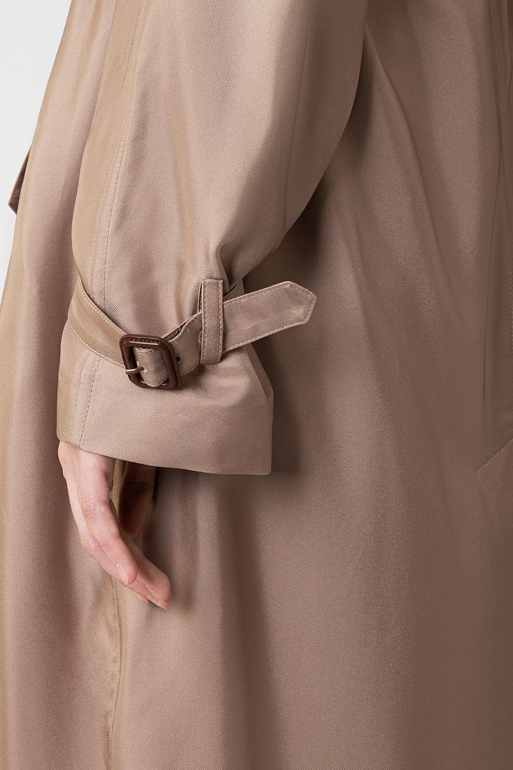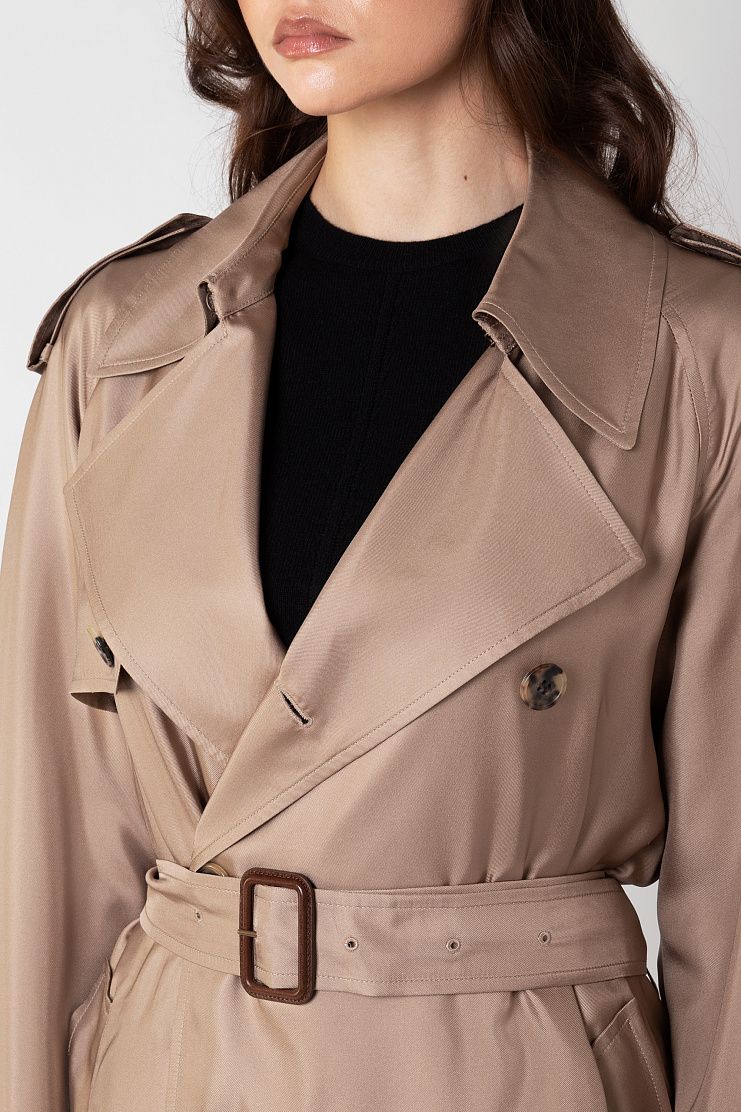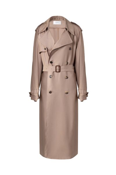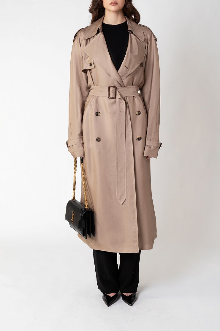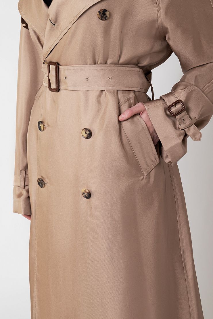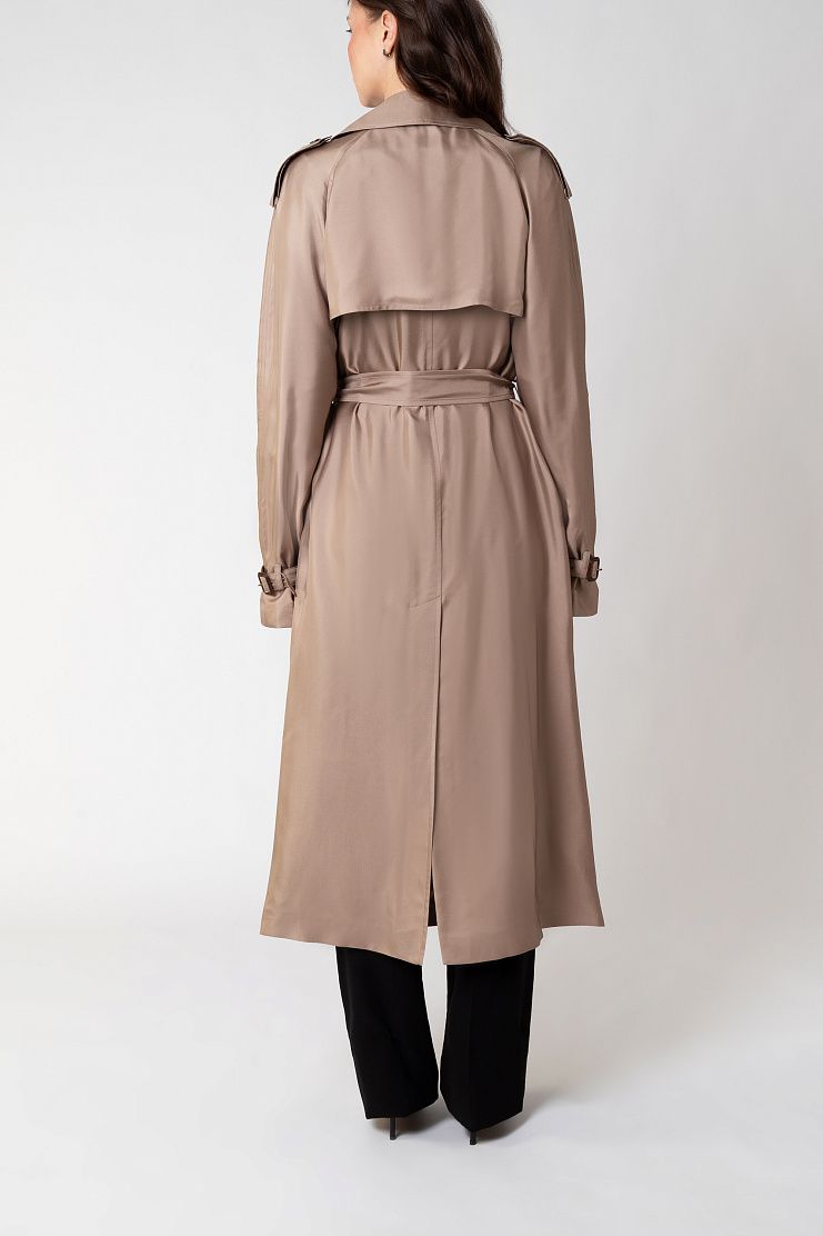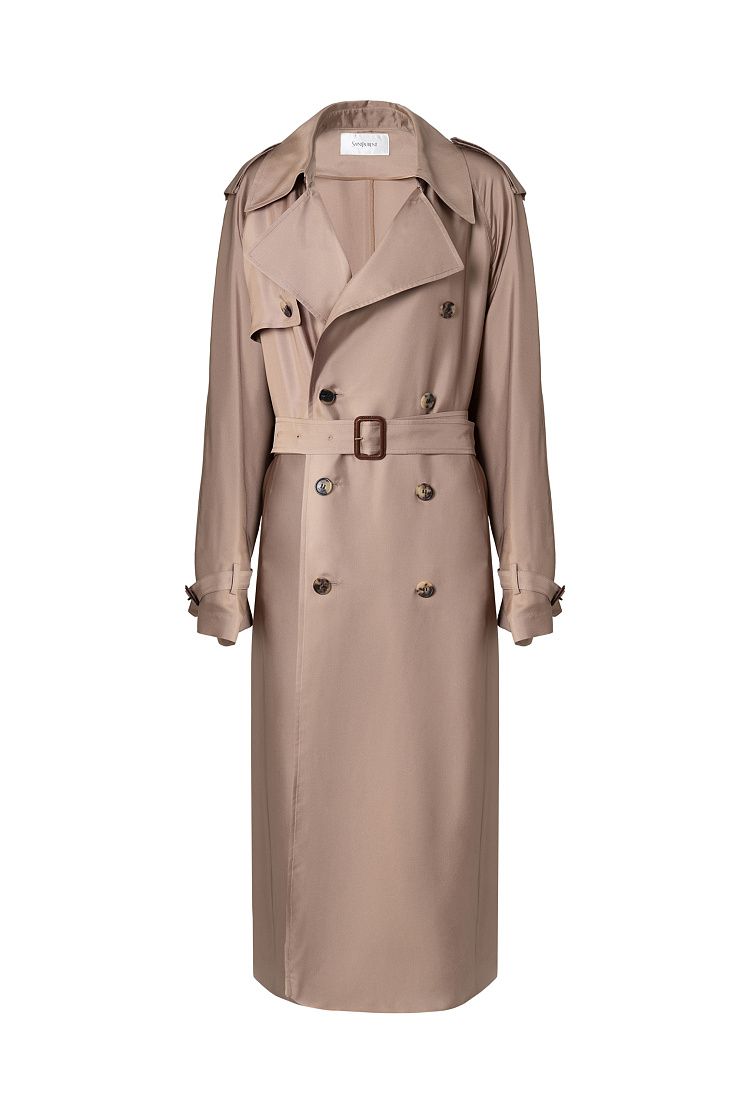 Двубортный плащ выполнен из мягкого и блестящего шелка. Модель дополнена традиционными для тренча элементами: широкими лацканами, эполетами, отлетной кокеткой и шлицей сзади. Рукава со спущенной линией плеч подчеркнуты патами, а талия — поясом с пряжкой.