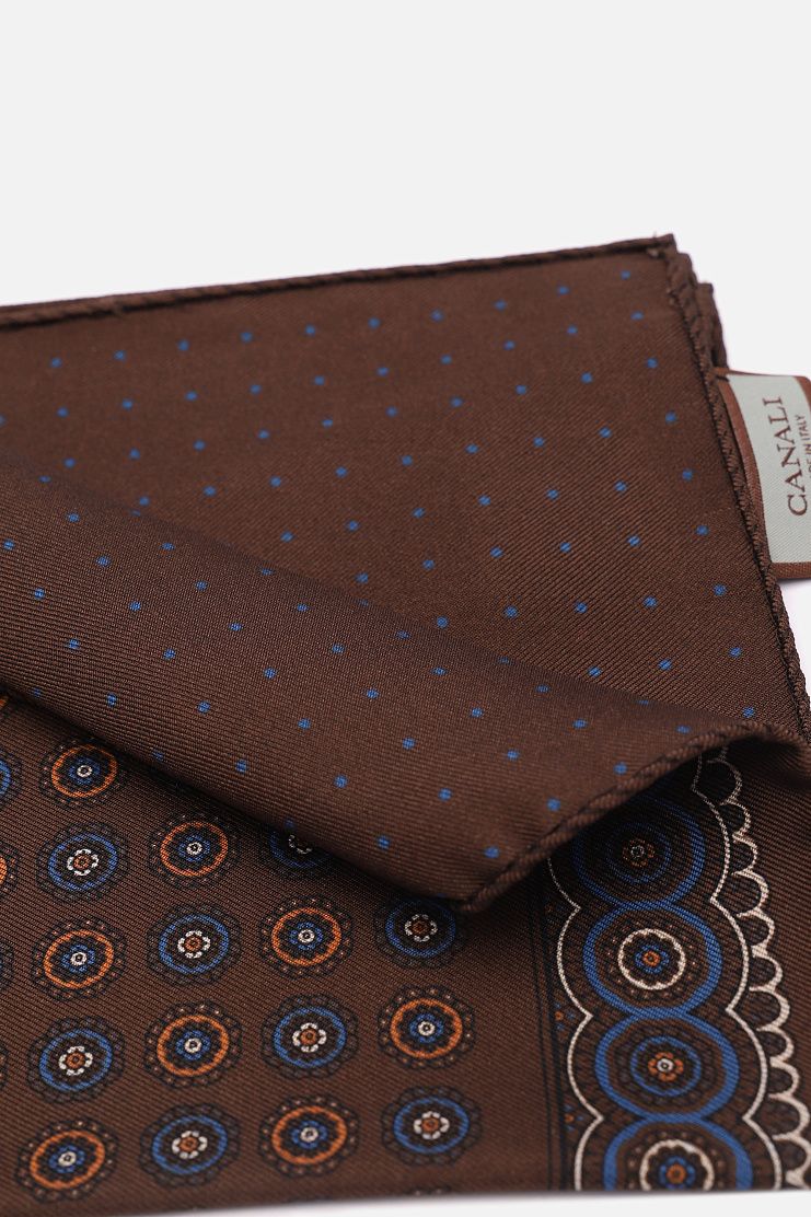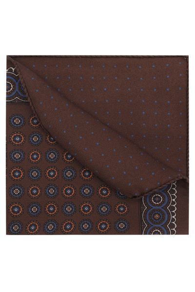 Квадратный нагрудный платок выполнили из гладкого шелка, украсив графичным принтом с одной стороны и в мелкий горошек с другой. Такой изысканный аксессуар выгодно подчеркнет деловой образ.