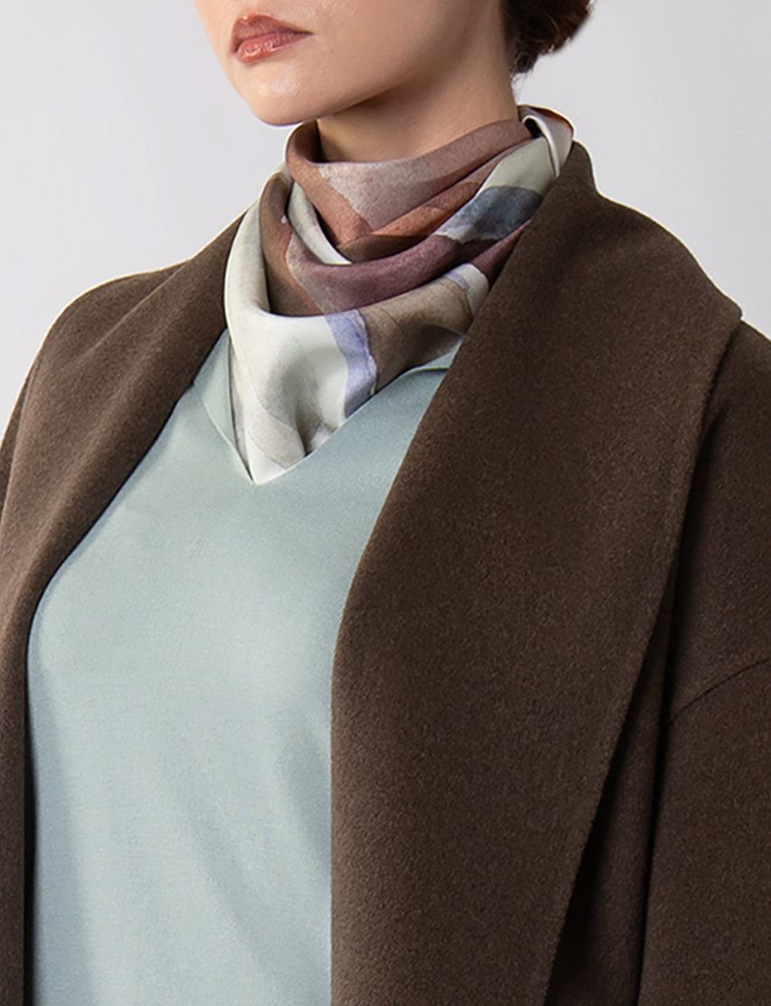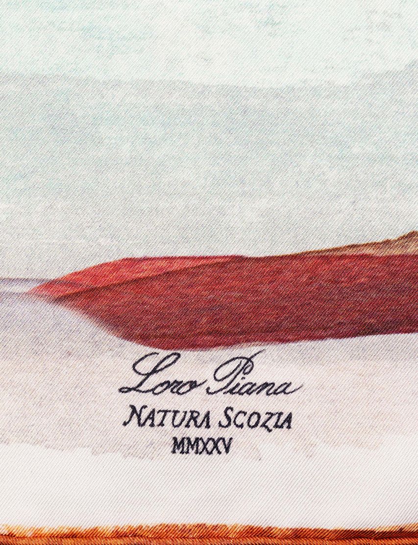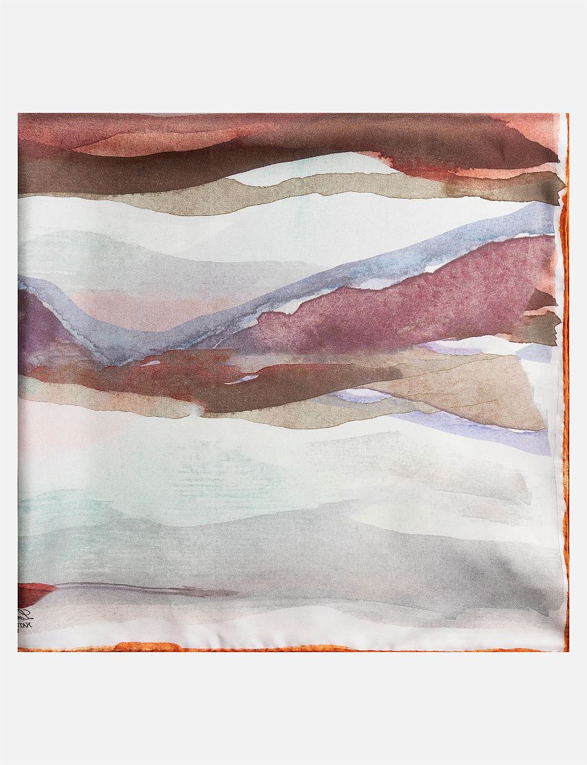 Квадратный платок с контрастным кантом выполнили из гладкого шелкового твила. Аксессуар украшен нежным акварельным принтом с природным пейзажем Шотландии. Миниатюрный логотип марки подчеркивает принадлежность к бренду.