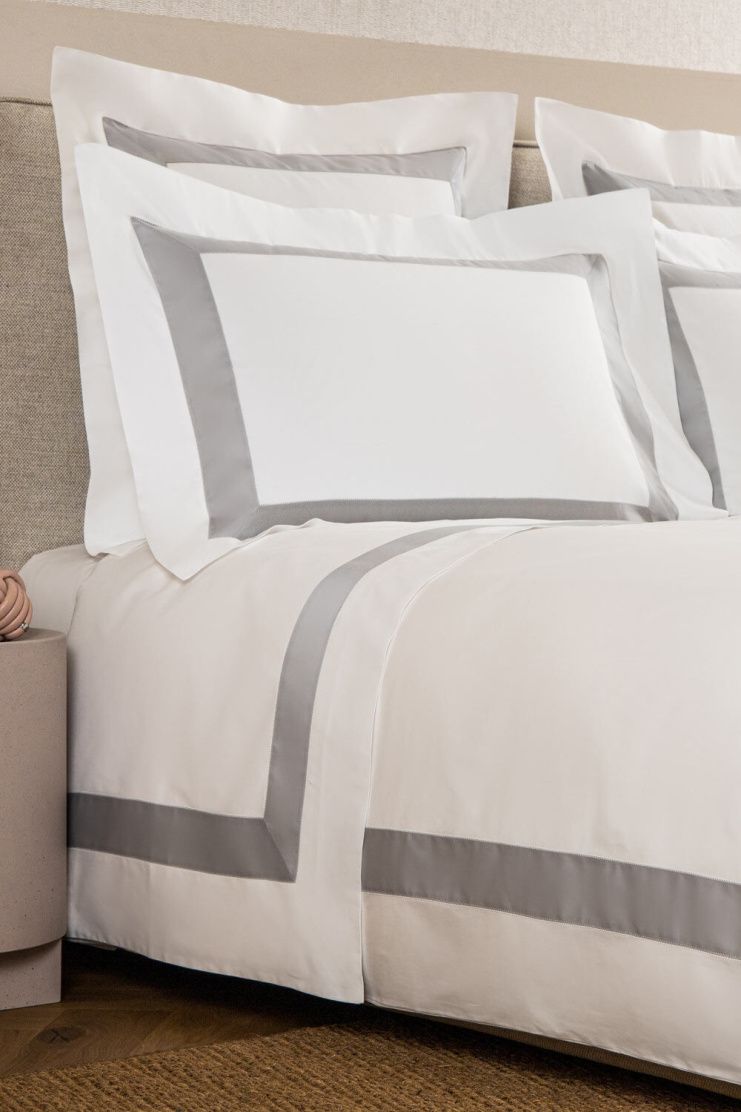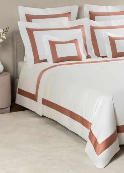 Белый пододеяльник Bicolore с контрастной каймой ярко-персикового цвета, отделанной фирменной открытой строчкой Frette, идеально подойдет для классической спальни. Изделие выполнено из мягкого хлопка.